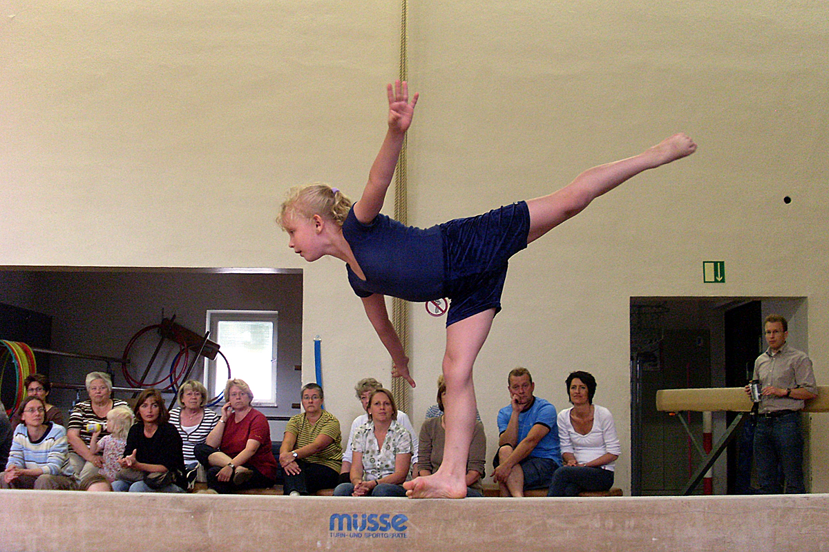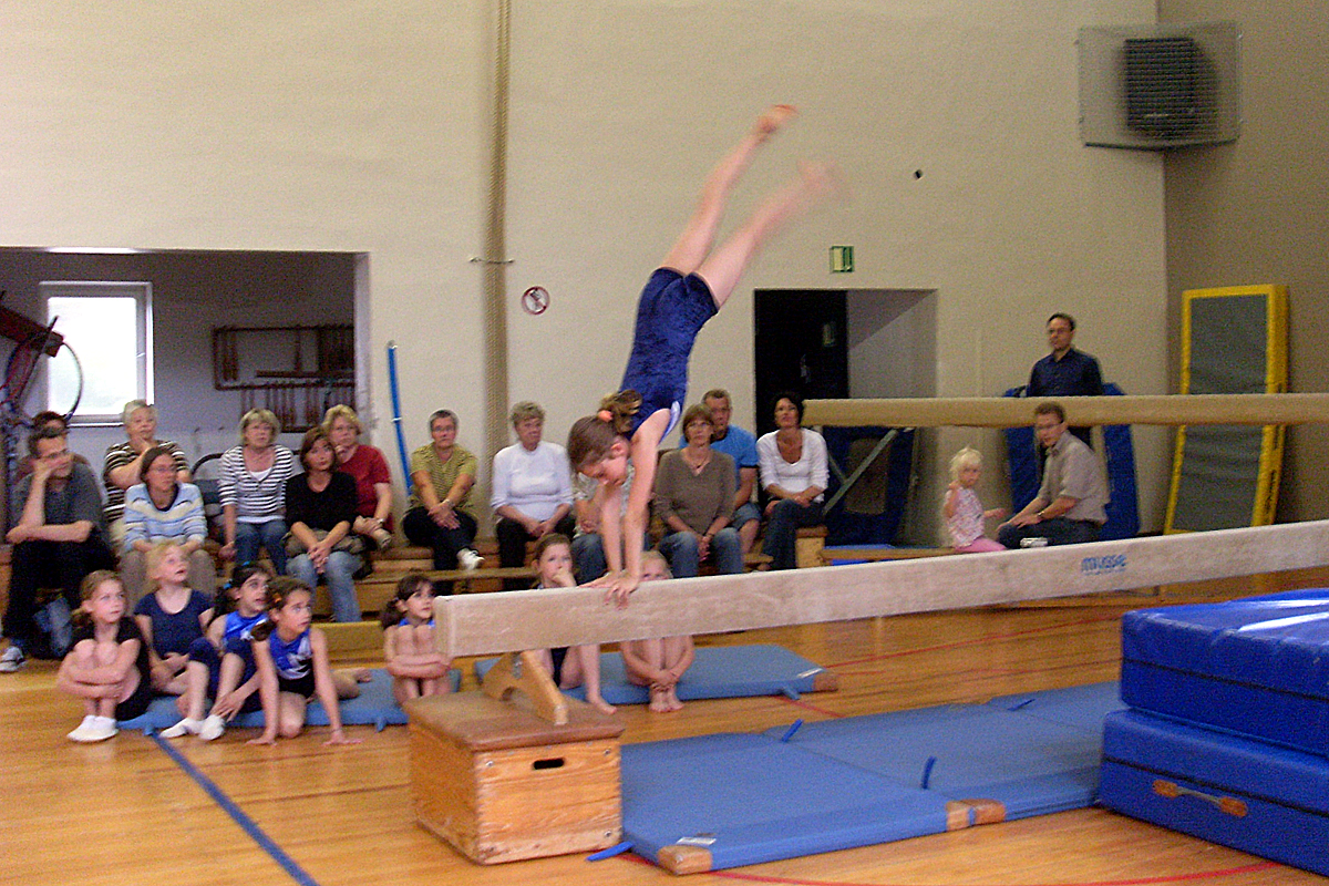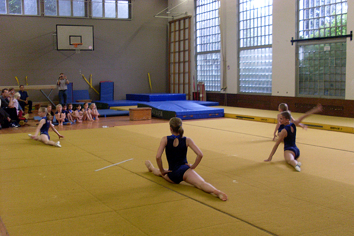 An einem der letzten Trainingstage fand in der Halle Josefstraße eine kleine Abschlussfeier statt. Eingeladen waren Eltern, Großeltern, Geschwister, Verwandte und Freunde der Turnerinnen. Um 18 Uhr ging es los. Nach einer kurzen Begrüßung und Vorstellung der Kinder zeigten die Mädchen den Zuschauern an verschiedenen Geräten ihre selbstüberlegten und selbstvorbereiteten Übungen. Die "Kleinen" brauchten bei der Vorbereitung noch ein wenig Hilfe von den Trainerinnen, die "Großen" dagegen arbeiteten ganz selbständig, bildeten kleine Gruppen und führten ihre Programme sehr souverän vor.