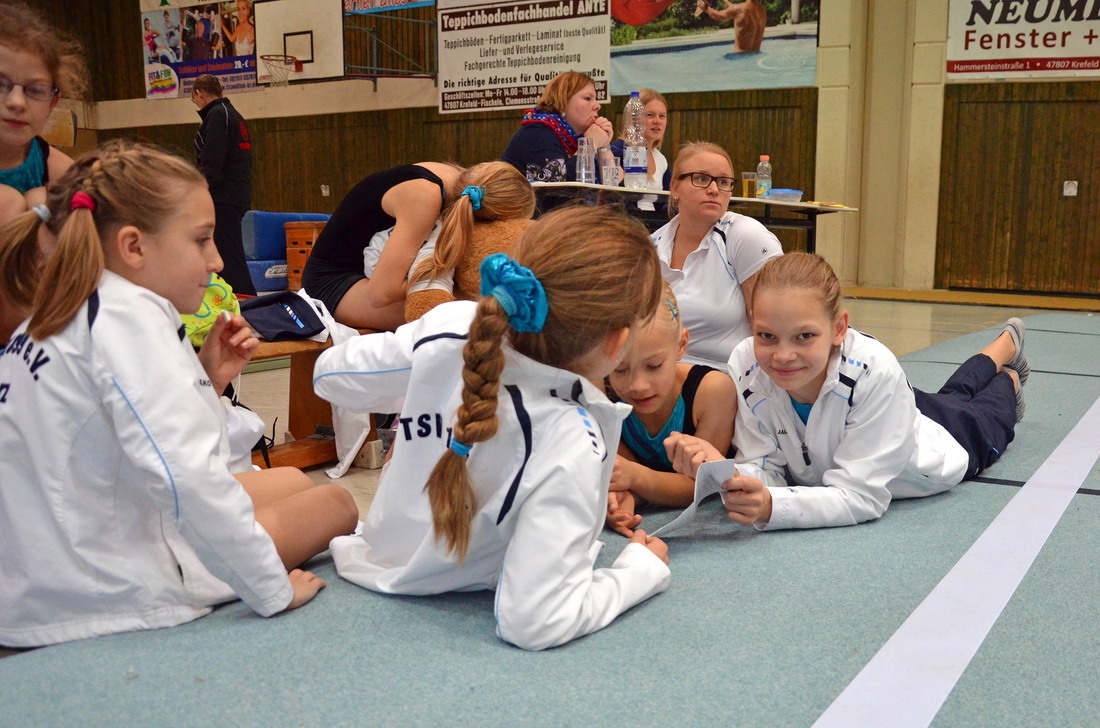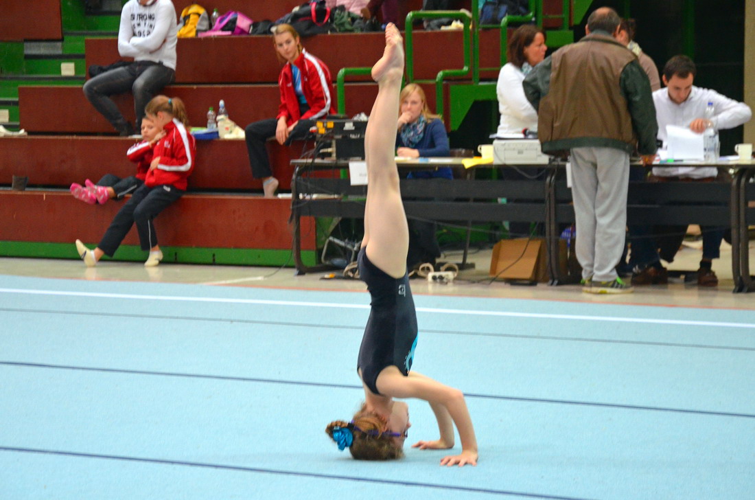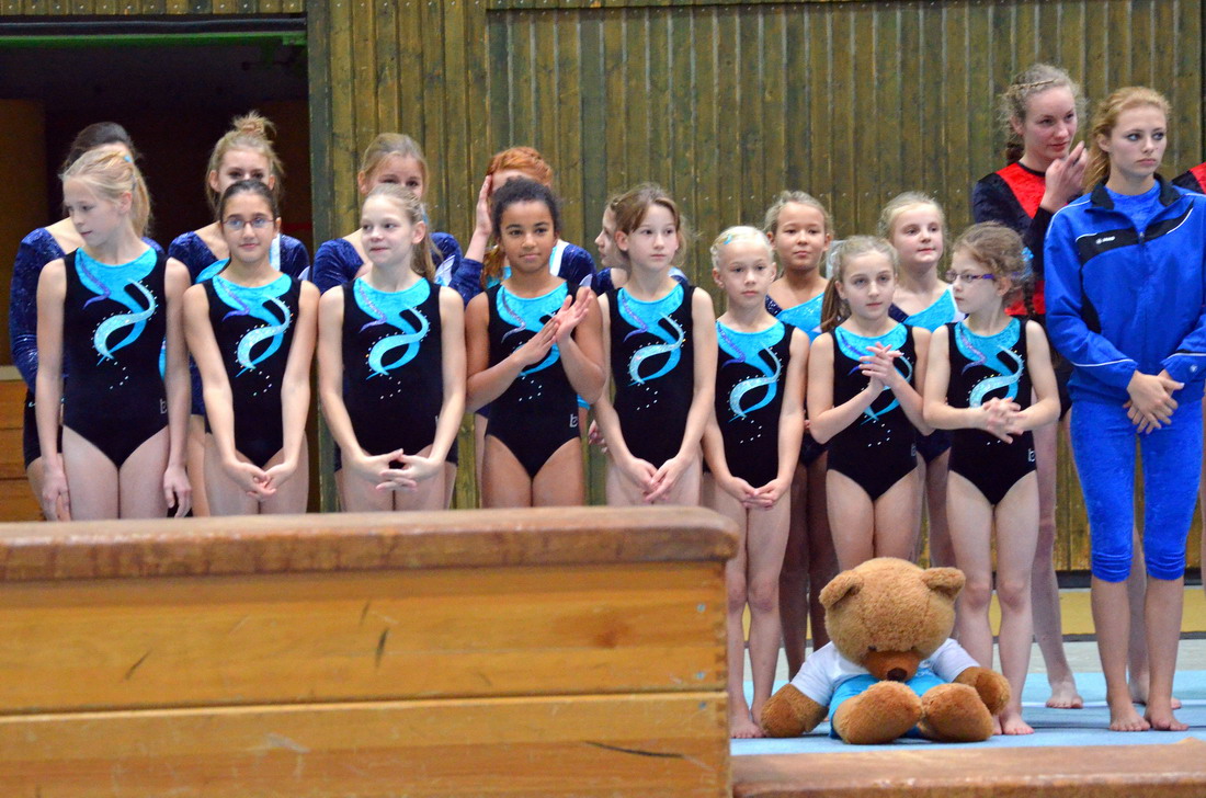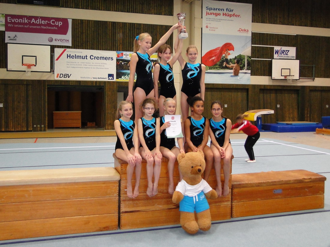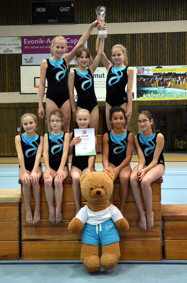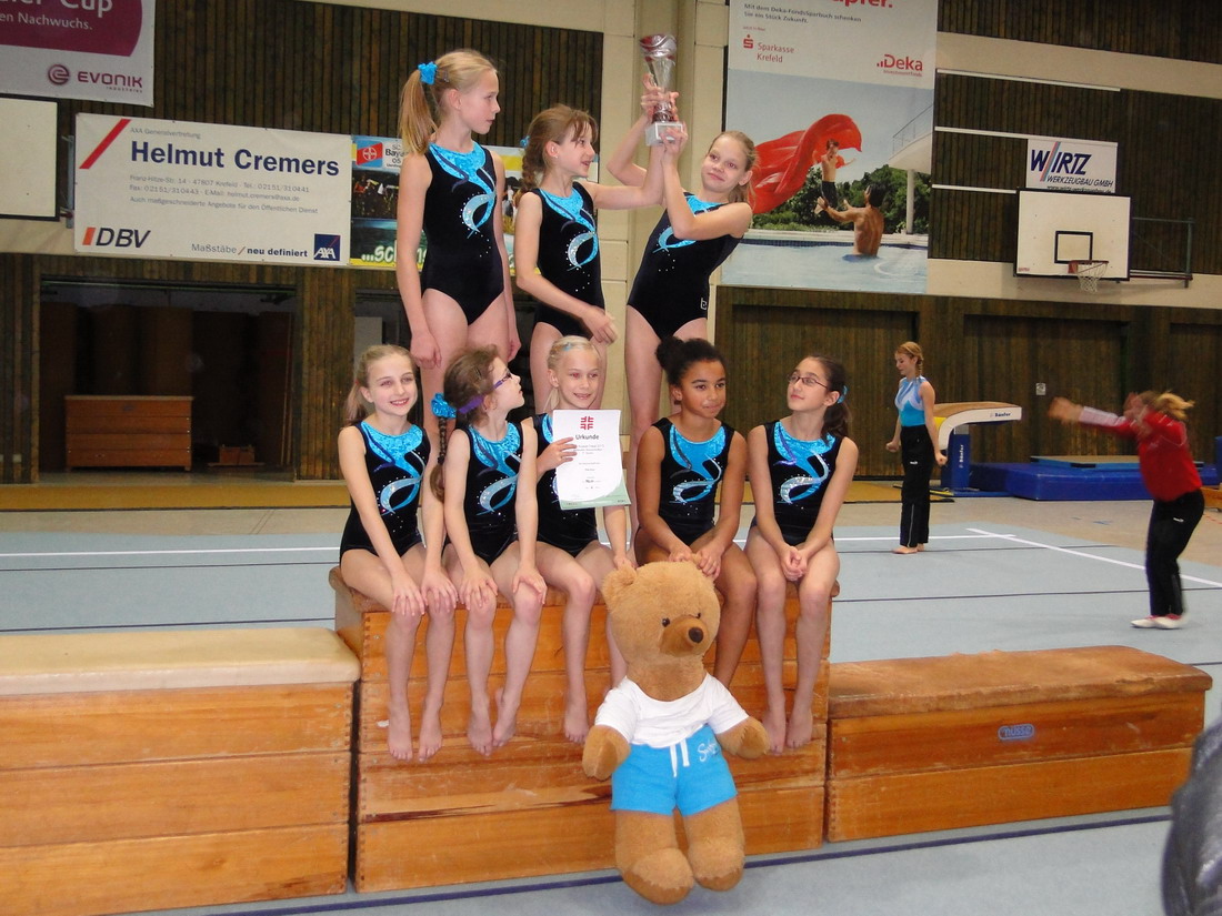 Wie jedes Jahr fand Anfang November der Cilly-Knaust Pokal in Krefeld-Fischeln statt. Zu diesem sonderbaren Termin dürfen Turnerinnen und vor allem Turner aller Altersklassen in einem Team antreten, was in den Turnverbänden meist nicht die Regel ist. Dem Zuschauer bietet sich also ein buntgemischtes Feld mit starken Athleten, auch noch in den höheren Altersklassen. Der Sport hält offensichtlich fit. In zwei Durchgängen traten also 23 Mannschaften und 190 Aktive aus dem gesamten Rheinischen Turnerbund den ganztägigen Wettkampf an. Anfangs noch mit organisatorischen Schwierigkeiten, weil der Kampf der Männer jede geübte Ordnung der Damenwettkämpfe durcheinander brachte. Im zweiten Teil des Tages kam dann unsere Mannschaft des TSV Porz an die Reihe, als Favorit wohlgemerkt. Im letzten Jahr holten sich unsere Mädchen bereits den Cilly-Knaust Pokal und waren äußerst gelassen an den Geräten angetreten. Kalina, die Trainerin, betonte nochmal, dass eine schlechte Platzierung wegen Übermut oder fehlendem Kampfgeist nicht geduldet werden würde und forderte an jedem Gerät vollste Konzentration. Die Mannschaft des TSV Porz bestand also aus acht angetretenen Mädchen: Sarah Shirvani Zadeh, Anna Kulbach, Cecile Weissenburger, Anja Woizenko, Natalie Kann, Annika Mundt, Angelina Kann und Maria Moisseyenko - aber nur jeweils fünf waren für ein Gerät zugelassen. So behielt sich Kalina bis zum Einturnen jeweils vor, die begehrten fünf Plätze optimal zu besetzen. Die Kinder mussten sich also vor Ort bewähren und neben den Trainingsleistungen auch hier nochmal ihr Bestes geben. Es gelang der Mannschaft an allen Geräten die bestmögliche Wertung zu erturnen und jedes Mal in der E-Note nicht mehr als 1 Punkt abgezogen zu bekommen. Da gab es nur hier und da ein paar Wackler, wenig technische Fehler, aber immer in der Ausführung um Längen besser als die Konkurrenz. Am Ende haben wir den Titel verteidigt und mit 10 Punkten Abstand zur zweitplatzierten Mannschaft das höchste Treppchen betreten. Platz 1 und ein durchaus erfolgreicher Tag für den TSV Porz, den wir sicher im nächsten Jahr wiederholen wollen.