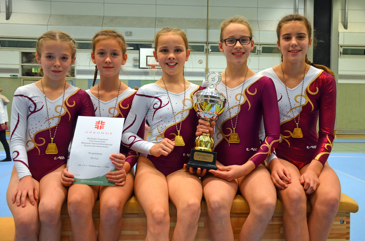 Bei der Siegerehrung konnte man den Turnerinnen ansehen, dass sie ganz und gar nicht sicher waren, ob ihre Leistungen gereicht hatten. Fünf Extrapunkte wettzumachen, ist dann doch nicht so einfach... Als das zweitplatzierte Team aufgerufen wurde und damit feststand, dass die Leistungen doch gereicht hatten, um sich den ersten Platz zu erturnen, war die Freude riesengroß! Die Porzerinnen hatten sich so ins Zeug gelegt, dass im Endeffekt, selbst nach Addition aller Bonuspunkte, noch vier Punkte Vorsprung übrig waren.