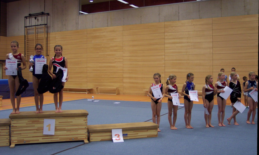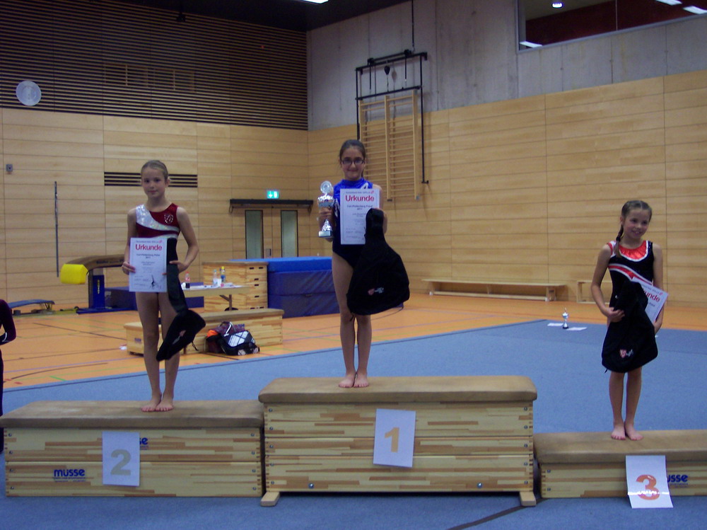 Im ersten Durchgang, der schon um 07:30 Uhr begann, turnten die ältesten Sportlerinnen - Jahrgang 1998 und älter. Noch nicht ganz wach mussten Michelle Blum, Ronja Gesell, Anne und Isabel Klein zum Sprung. Entsprechend schläfrig waren die Übungen... Nach und nach bekamen die Mädchen mehr Energie und von Gerät zu Gerät wurden ihre Darbietungen besser. Letztendlich landeten sie als Mannschaft mit einem kleinen Rückstand zum Treppchen auf dem 4. Platz. In der sehr starken Konkurrenz klassifizierten sich Anne und Isabel unter den besten zehn - Anne auf dem 6., Isabel auf dem 10. und Michelle auf dem 12. Platz.