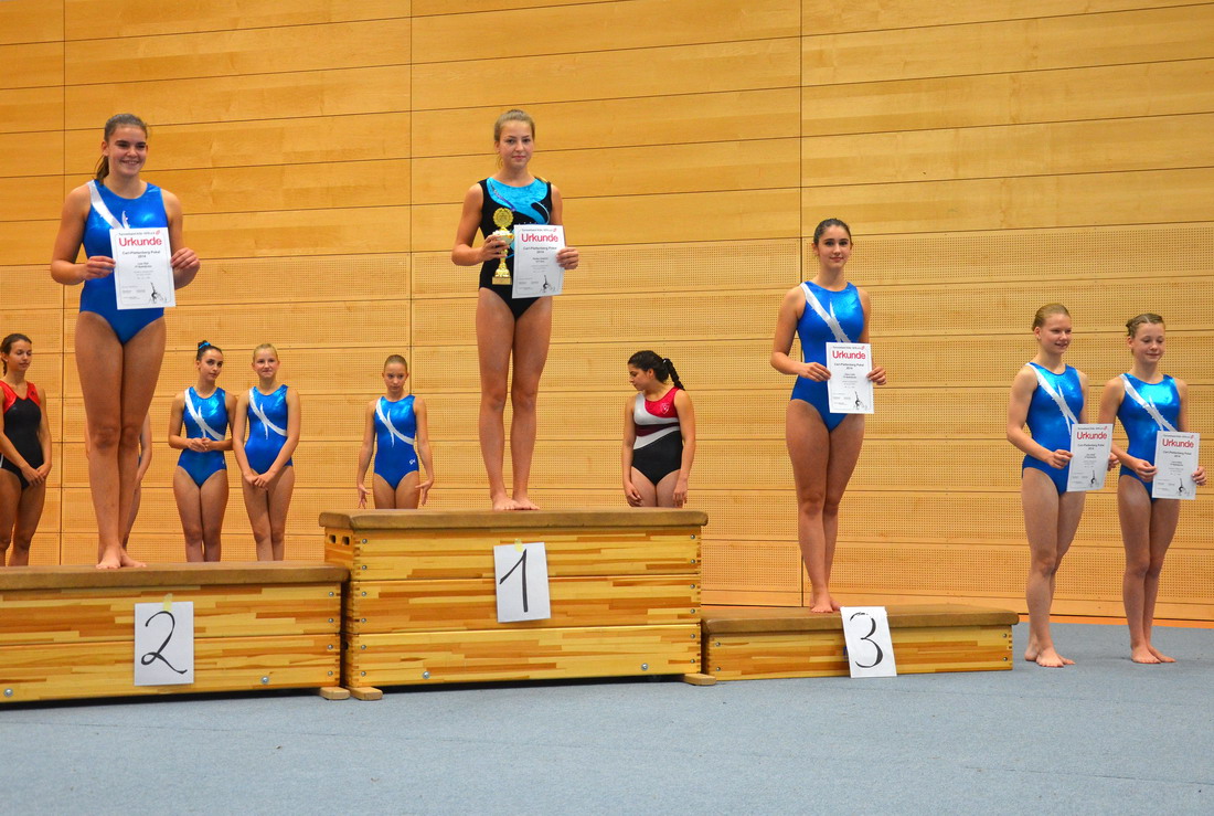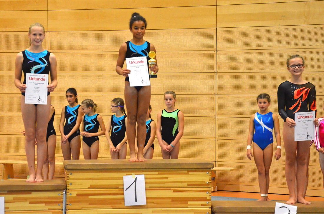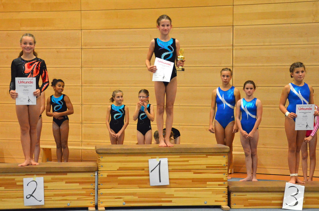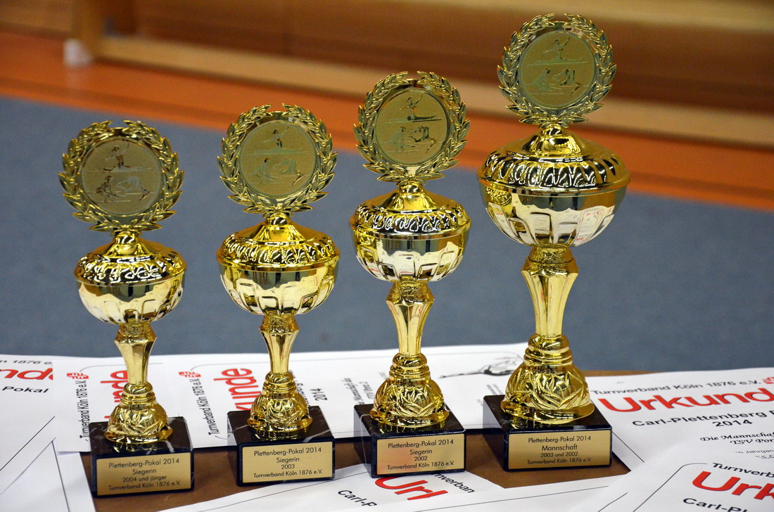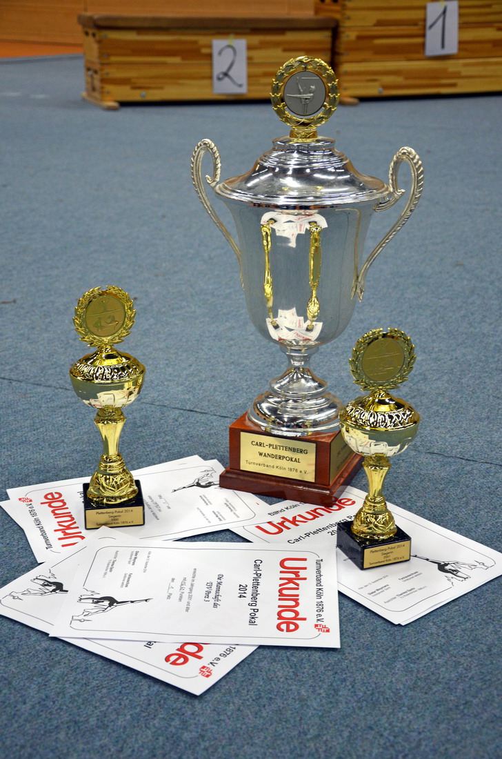Bei der Siegerehrung wurde es dann spannend, denn auch die Konkurrenz hatte gut geturnt und mit Schwierigkeiten nicht gegeizt. Letztendlich zeigte sich aber, dass die Porzer Mädchen es mit ihren Leistungen geschafft hatten sich an die Spitze zu turnen. Pauline und Jessica belegten in ihren Jahrgängen jeweils den ersten Platz während Sarah sich direkt hinter Jessica über den zweiten Rang freuen konnte. Das letzte Jahr hatte die Mädchen gelehrt, dass erste Plätze in der Einzelwertung nicht zwangsweise den ersten Platz in der Mannschaftswertung mit sich bringen, aber dieses Jahr war es ihnen dann doch vergönnt sich auch als Mannschaft auf das höchste Treppchen stellen zu können und zum ersten Mal den Carl-Plettenberg Wanderpokal mit nach Porz nehmen zu können.
