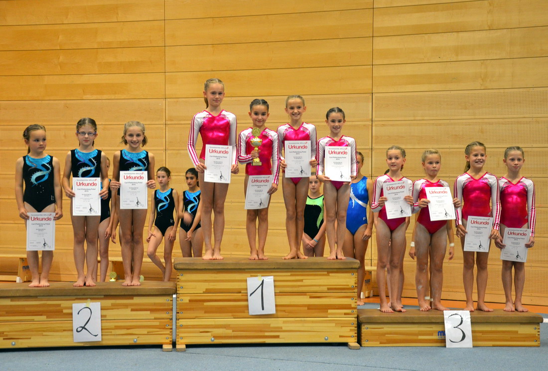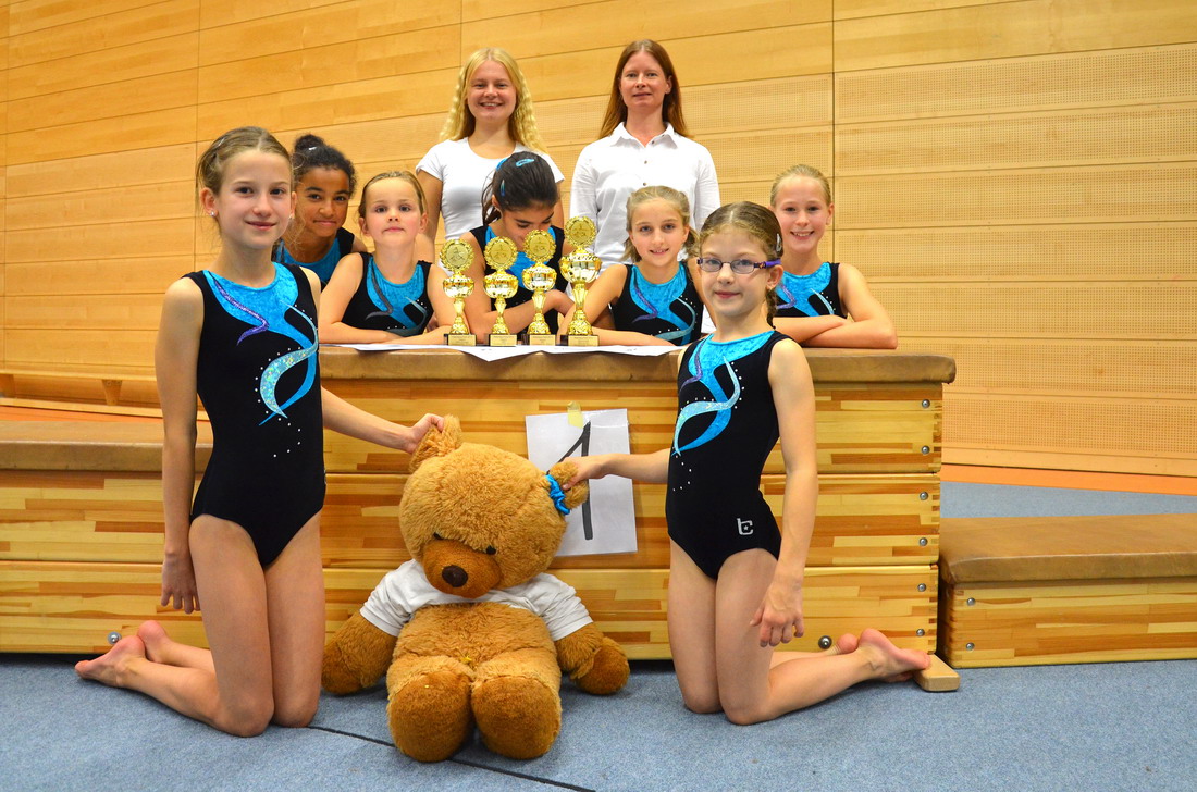 Bei der Siegerehrung stellte sich dann heraus, dass die “Kleinen” den “Großen” in nichts nachstehen. In der jüngsten (und am stärksten besetzten) Altersklasse platzierte sich Sarah, als jüngste Starterin des Tages, auf dem tollen achten Platz. Im vereinsinternen Wettkampf hatte dieses Mal Maria die Nase vorn und erkämpfte sich in dieser Altersklasse den ersten Rang, gefolgt von Angelina auf dem zweiten Platz. Im Jahrgang 2003 konnte sich ebenfalls eine TSV-Turnerin auf den obersten Podestplatz stellen, Natalie gewann diese Altersklasse, während Tanin sich auf dem siebten Platz klassifizierte. Um diesen tollen Wettkampftag abzurunden, nahmen sich Cecile und Anja ein Beispiel an ihren Trainingskameradinnen und beendeten den Wettkampf auf Platz 1 (Cecile) und Platz 2 (Anja). Dann warteten alle gespannt auf das Mannschaftsergebnis. Die Mannschaft 1 konnte sich gegen die anderen Vereine durchsetzen und den Siegerpokal entgegen nehmen. Bei der jüngsten Mannschaft, auch hier wieder ohne Streichwert, reichte es dann doch nicht ganz und sie mussten der starken Konkurrenz aus Rodenkirchen mit dreieinhalb Zehnteln den Vortritt lassen.