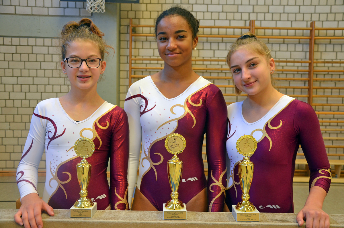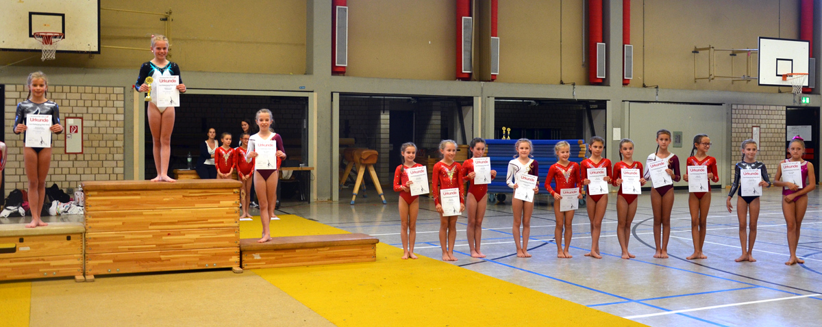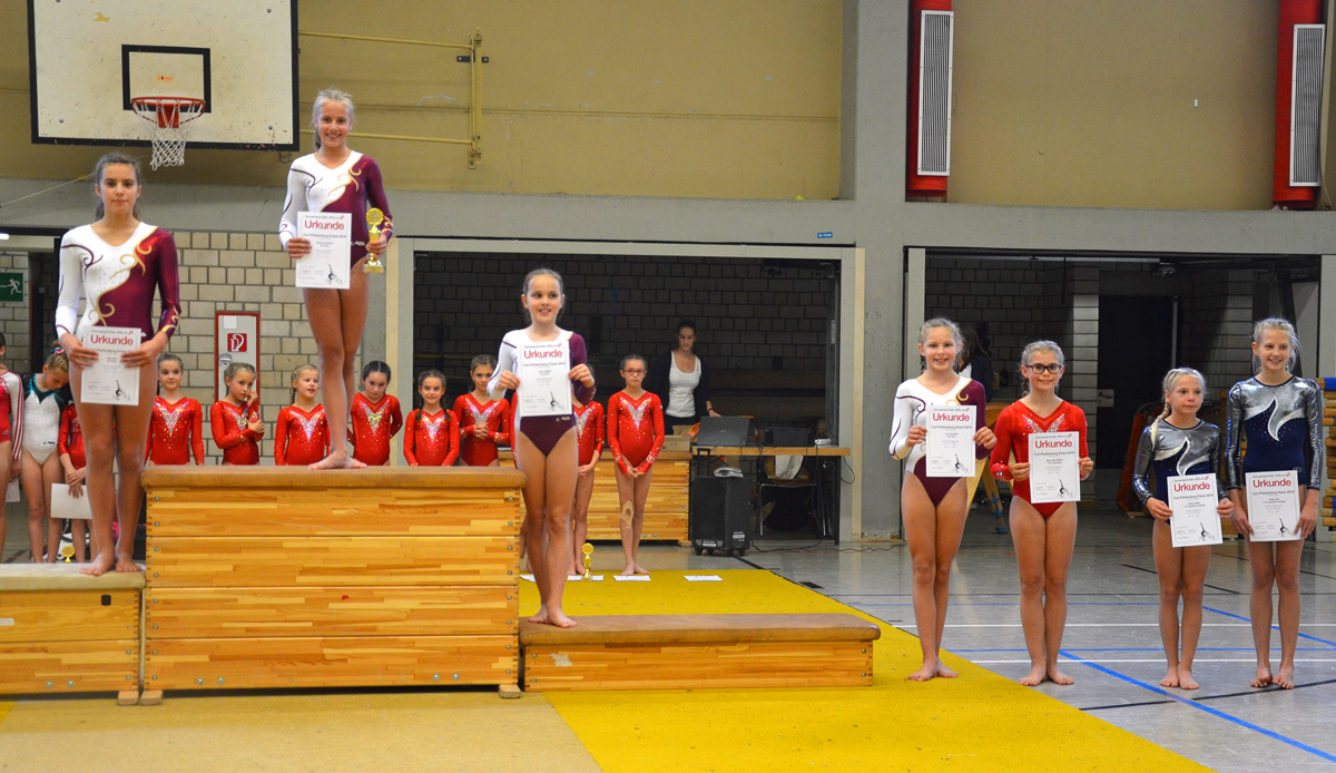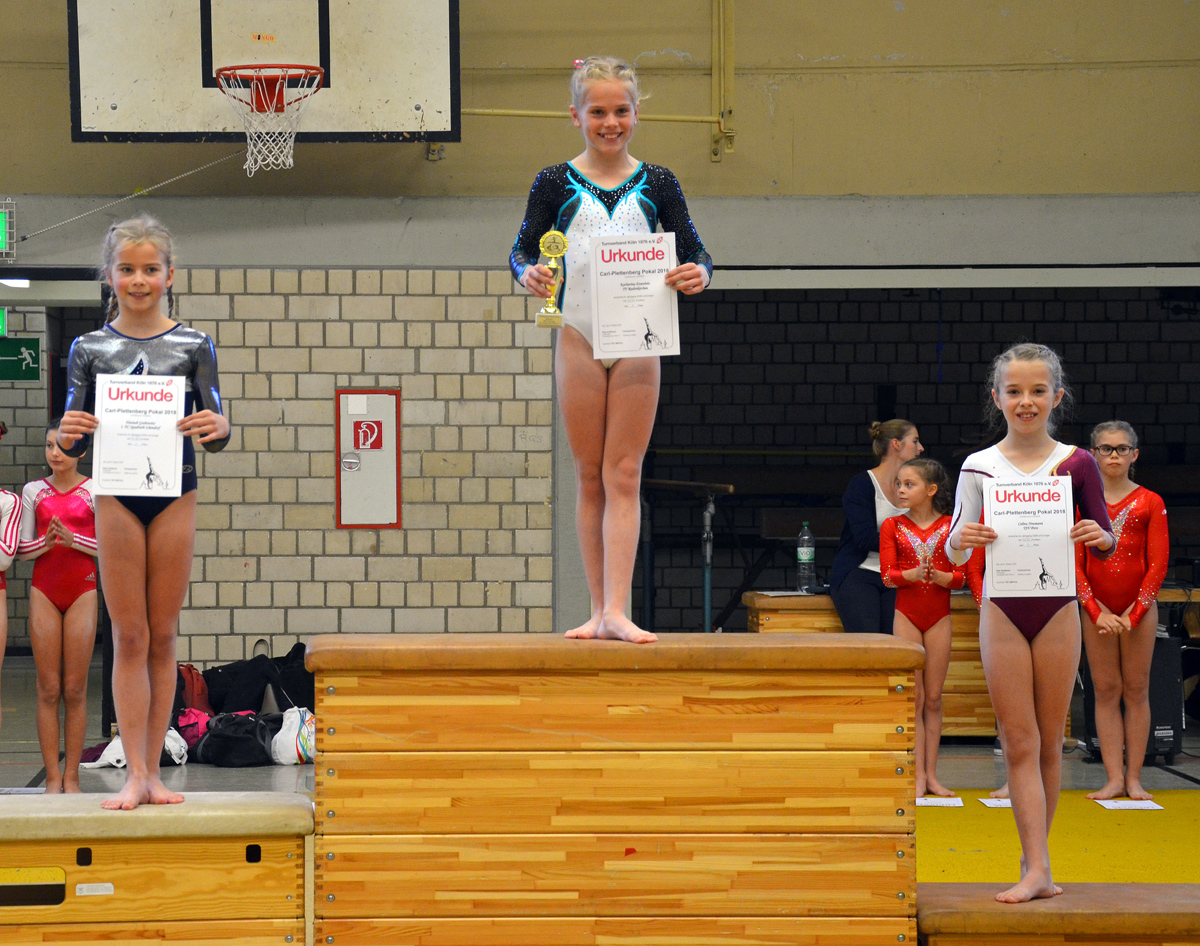 In der Einzelwertung konnten dann jedoch noch vier weitere Pokale mit nach Porz gebracht werden. So durften sich am Ende der Wettkampfdurchgänge Cecile Weissenburger (2002), Maria Rundau (2004), Angelina Kann (2005) und Malina Wendland (2006) auf dem Siegertreppchen positionieren und die Pokale lächelnd entgegennehmen. Aber auch die anderen Platzierungen konnten sich sehen lassen. So erzielte Alina Bart (2006) den 2. Platz, Sarah Adolphs (2006) den 3. Platz, Lisa Liesenfeld (2006) den 4. Platz, Julia Korn (2007) den 6. Platz, Celina Neumann (2008) den 3. Platz, Charlotte Liesenfeld (2008) den 7. Platz und Veronica Schäfer (2008) den 11. Platz. Herzlichen Glückwunsch an alle Turnerinnen und Trainer!