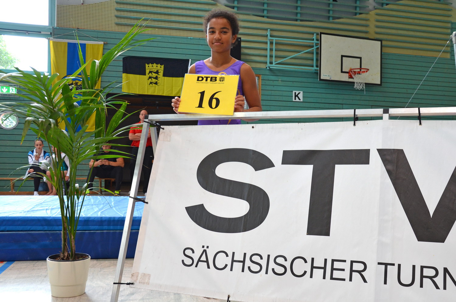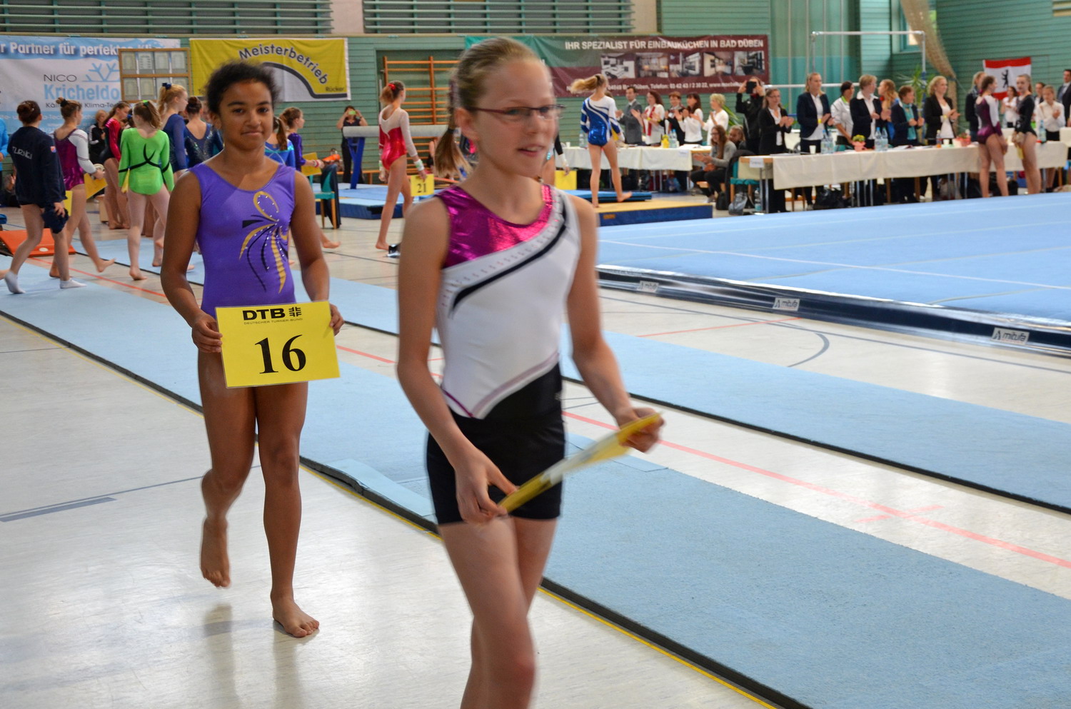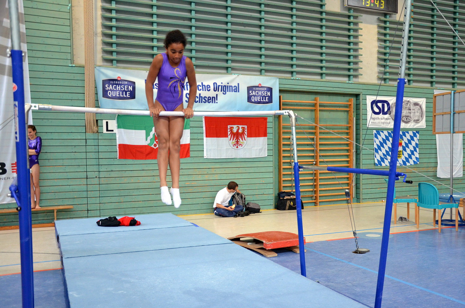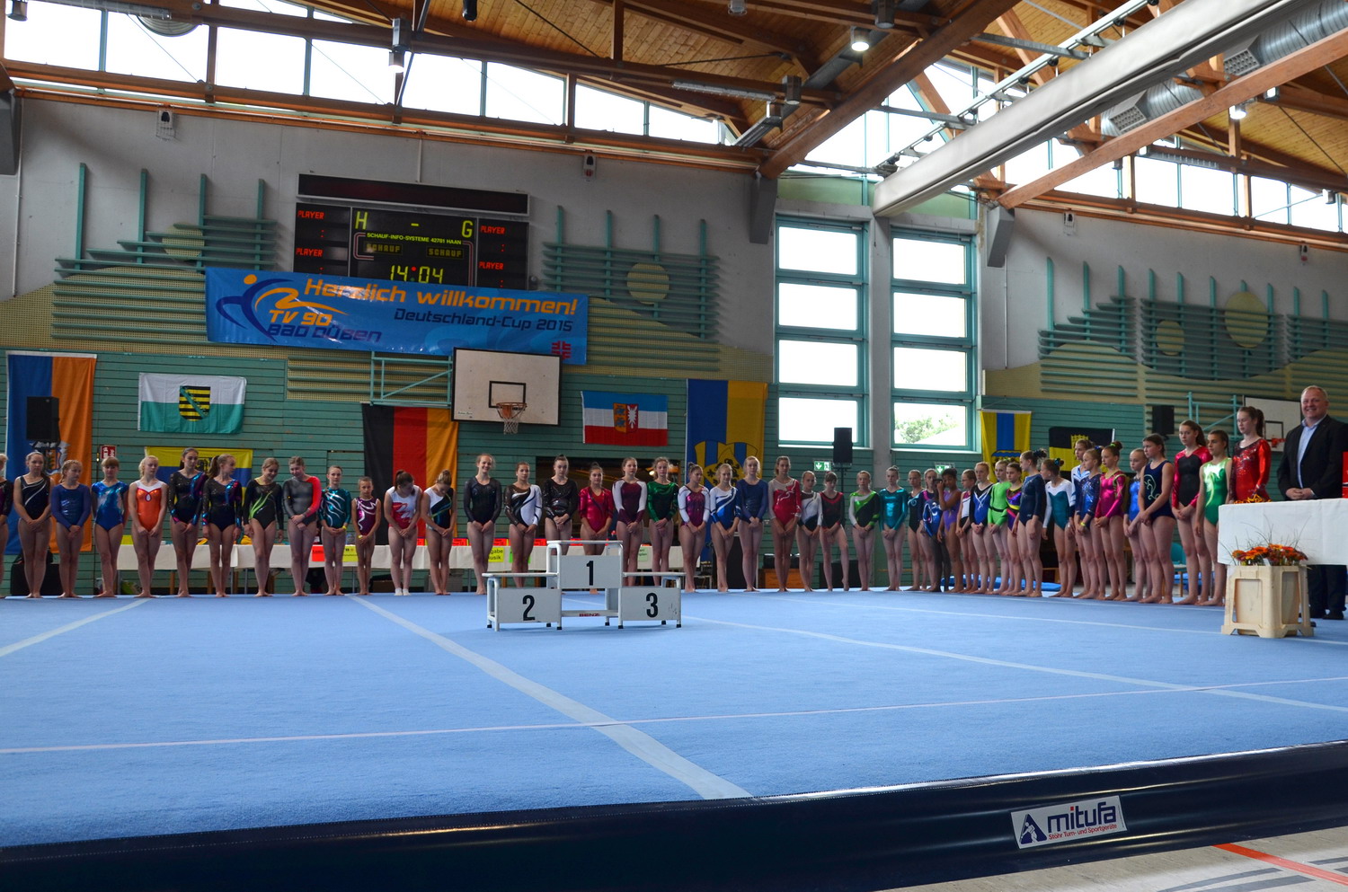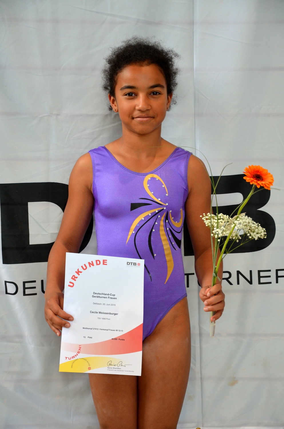 Am Samstag, dem 20.06.2015, fand bereits zum 17. Mal der Deutschland-Cup im Gerätturnen statt, quasi die Deutschen Meisterschaften der leistungsorientierten Breitessportturner. Zum ersten Mal wurde bei diesem Wettkampf im Kultur- und Sportzentrum in Delitzsch geturnt, nur wenige Kilometer von Leipzig entfernt. Über 400 Teilnehmer aus 18 Landesturnverbänden aus ganz Deutschland erlebten zwei reibungslos und perfekt organisierte Wettkampftage. Unter den 42 leistungsstärksten Turnerinnen in der LK 2 (Jahrgang 2002/2003) war auch Cecile Weissenburger vom TSV Porz am Start. Der Wettkampf begann für Cecile am frühen Samstag mit dem Sprung. Für ihren gut gelungenen “Yamashita" erhielt sie eine Note von 12,25 Pkt. Das war ein guter Anfang ihres Wettkampfes. Nun ging es an den Stufenbarren, wo ihre Übung leider keine Riesenfelgen beinhaltete und der Flieger zwischen den Holmen nicht mit der Kippe verbunden wurde... damit entsprach die Übung nicht ganz den Anforderungen. Cecile strengte sich jedoch sehr an und bekam für ihre Übung 11,40 Pkt. Eine gute Wertung. Das nächste Gerät in der olympischen Reihenfolge war der Balken. Hier wurden dem Publikum anspruchsvolle Übungen präsentiert, mit Salti auf dem Balken, schwierigen Auf- und Abgängen. Cecile konnte jedoch mit der Konkurrenz mithalten. Ihre Übung mit einem Menichelli und einem Durchschlagsprung gelang ihr beinahe fehlerlos und sie wurde dafür mit einer guten Note (12,30 Pkt.) belohnt. Hochmotiviert und konzentriert ging Cecile zum Boden, dem letzten Gerät. Obwohl einige Elemente ihrer Übung von den Kampfrichterinnen nicht anerkannt wurden, war die Darbietung soweit schön und sauber, dass sie auch hier eine tolle Note erntete und mit 13,55 Pkt. zu den besten Turnerinnen an diesem Gerät gehörte. Am Ende reichte es mit 49,50 Punkten für Cecile zum 12. Rang. Es war ein krönender Abschluss der Wettkampfsaison. Durch viel Arbeit und Fleiß im Training hat sie sich diese Platzierung sehr verdient. Die Freude bei der Turnerin wie auch der Trainerin war groß! Ein Spitzenergebnis für einen Deutschland-Cup, immerhin einen bundesweiten Wettkampf! Herzlichen Glückwunsch!