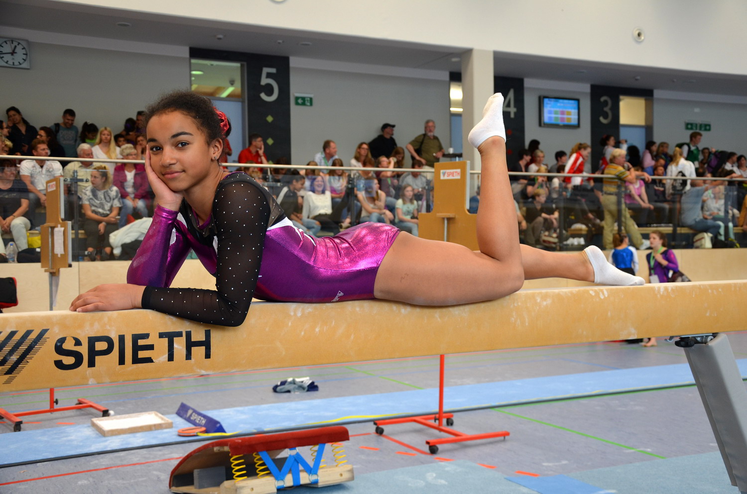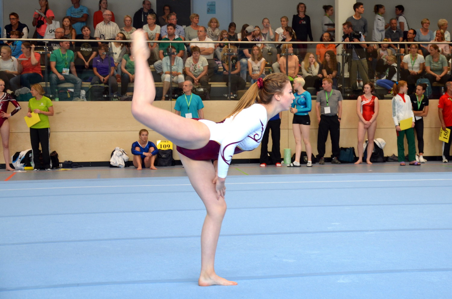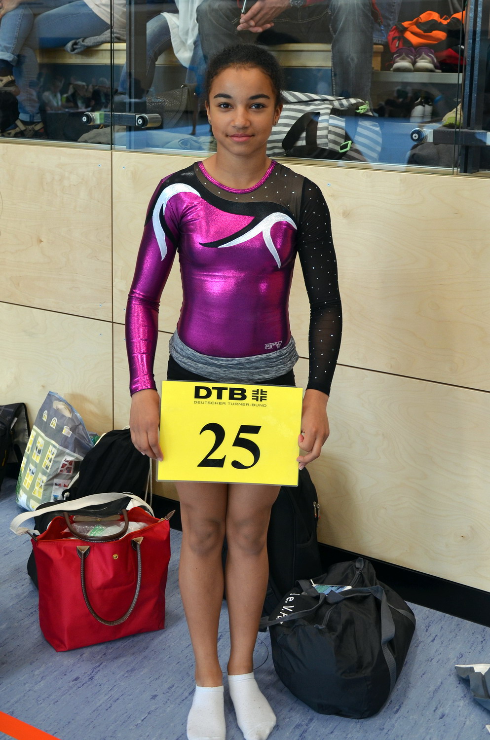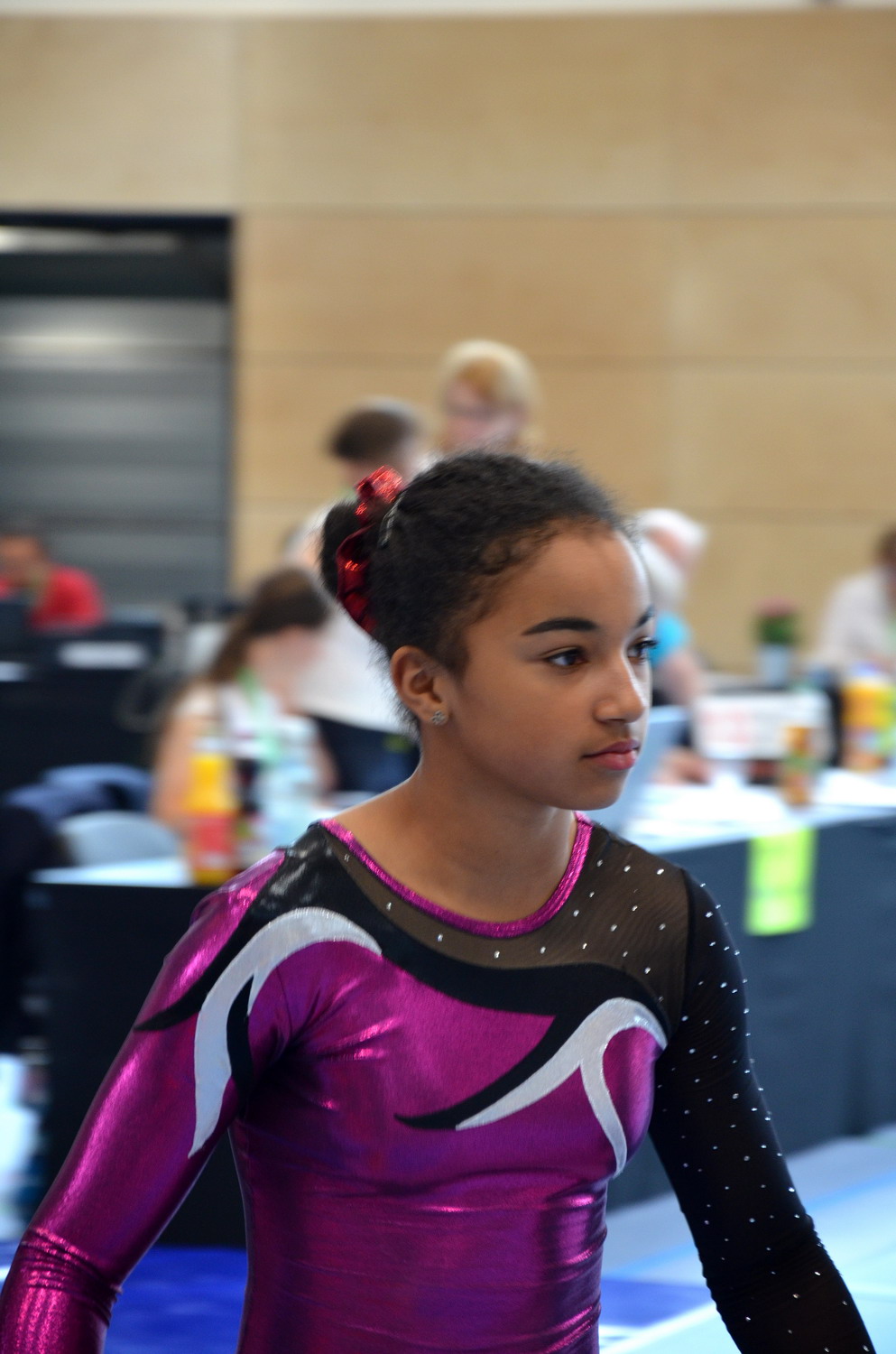 Cecile, die sich bereits am Vormittag gegen 42 Turnerinnen in der LK 1 behaupten musste, begann am Balken, was nicht gerade ihr Lieblingsgerät ist. Leider gewann die Nervosität die Überhand und Cecile musste die akrobatische Verbindung wegen eines Wacklers abbrechen. Dazu kam noch ein Sturz bei der Radwende und die erste Note im Wettkampf wurde nicht besonders hoch. Nichtdestotrotz turnte Cecile ihre Übung am nächsten Gerät sehr konzentriert und sauber, sodass sie sich mit einer Note von 14,20 Pkt. unter den deutschlandweit 5 besten Turnerinnen am Boden klassifizierte. Sehr erfreulich war, dass alle Elemente anerkannt wurden und die D-Note in Höhe von 6,10 Punkten zu den besten zählte. An den folgenden zwei Geräten präsentierte Cecile ziemlich solide Übungen und erntete dafür gute Noten. Letztendlich platzierte sich Cecile in der Mitte der Konkurrenz. Mit 49,25 Punkten belegte sie in dem hochkarätigen Wettkampf den 20. Rang.