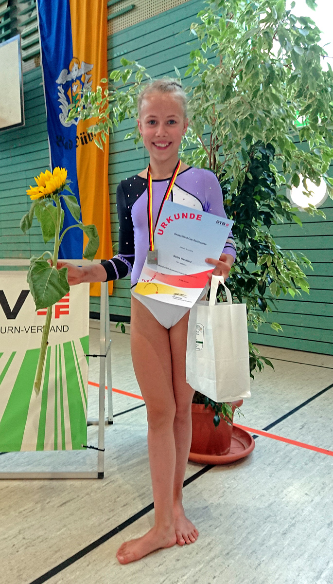 Am 8. Juni traten zwei Turnerinnen des TSV Porz, Cecile Weissenburger (2002) und Malina Wendland (2006), mit ihrer Traininerin Kalina Polanski die Reise nach Delitzsch bei Leipzig an, um dort bei den Deutschen Meisterschaften der Leistungsklasse 1 gegen die besten Turnerinnen aller Turnverbände Deutschlands anzutreten. Am 9. Juni begann der Wettkampf für Malina um 8 Uhr. Sehr nervös und voller Spannung begann sie das Einturnen und startete um 9 Uhr ihren Wettkampf gegen 40 weitere Turnerinnen, am Sprung. Schon hier konnte sie mit ihrem Halb-rein-ganz-raus wichtige Punkte einfahren, um das nächste Gerät, Barren, etwas auszugleichen, da dieses nicht ihre Stärke ist. Weiter ging es am Balken, an dem sie eine überzeugende Übung mit lediglich einem kleinen Wackler zeigte. Sie beendete den Wettkampf, wie schon in der Qualifikation, mit ihrem Lieblingsgerät, dem Boden und zeigte hier wieder was in ihr steckt. Am Ende erreichte sie 52,25 Punkte, landete so mit nur 0,25 Punkten hinter der Erstplatzierten und darf sich Deutsche Vize-Meisterin der Leistungsklasse 1 nennen. Welch ein Erfolg für Malina und ihre Trainerinnen, die vor Freude strahlten.