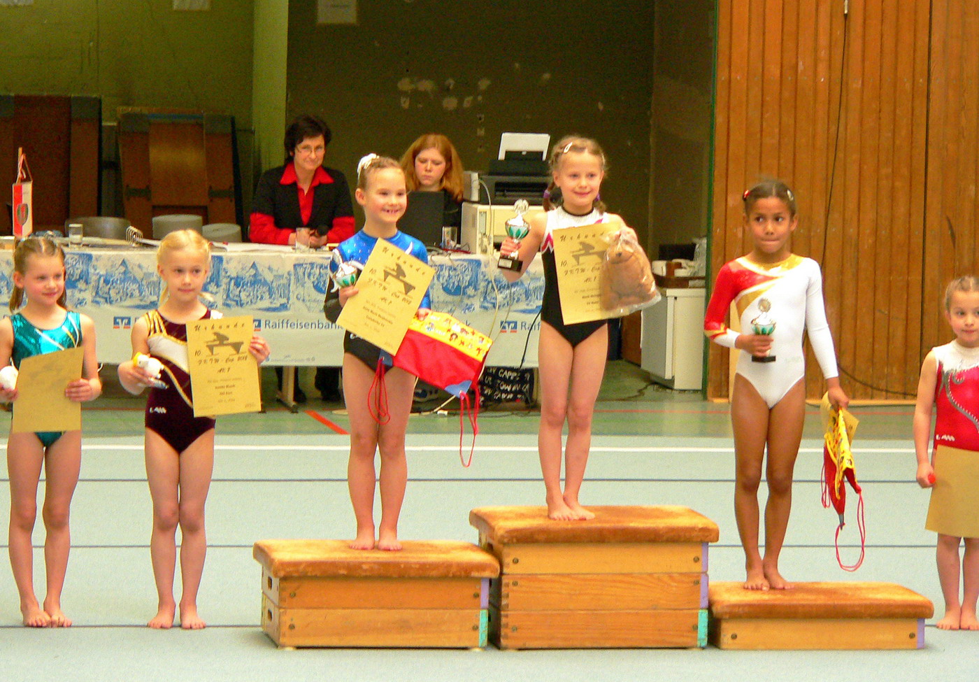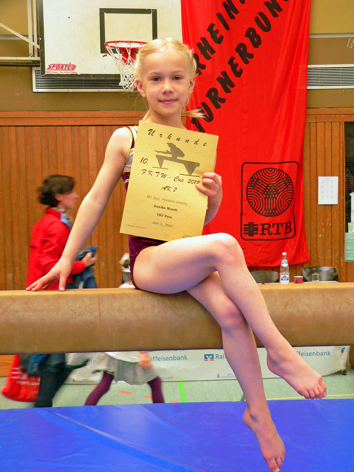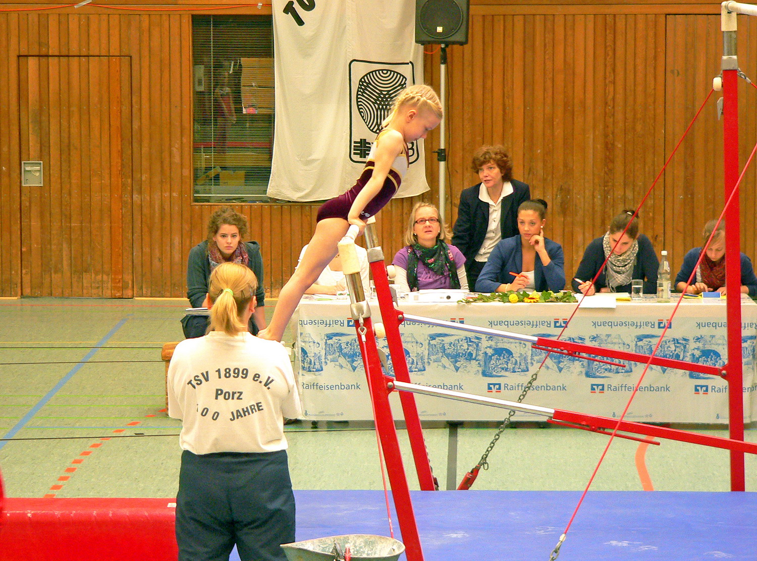 Bei dem bundesoffenen Wettkampf hieß es, die neu erlernten Übungen beim ersten Geräteturnwettkampf im AK Bereich, zu präsentieren. In der Altersklasse 7 zeigte Annika Mundt vom TSV Porz, dass sie sich hinter den anderen Turnerinnen aus den Leistungszentren nicht verstecken muss. Mit einer geglückten Barrenübung, die mit 14,05 Punkten belohnt wurde, startete sie in den Wettkampf. Als nächstes Gerät kam der Balken. Auch hier schaffte es Annika, alle geforderten Elemente zu turnen und wurde dafür mit einer sehr guten Note belohnt. Beim nächsten Gerät, dem Boden, schlichen sich leider einige kleinere Fehler ein. Es wurde der Handstand nicht anerkannt und Annika bekam an diesem Gerät, trotz der schönen Ausführung der Übung, nur 11,65 Punkte. Zuletzt ging es zum Sprung, wo Annika noch einmal ihre Stärke zeigen konnte. Sie wurde für ihre schönen Sprünge mit einer guten Note von 13,85 Punkten bewertet. Danach blieb nichts weiter zu tun als abzuwarten, bis die Punkte aller Teilnehmerinnen zusammengerechnet waren und die Daumen zu drücken. Allerdings fehlten Annika wichtige Punkte für das Gesamtergebnis, die sie am Boden verlor und deswegen war es schwierig abzuschätzen, welchen Rang Annika erreichen konnte. Endlich kam die ungeduldig erwartete Siegerehrung. In einem 31 Kinder starken Teilnehmerfeld belegte Annika überraschend einen tollen 4. Platz! Herzlichen Glückwunsch!