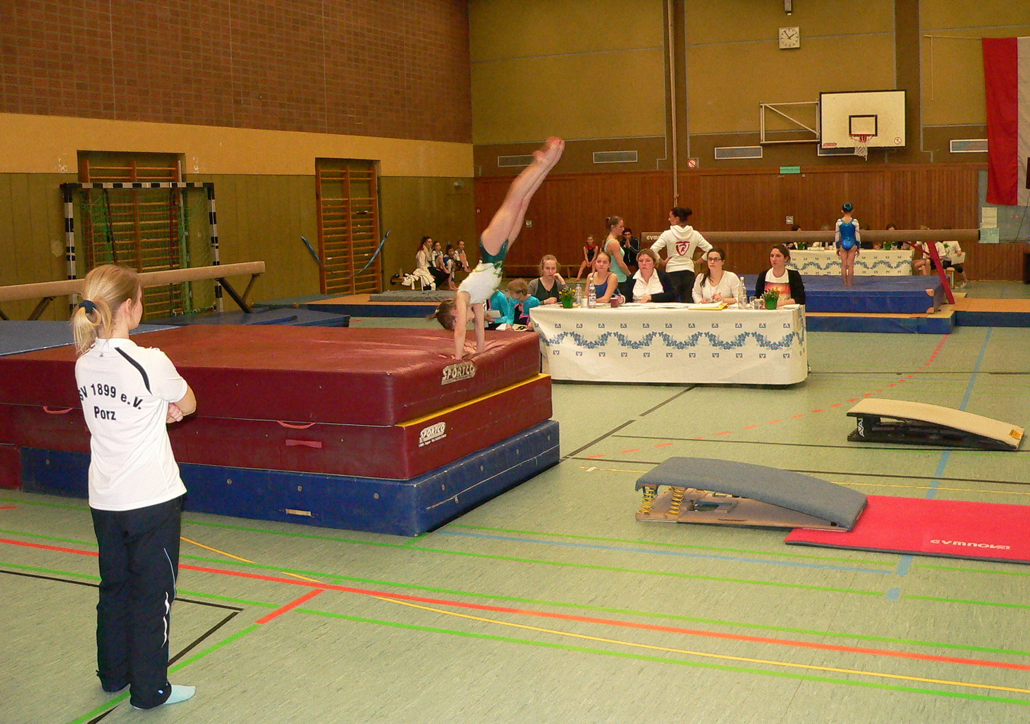 Angespornt durch die sehr gute Leistung , ging es an das nächste Gerät, den Sprung. Auch hier zeigten beide Turnerinnen tolle Leistungen und wieder ging eine Tageshöchstwertung auf das Konto des TSV Porz. Annika konnte die Kampfrichter mit 2 sehr schönen Sprüngen überzeugen und wurde mit 15,40 Punkten belohnt. Angelinas Sprünge wurden mit 13,80 Punkten bewertet. Nach diesem Durchgang lag Annika auf dem 1.Platz der Konkurrenz und Angelina auf Platz 4.