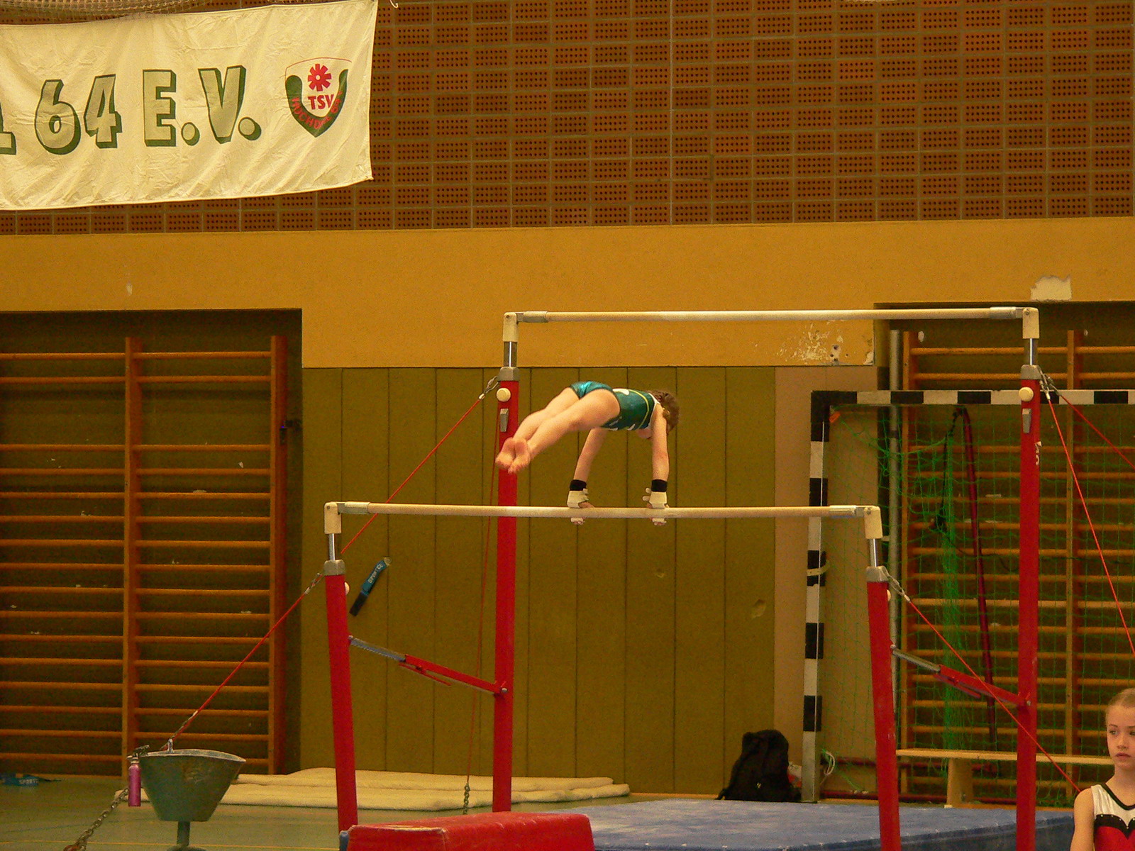 Am nächsten Gerät, dem Barren, hieß es für Annika und Angelina kämpfen und die schwierigen Elemente wie Aufhocken, Kippe, Langhangkippe und Unterschwung in die Langhangschwünge bezwingen. Annika gelang das schon ganz gut und sie bekam alle geforderten Elemente anerkannt. Ihre Übung wurde mit 13,80 Punkten bewertet.