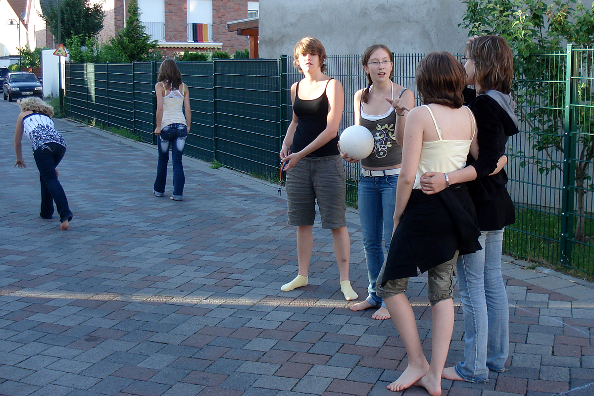 Nach diesem Festmahl war uns dann nach Sport. Alle liefen zur Straße und wir spielten zusammen Völkerball. Es war eine lustige Runde, denn jedes Mal, wenn ein Auto vorbeifuhr und wir ausweichen mussten, stellten wir uns wie Bäume an den Straßenrand und machten Gleichgewichtsübungen.