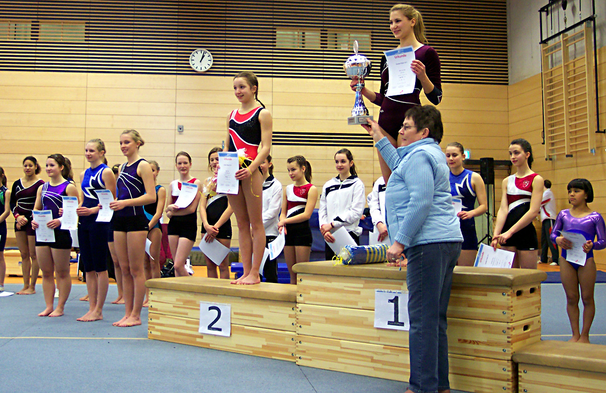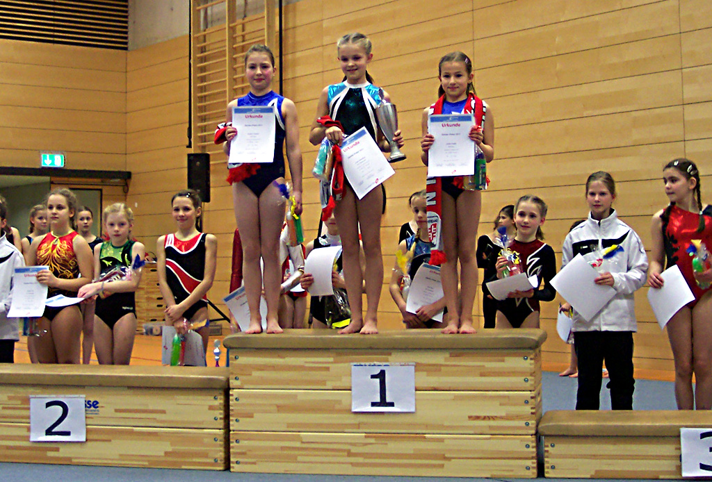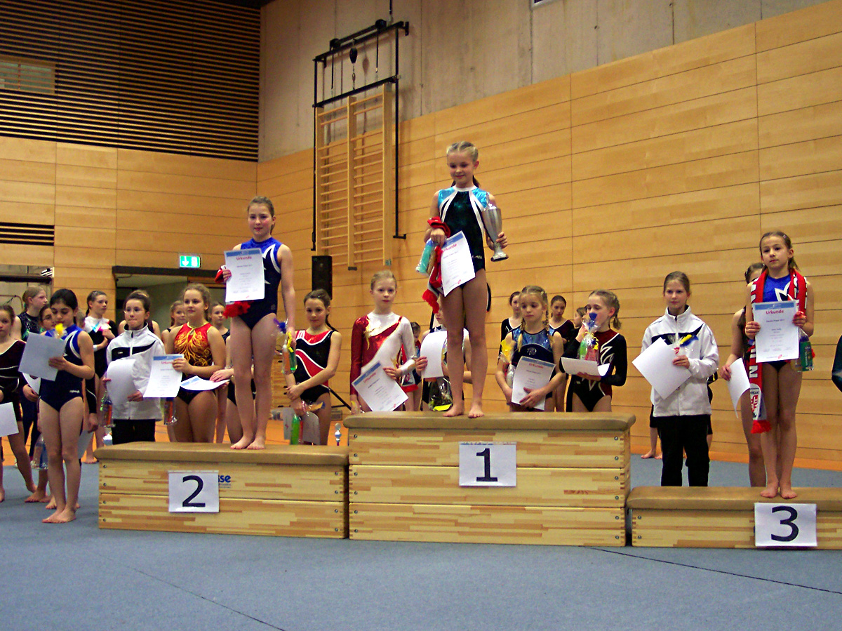 Im zweiten Durchgang starteten die jüngeren Turnerinnen des TSV Porz im Zander-Nachwuchspokal. In einer großen Konkurrenz von 22 Turnerinnen der Jahrgänge 2000/2001 starteten Pauline Friedrich, Mahsa Chaharlang und, das erste Mal in einem Kürwettkampf, Jessica Haelke sowie Sarah Shirvani Zadeh. Geturnt wurde die Stufe KM4. Die Porzerinnen zeigten die beste Leistung am Barren. Die Übungen von Mahsa und Pauline waren die Besten in der Konkurrenz. Auch Jessica bekam für ihre Übung, in der sie zum ersten Mal die erst vor einer Woche erlernte Langhangkippe turnte, die viertbeste Note! Jessica und Pauline waren auch an den restlichen drei Geräten immer unter den zehn Besten und lieferten sich ein spannendes Duell. Sie mussten sich aber zu guter Letzt einer Turnerin des TUS Brauweiler geschlagen geben. Pauline belegte den 2., Jessica den 3. Platz. Überraschend landete auf dem 4. Platz mit nur 0,1 Punkten Rückstand die nächste Turnerin aus Porz - Mahsa. Trotz eines Sturzes am Balken konnte Mahsa mit ihrer Barren- und Bodenübung die fehlenden Punkte aufholen und sich über ein gutes Wettkampfergebnis freuen. Viel Pech hatte leider die vierte Porzer Turnerin. Sarah begann den Wettkampf mit einer verturnten Balkenübung, wo sie beim Rad stürzte und danach folgte eine nicht ganz gelungene Bodenübung. Am Sprung zeigte sie ihre Stärke, wurde an diesem Gerät sogar Achte aber am Barren stürzte sie erneut und letztendlich beendete sie den Wettkampf auf dem 19. Platz.