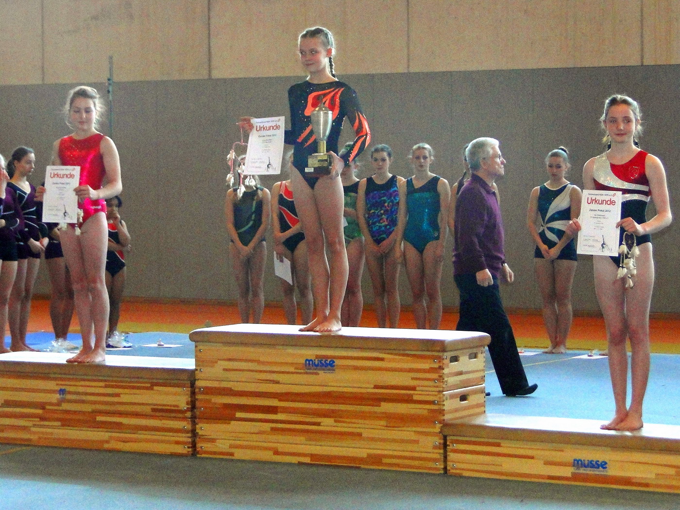 Auch in dieser Altersklasse ging der Pokal nach Brauweiler, die beste Porzer Turnerin, Jessica, landete auf dem 3. Platz. Sarah verturnte ihre Barrenübung und ihre gesammelten Punkte reichten nur für den 5. Rang. Anja klassifizierte sich auf dem 9., Anna - 12. und Fenja - auf dem 14. Platz.