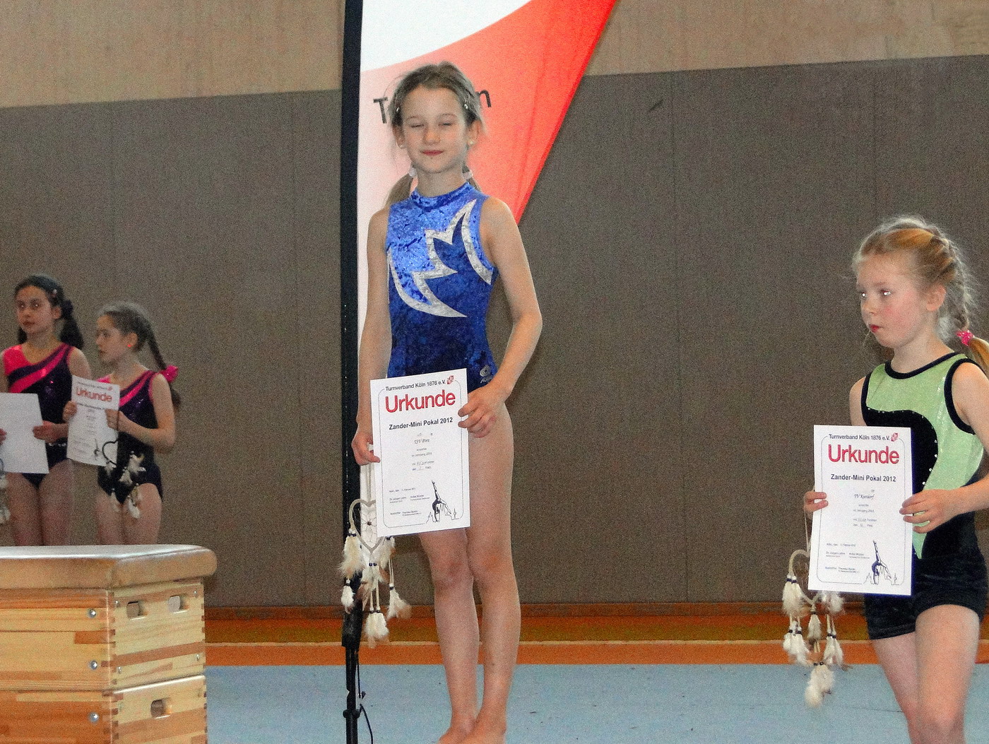 Die jüngste Turnerin aus Porz, die 8-jährige Natalie Kann, startete im Mini-Pokal. Da Natalie das erste Mal bei einem Kürwettkampf startete und noch sehr unerfahren ist, schlich sich große Nervosität in ihre Übungen ein. Sie begann den Wettkampf mit einer verturnten Balkenübung, wo sie beim Rad stürzte, bekam für diese Übung aber trotzdem die beste Note in der Konkurrenz. Am Boden zeigte sie ihre Stärke, wurde an diesem Gerät sogar Zweite aber am Barren folgte eine nicht ganz gelungene Übung. Sie freute sich letztendlich über ihren 3. Platz und dass sie sich auf das Siegerpodest stellen durfte.