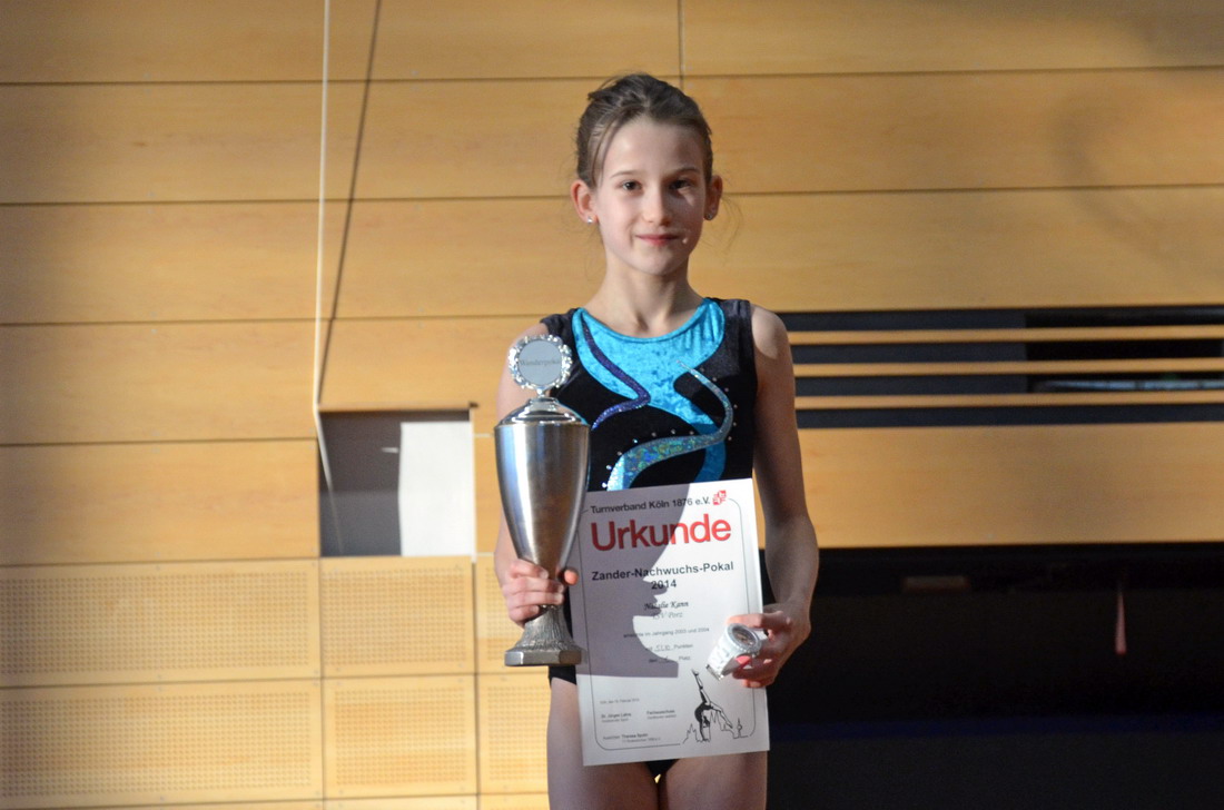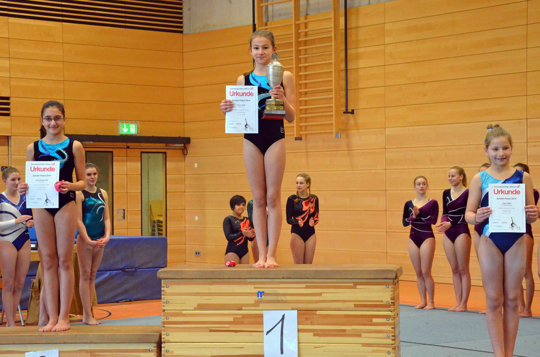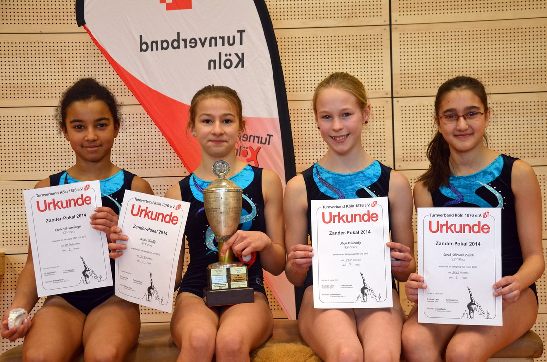 Um 09:30 Uhr gingen zuerst Jessica Haelke, Sarah Shirvani Zadeh, Cecile Weissenburger und Anja Woizenko im Zander Pokal an den Start. An jedem Gerät präsentierten sie sehr gute Leistungen und belegten die vorderen Plätze im Ranking. Am Sprung zeigte Cecil, dass sie ein großes Potential an Sprungkraft hat und erntete die höchste Note für ihren Überschlag. An den nächsten beiden Geräten brillierte Jessica, sie bekam die beste Wertung für ihre Barrenübung und weil sie eine starke Konzentration und ruhige Nerven am Balken behielt, wurde sie die Meisterin an diesem Zittergerät. Die zweitbeste Turnerin am Balken war Sarah, die nur 0,2 Punkte weniger für ihre Darbietung erntete. Auch am Boden dominierten die Mädchen aus Porz. Hier wurde wieder die Dynamik und die Schwierigkeit der Sprünge von Cecile gut belohnt, sie gewann mit 13,60 Punkten vor Jessica. Das Endergebnis war aus Sicht des TSV Porz sehr erfolgreich. Anja belegte den 7. Platz. Cecile, die leider 2 Mal unfreiwillig den Balken verlassen musste und damit die Chance den Wettkampf zu gewinnen verlor, platzierte sich auf dem guten 5. Rang. Ein spannender Kopf-an-Kopf Kampf lief während des ganzen Wettkampfs zwischen Jessica und Sarah. Letztendlich gewann Jessica den 1. Platz und den Zander-Pokal. Sarah platzierte sich auf dem 2. Rang mit einem Rückstand von nur 0,05 Punkten!