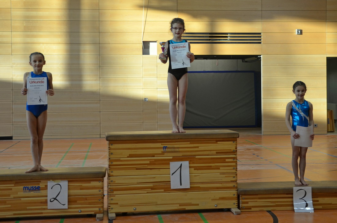 Eine große Überraschung gab es bei der Siegerehrung. Angelina gewann den Wettkampf trotz des Patzers am Balken und freute sich über den Mini-Pokal.