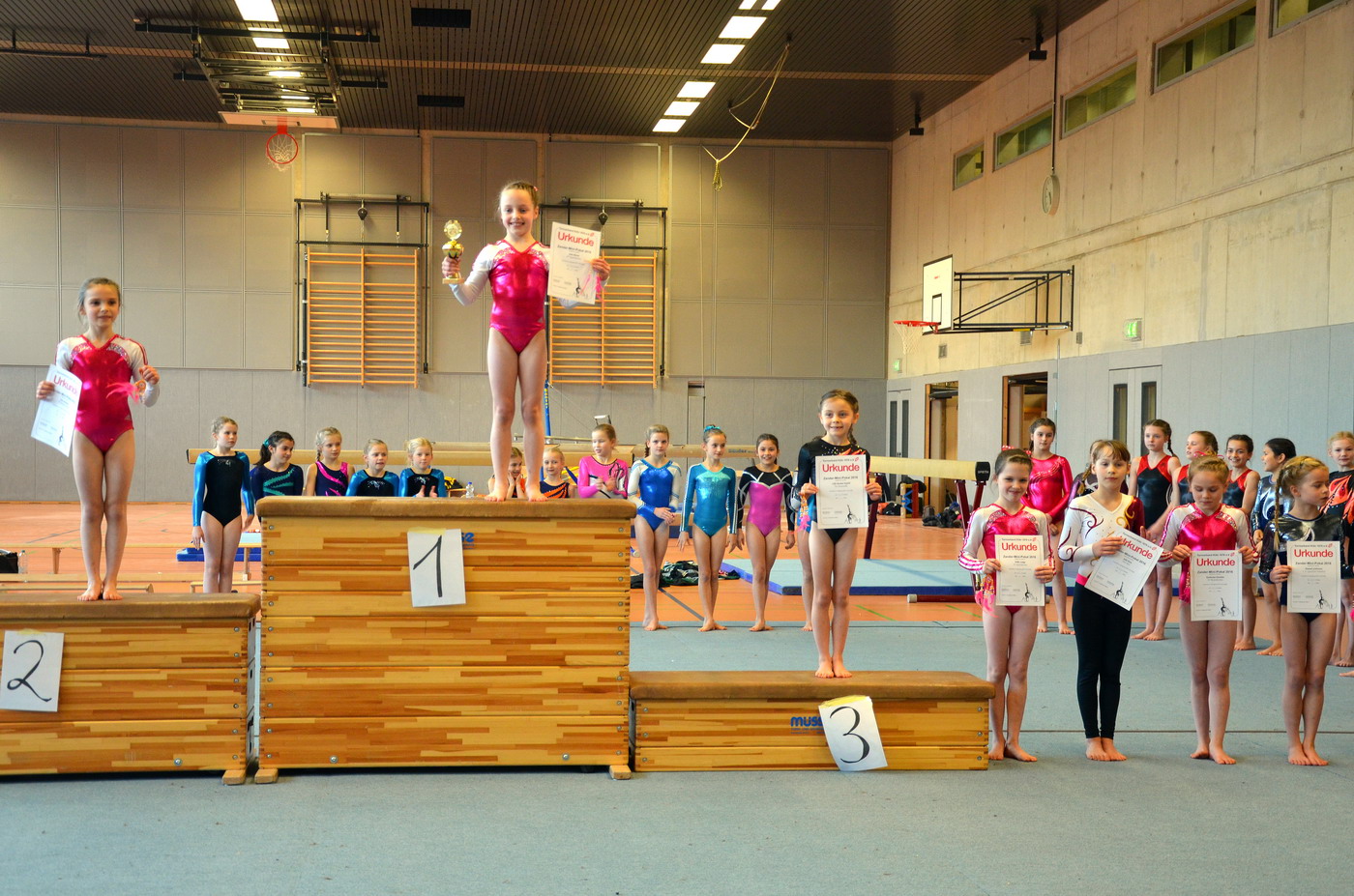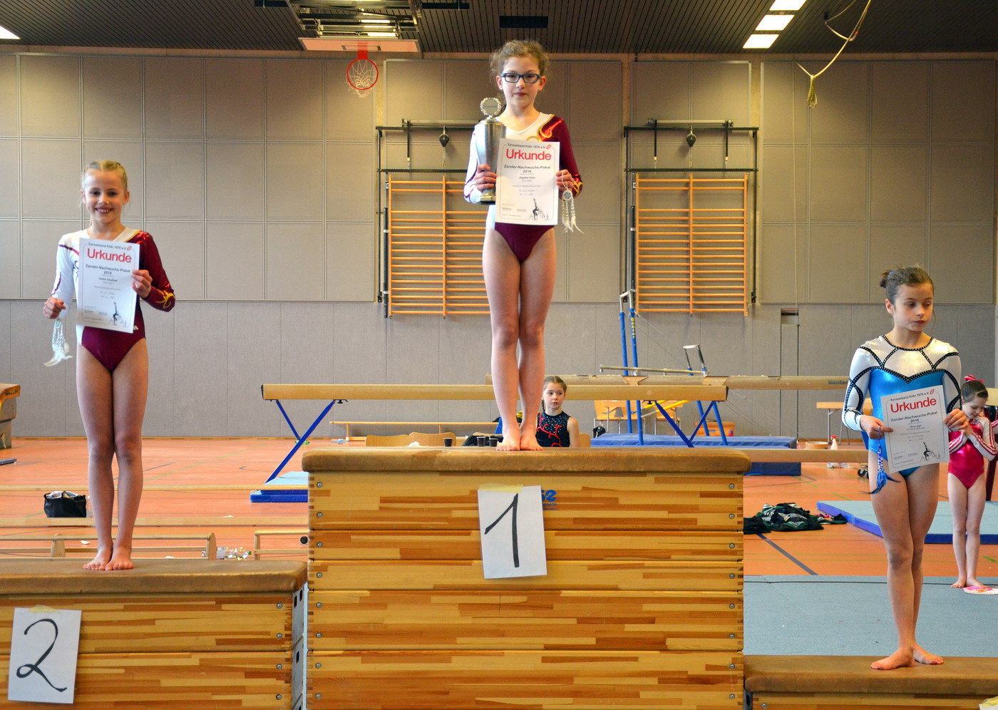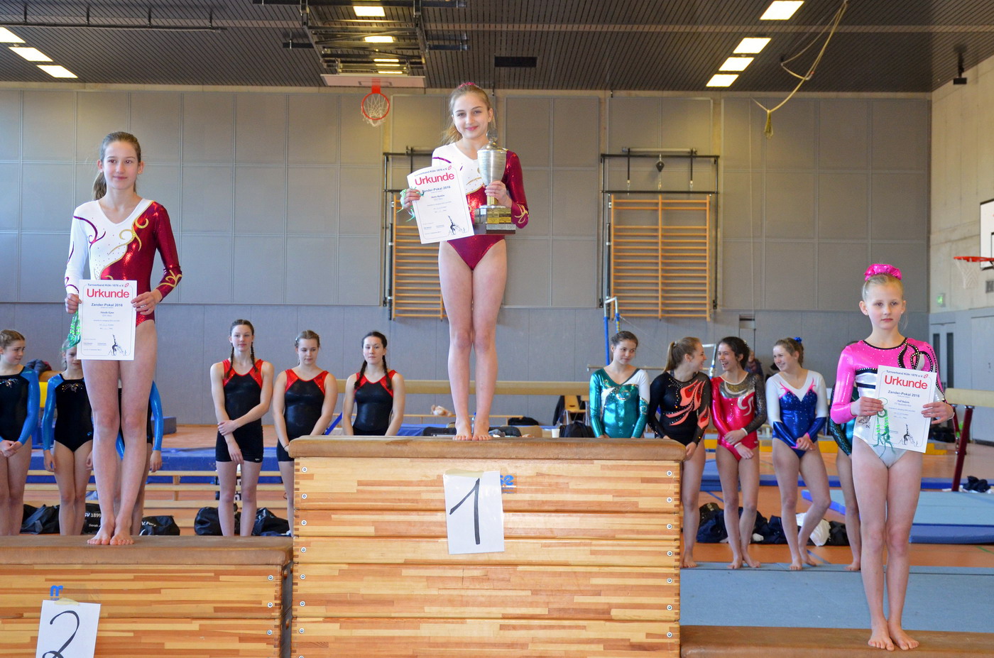 Erfreulich endete der Wettkampf im Zander-Pokal. Maria erreichte mit einem großen Punktvorsprung den ersten Platz und konnte somit den Zander Pokal in Empfang nehmen! Auf den zweiten Podestplatz konnte sich Natalie stellen, was eine erfreuliche Überraschung darstellte, da Natalie am Balken einen Sturz vorzuweisen hatte, die Leistung an den anderen drei Geräten reichte jedoch trotzdem für diese gute Platzierung.