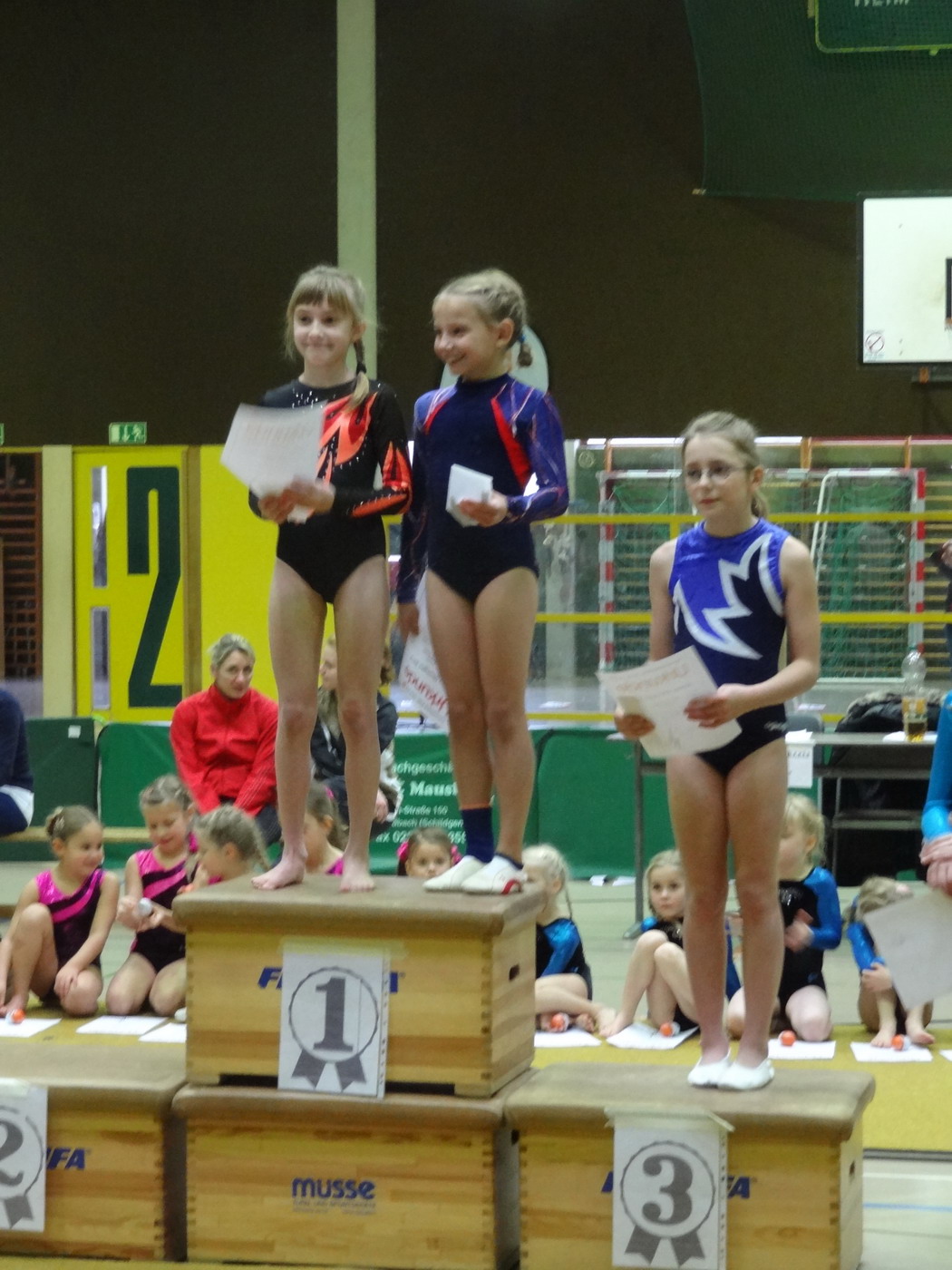Sarah Adolphs, für die es der erste Wettkampf war, turnte ohne große Aufregung eine schöne Bodenübung und einen sauberen Sprung. Am Barren und Boden traten noch kleine Unsicherheiten auf, die aber schnell vergessen waren, nachdem sie sich in der Gesamtwertung über einen tollen 6. Platz freuen konnte.
