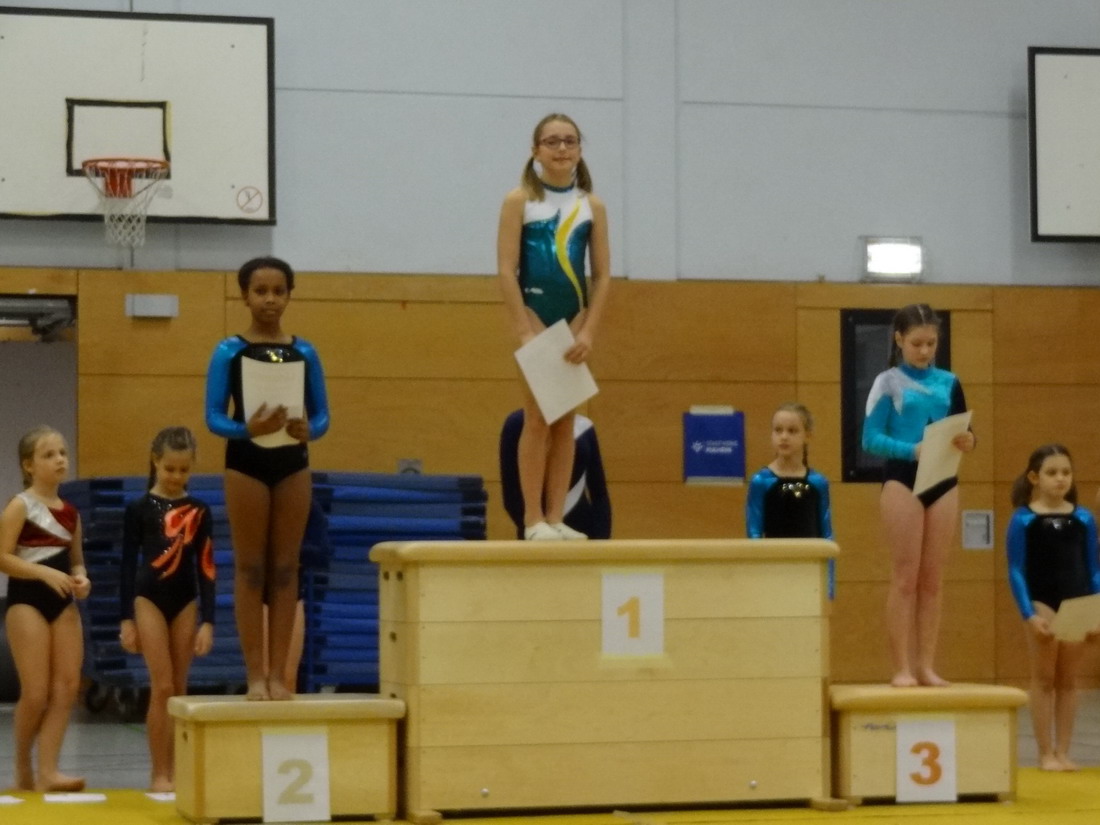 Im zweiten Durchgang ging Olivia Kalscheuer im Jahrgang 2003 an den Start. Sie begann ihren Wettkampf am Balken und musste direkt als erste Turnerin auf das "Zittergerät". Olivia zeigte eine saubere Übung und erhielt dafür 19,00 Punkte und damit die Höchstwertung gegenüber ihren Konkurrentinnen. Weiter ging es nun an den Boden. Olivia turnte ausdrucksstark und mit voller Körperspannung und konnte sich mit 17,55 wieder die höchste Punktzahl sichern. Spätestens war der Ehrgeiz geweckt, einen Platz auf dem Treppchen erreichen zu wollen. Als 3. Gerät folgte der Sprung. Olivia zeigte zwei dynamische Sprünge und sicherte sich damit 19,05 Punkte und wiederum die Bestwertung an diesem Gerät. Nun hieß es noch einmal alle Konzentration und Kraft zusammenzunehmen, um am letzten Gerät, dem Reck auch hoch punkten zu können. Olivia turnte hoch konzentriert und sehr sauber und erhielt für ihre Reckübung 19,10 Punkte. Bei der Siegerehrung durfte sie damit ganz oben auf das Treppchen und erturnte sich einen hervorragenden 1. Platz.