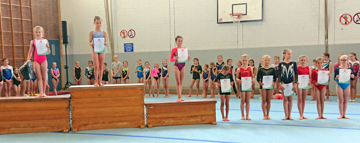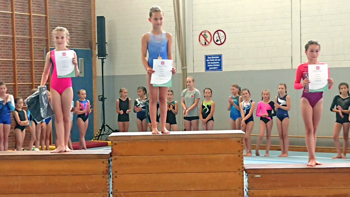 Sie begannen ihren Wettkampf am Barren, an dem sich Alina vor Lisa die Tageshöchstwertung erturnte. Auch Julia und Sarah konnten ordentlich punkten. Weiter ging es zum Balken, an dem sich diesmal Lisa vor Alina die Tageshöchstwertung sicherte. Am Boden zeigten alle Mädchen schöne Übungen und Sarah und Alina wurden mit den einzigen 17-er Wertungen an diesem Gerät in diesem Durchgang belohnt. Auch am Sprung hatte Alina wieder die Nase vorne, so dass sie sich bei der Siegerehrung verdient auf den obersten Treppchenplatz stellen durfte. Lisa patzte am Sprung, konnte sich jedoch noch über den 3.Platz freuen. Sarah platzierte sich auf dem 4. und Julia auf dem 6.Platz von insgesamt 40 Turnerinnen.