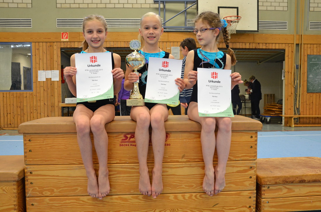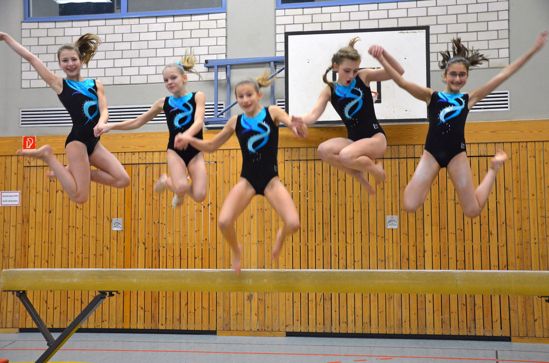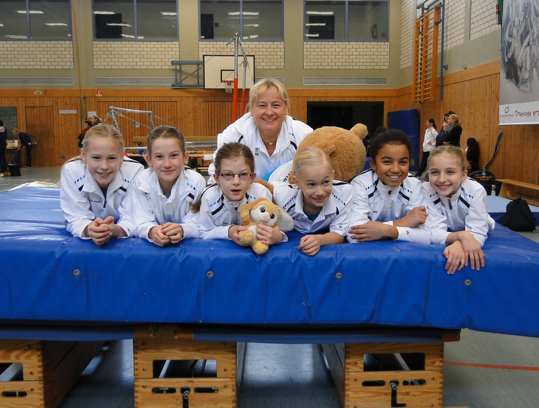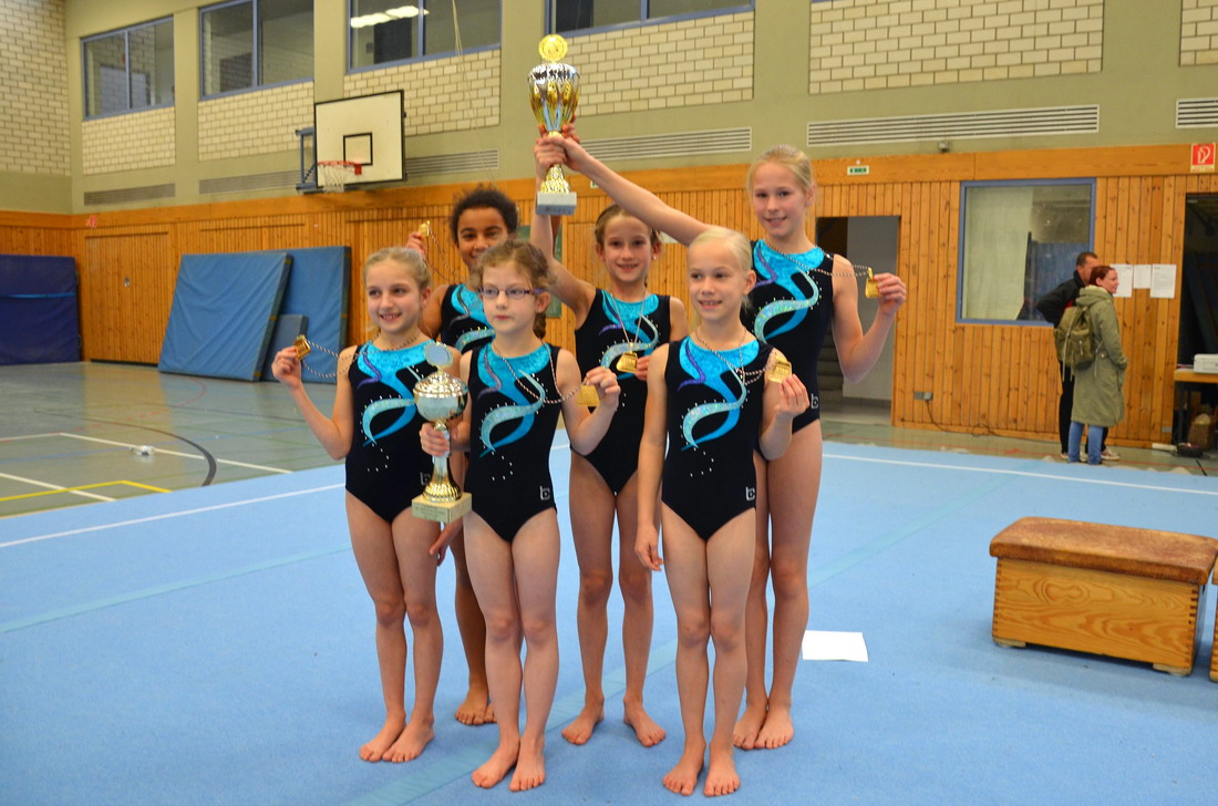 Als Titelverteidiger war die Mannschaft im Jahrgang 2000/01 angereist. Fenja-Sofie Frey, Pauline Friedrich, Anna Kulbach, Sarah Shirvani Zadeh und Jessica Haelke mussten jedoch ihre ganze langjährige Wettkampferfahrung ausspielen, denn nach 2 Geräten lagen sie noch auf dem dritten, etwas später jedoch schon wieder auf dem zweiten Rang. Ausgerechnet die starke Konkurrenz aus Barmen und Derendorf hatte den Zitterbalken schon hinter sich, während die Porzerinnen genau hier noch überholen sollten... Mit selten gesehener Sicherheit präsentierten alle Mädchen fehlerlos ihre Übungen und durften sich über die Verteidigung ihres Landesmeistertitels freuen.