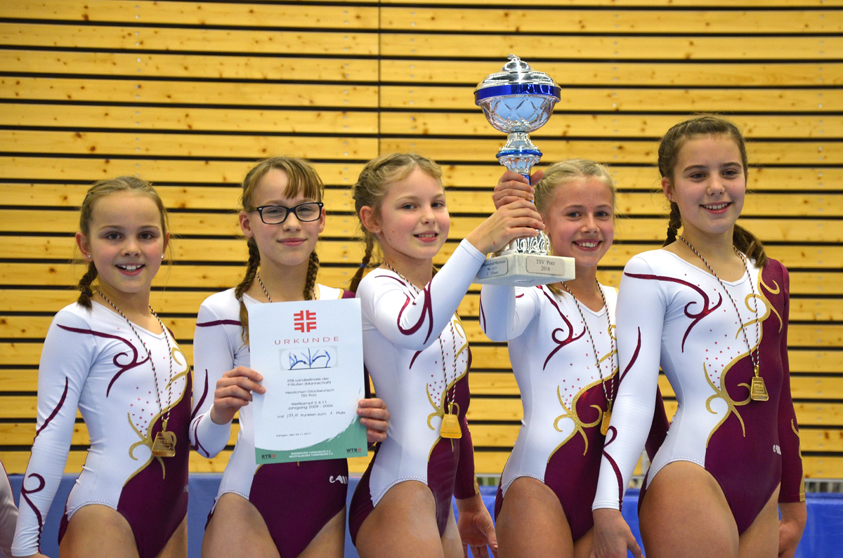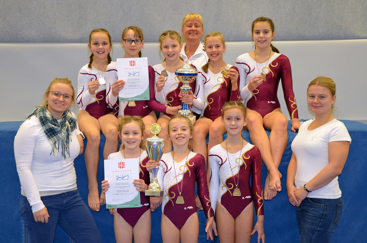 Auch Sarah Adolphs, Alina Bart, Julia Korn, Lisa Liesenfeld und Malina Wendland hatten sich für diesen Tag viel vorgenommen. Sie bestritten den Wettkampf in der gleichen Reihenfolge wie die jüngere Mannschaft. Am Barren und Balken sammelten sie gute 16er Wertungen. Am Boden waren die Wertungen etwas schlechter, dafür konnte Malina am Sprung sagenhafte 17,0 Punkte einfahren (Höchstpunktzahl ohne Abzug). Mit einer Gesamtpunktzahl von 197,1 Punkten gelang es der Mannschaft zum dritten Mal in Folge in dieser Altersklasse den Wanderpokal zu verteidigen und darf sich Landesmeister 2018 nennen und den Pokal nun in Porz behalten.