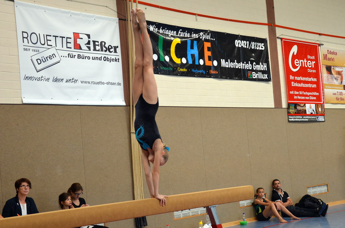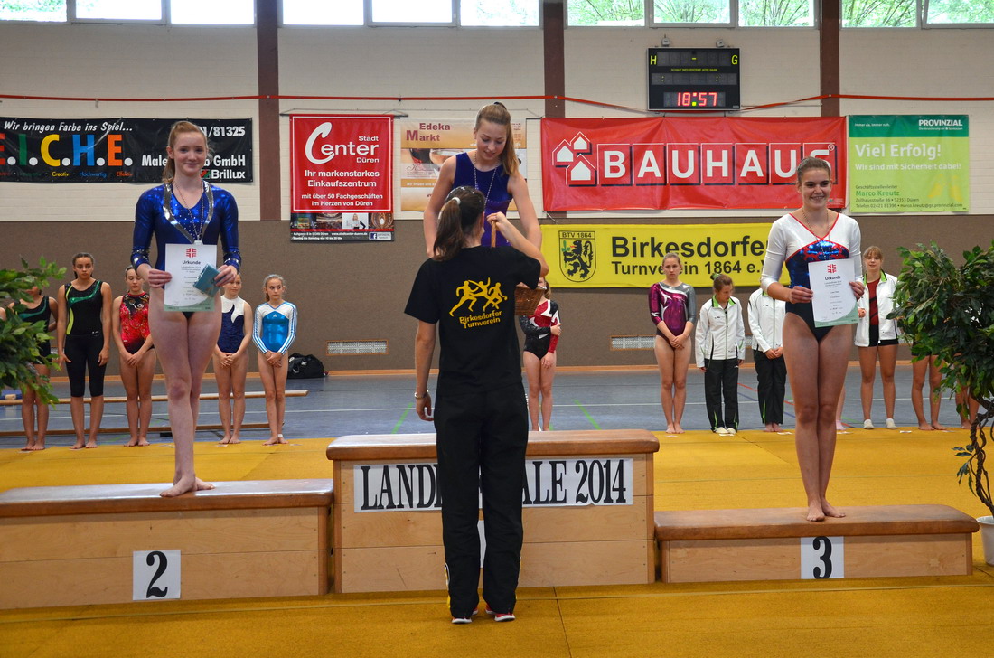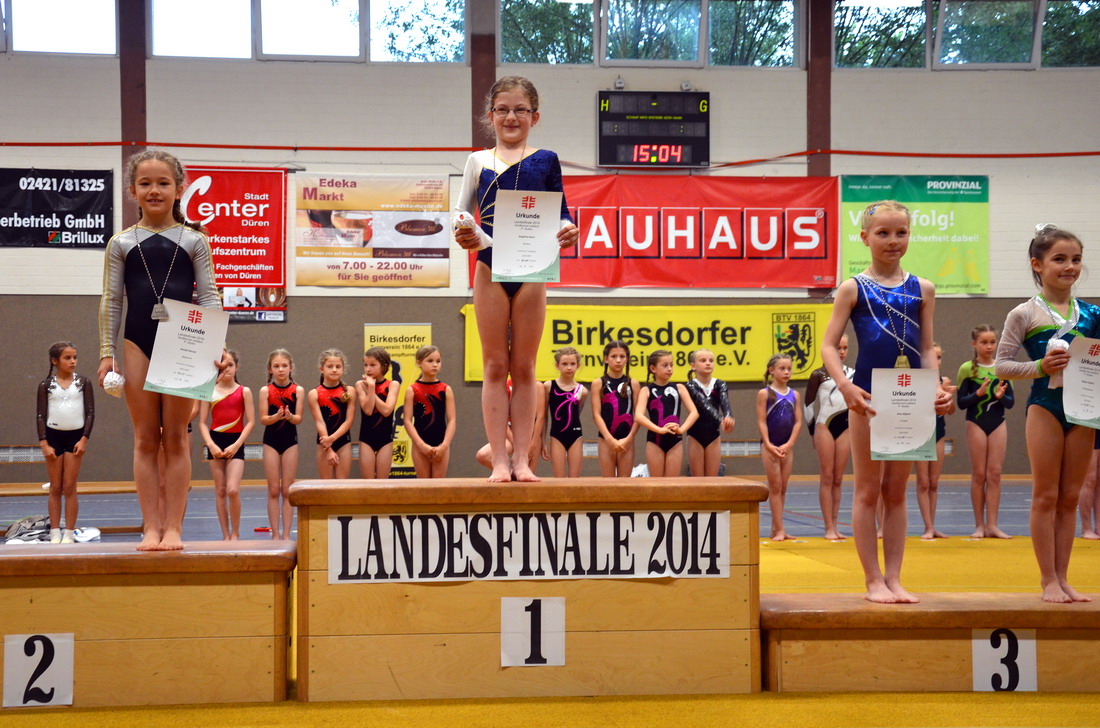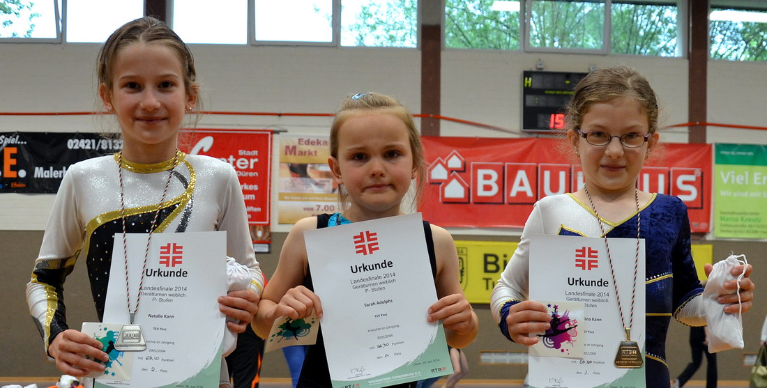 Acht Turnerinnen des Porzer Vereins konnten sich für die Titelkämpfe in Düren-Birkesdorf am 29. Juni 2014 qualifizieren. Insgesamt rund 215 Teilnehmerinnen traten in sechs verschiedenen Altersgruppen an, um die beste Turnerin des Rheinlandes im Pflichtbereich untereinander auszumachen. Die Sportlerinnen aus Porz starteten in vier Altersklassen. Unter den jüngsten RTB Turnerinnen starteten für den TSV Porz: Angelina Kann und Sarah Adolphs. Angelina präsentierte nach einer ordentlich geturnten Barrenübung am Balken eine extrem gute Leistung, bekam beinahe die höchstmögliche Note und platzierte sich damit an der Spitze der Konkurrenz. Auch ihre Leistung am Boden war nicht zu überbieten, so dass sich Angelina nach drei Geräten auf dem ersten Platz befand. Obwohl am Sprung nicht alles so gutging, wie es bei ihr möglich wäre, konnte sie doch den Titel der Landesmeisterin in ihrer Jahrgangsklasse gewinnen. Die Porzer Turnerin freute sich über den erreichten Sieg und die Goldmedaille.