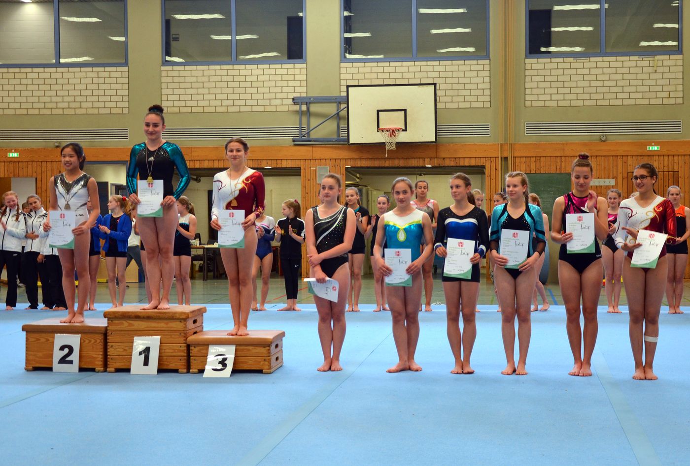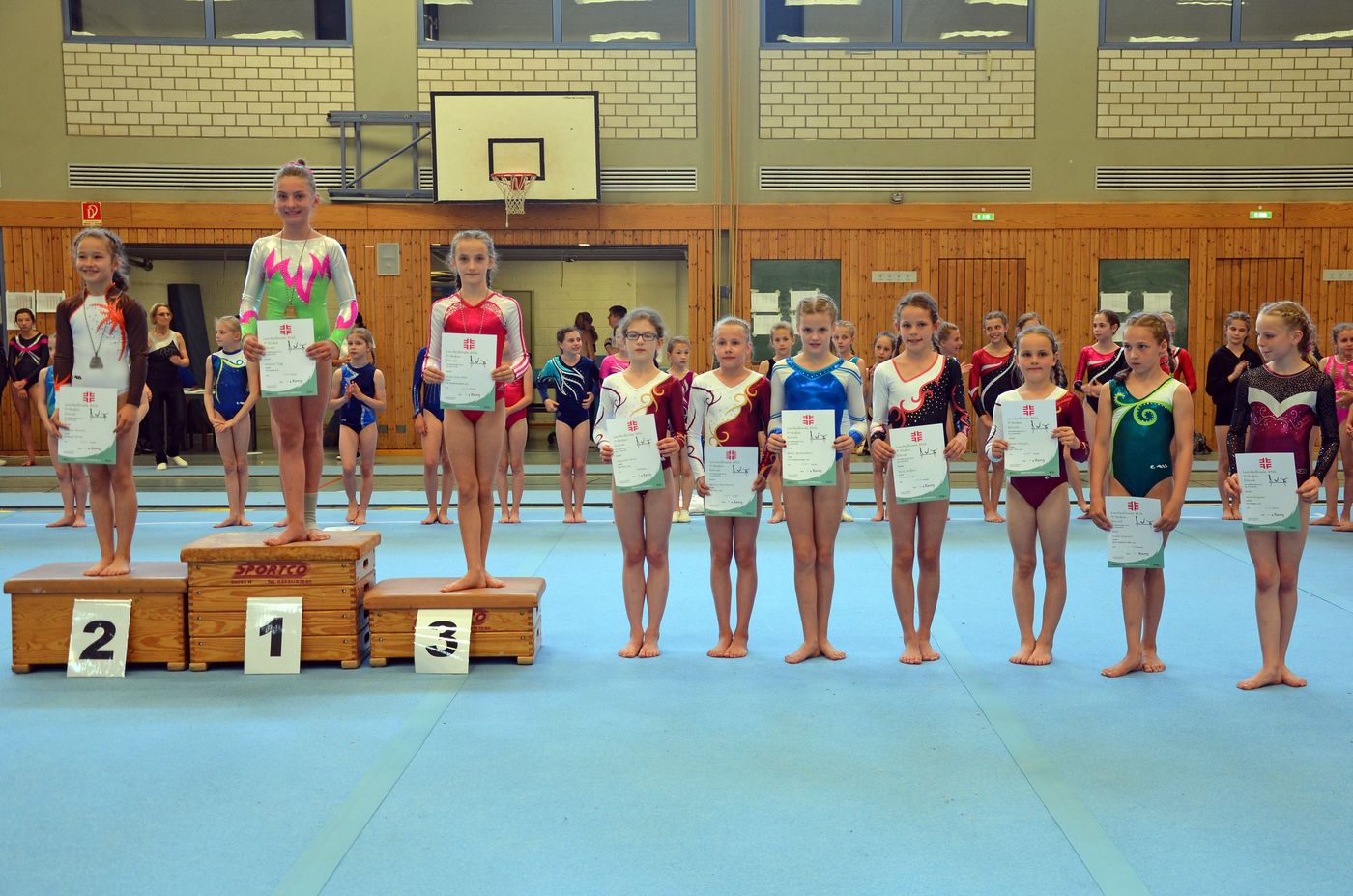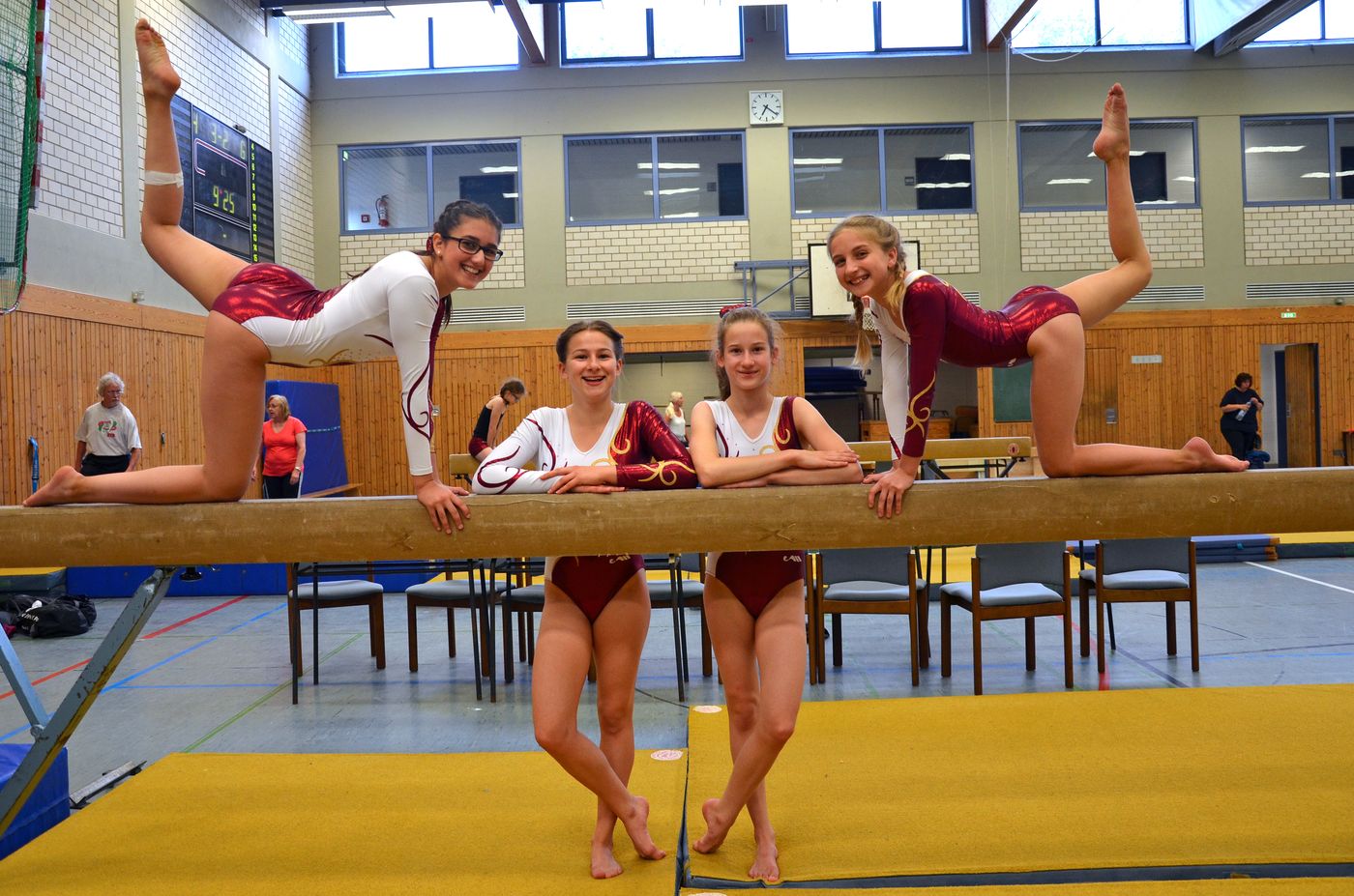 Parallel mit Julia turnten auch in ihrer eigenen Altersklasse Sarah, Malina und Angelina. Sie begannen ebenso am Sprung, wo Malina den 3. Platz belegte. Am Barren sorgten Angelina und Malina für eine kleine Sensation als die Beiden für ihre fehlerlosen Übungen die maximale 17-Punktewertung bekamen! Leider hat das Glück Malina am Balken verlassen, hier stürzte sie beim Rad vom Gerät und musste einen hohen Abzug hinnehmen. Angelina dagegen präsentierte ihre Übung sehr sicher und selbstbewusst, erntete dafür 16,45 Punkte und belegte den besten Platz an diesem Gerät. Am Boden zeigte Malina wieder ihre Klasse und präsentierte die beste Übung in der Konkurrenz. Sarah, die sich an allen 3 anderen Geräten immer unter den besten zehn Turnerinnen befand, bewies, dass sie eine starke Konkurrentin für Malina sein kann und belegte am Boden mit nur einem knappen Rückstand von 0,2 Punkten auf Malina den zweiten Platz.