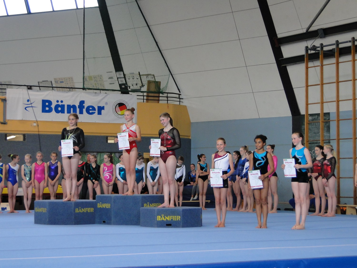 Die Konkurrenz der Mädels hatte einiges an Schwierigkeiten im Gepäck gehabt, insofern war schon vor der Siegerehrung klar, dass eine Qualifikation äußerst schwierig werden würde. Umso größer war dann die Freude als sich herausstellte, dass Cecile sich als dritte RTB-Turnerin (5. Im Gesamtklassement) für den Deutschland-Cup in Delitzsch bei Leipzig qualifiziert hatte! Herzlichen Glückwunsch! Die anderen drei haben die Qualifikation nicht erreicht, konnten aber dennoch stolz darauf sein, bei einem so hochwertigen Wettkampf an den Start gegangen zu sein. Natalie beendete den Wettkampf auf Rang 8, Pauline auf Rang 12 und Sarah, nach ihrem etwas unglücklich verlaufenen Vierkampf, auf Platz 32.