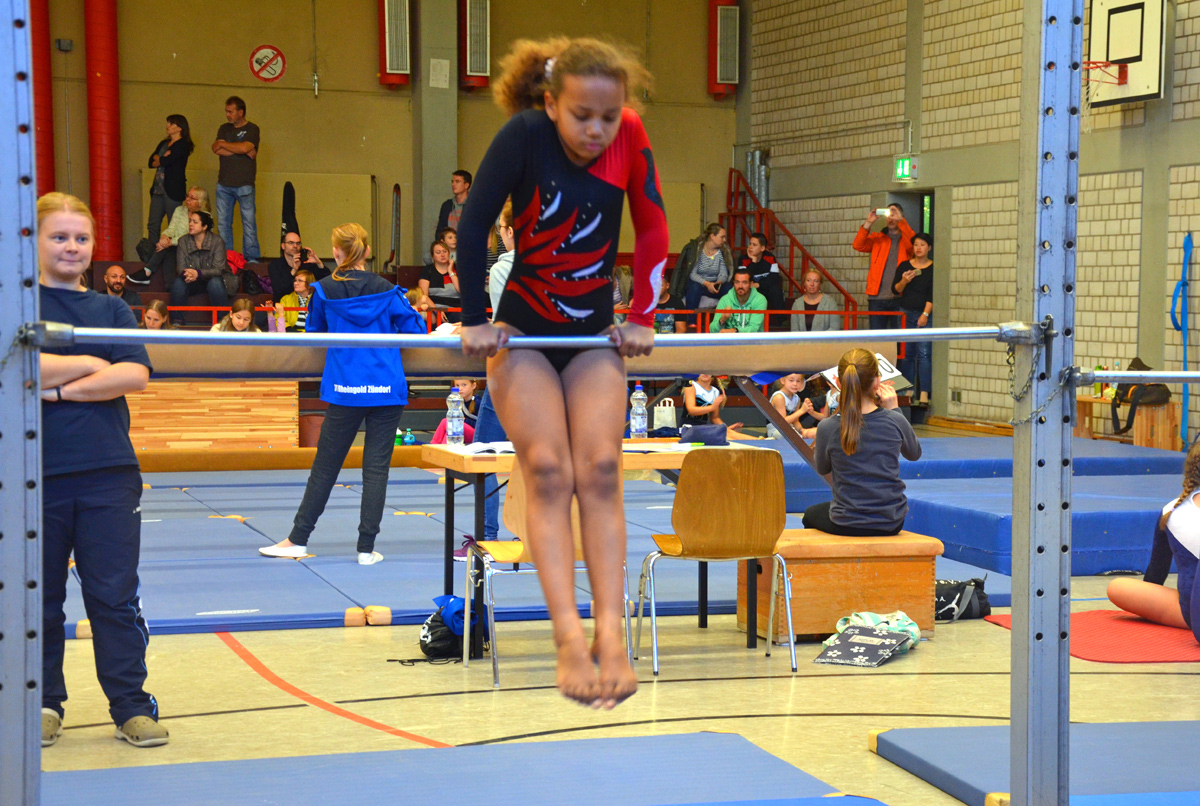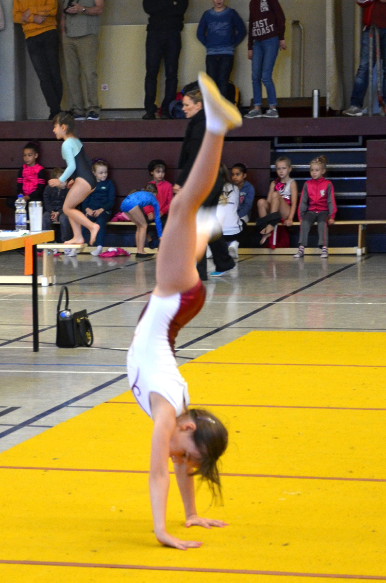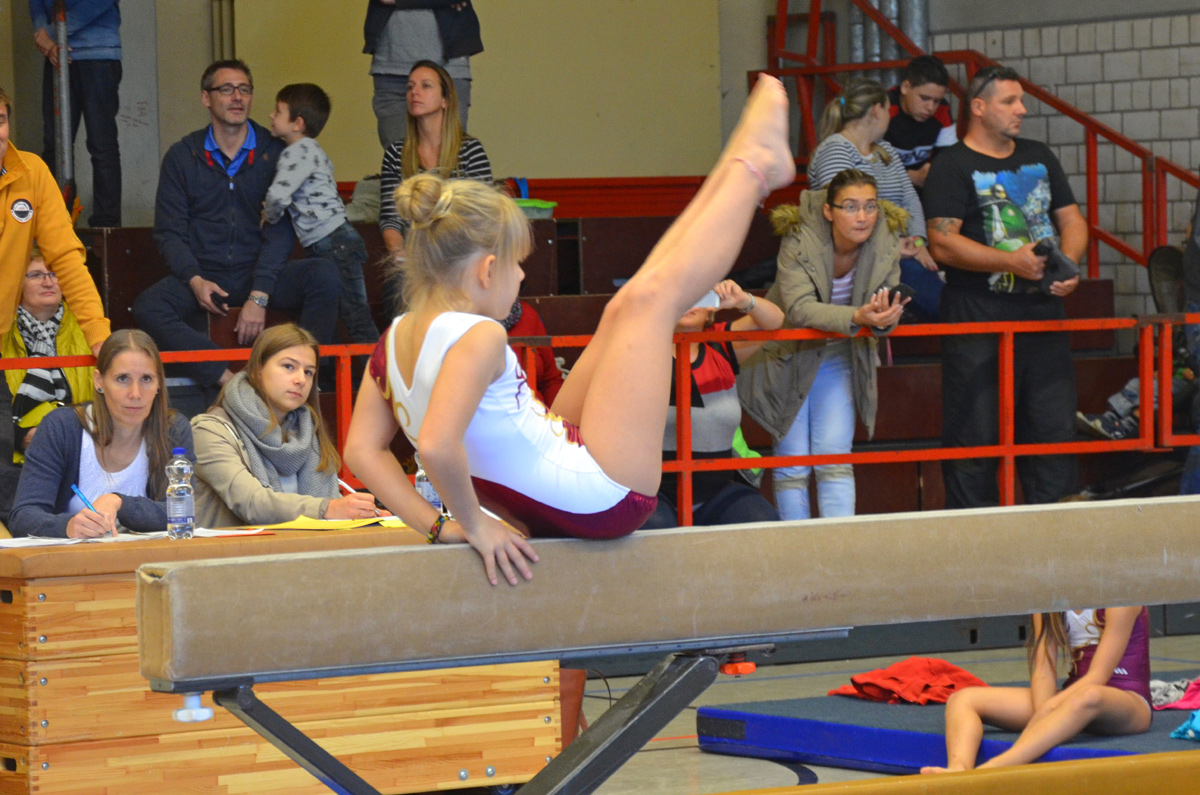 Pünktlich um 10 Uhr begann der Wettkampf. Nach der Begrüßung durch Josi Hartung, Vorsitzende der Finanzen, fing der Wettbewerb an. Zuerst durften sich die Sportlerinnen am ersten Gerät kurz einturnen und danach ging es mit den ersten Übungen los. Trotz, dass alle Mädchen sehr nervös waren, zeigten sie sehr schöne Übungen an allen Geräten, die vom Publikum mit lautem Applaus belohnt wurden. Natürlich lief aufgrund der Nervosität nicht alles so, wie es sich jeder einzelne erhofft hat, aber dafür ist dieser Wettkampf da. Um Erfahrung zu sammeln und immer sicherer zu werden, sodass man schon bald voll und ganz zufrieden mit seiner Leistung ist. Nichtsdestotrotz können alle Teilnehmerinnen sehr stolz auf sich sein, denn es gehört auch eine große Portion Mut dazu, vor Publikum und gegen so viele Konkurrenten an den Start zu gehen. Es herrschte volle Konzentration unter den Turnerinnen. Sie drückten sich gegenseitig die Daumen, feuerten sich an und wenn es sein musste, wurden auch tröstende Worte untereinander ausgetauscht.