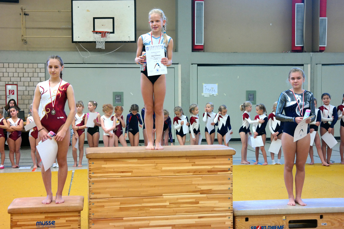 Nach ungefähr drei Stunden wurden die Sieger jeder Altersklasse ermittelt. Bei den jüngsten Turnerinnen (6 Jahre und jünger) siegte Liliana Friedrich (MTV Köln) , die Silbermedaille errang ihre Vereinskollegin Elina Hensch und Emilia Arzich vom TSV Porz freute sich über die Bronzemedaille. In der Altersklasse 7-8 Jahre gewann Alina Lelkov vom MTV Köln. Unter den 9-10 Jährigen erkämpfte sich den ersten Rang Louisa Kreikebaum vom ESV Gremberghoven. In der Altersklasse 11-12 Jahre konnte sich die Turnerin des TSV Porz Venotjari Greving über die Goldmedaille freuen. Bei den ältesten Turnerinnen (13 Jahre und älter) siegte Maya Kreikebaum vom ESV Gremberghoven.