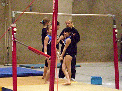 Unsere Mannschaft begann den Wettbewerb am Stufenbarren. Nachdem Betül, die als erste an der Reihe war, ihre Übung verturnte, mussten sich die Anderen mobilisieren um ihre Übungen fehlerlos zu turnen. Das gelang ihnen und die Wertungen waren auch zufrieden stellend. Die Noten von Karolina und Mahsa gehörten zu den 6 Besten an diesem Gerät!