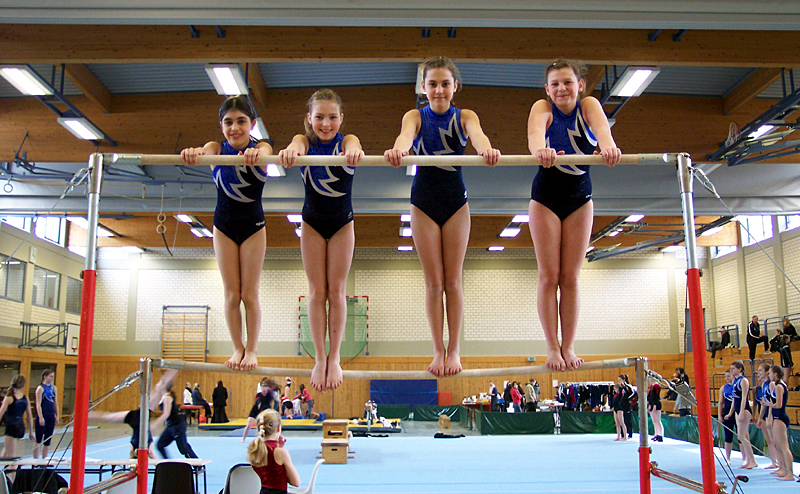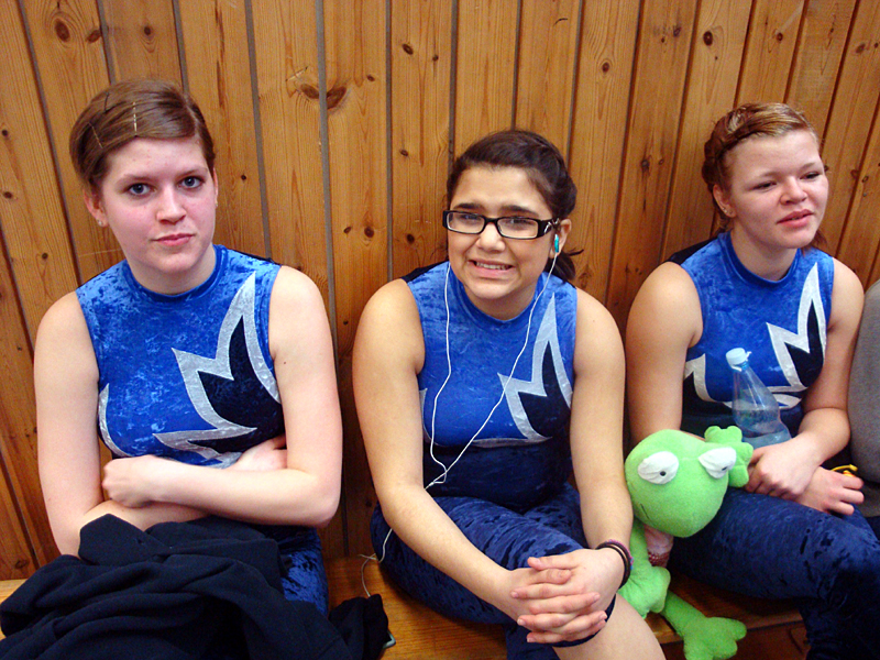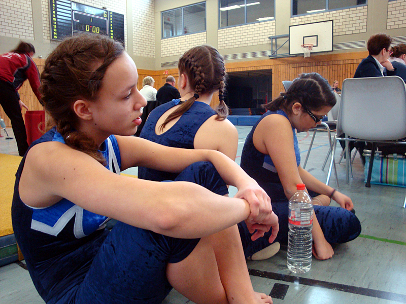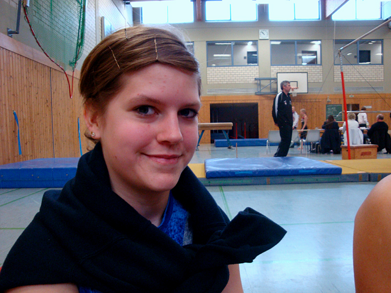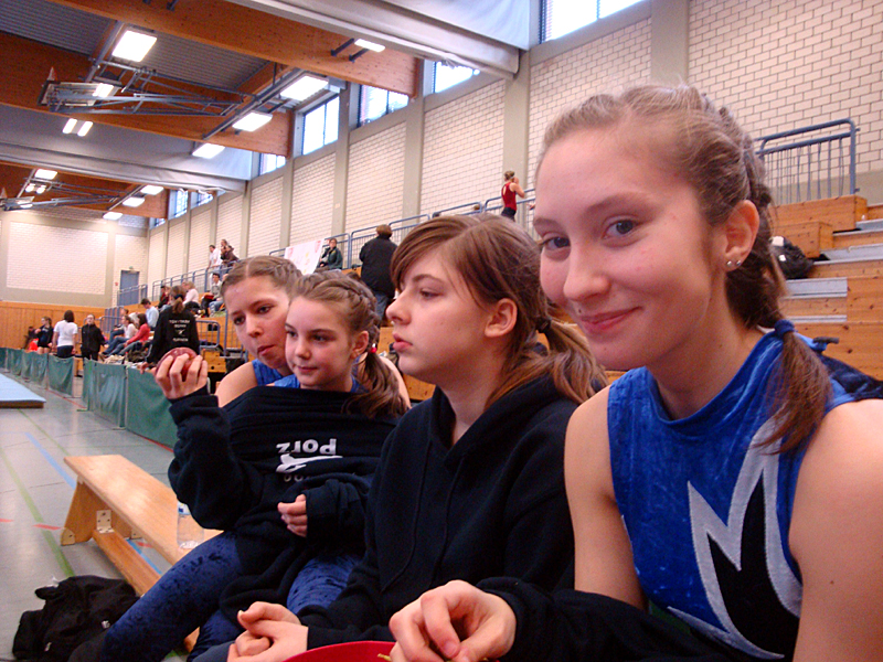 Nur Ronja, die schon einige Ligaeinsätze aufzählen konnte, stürzte nicht. Sie zeigte eine ordentliche Balkenübung und wurde dafür mit der drittbesten Note belohnt. Trotz eines katastrophalen Ergebnisses am Schwebebalken fingen sich die Mädchen am Boden wieder und landeten in der Gesamtwertung auf Rang fünf. Die besten Porzer Turnerinnen im Vierkampf in der Einzelwertung waren: Ronja - fünfte, Jasmin - sechste, Pauline - siebte und Kim - achte.