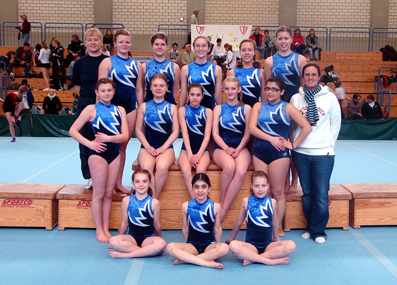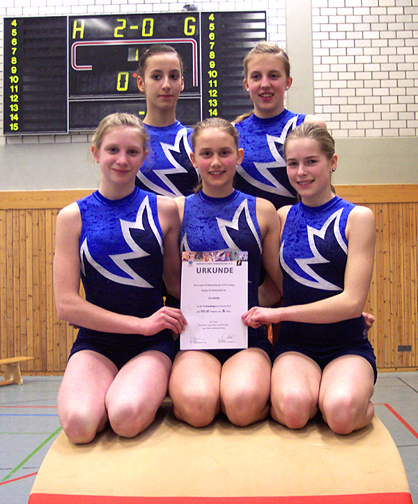 Am Tag danach wurde ebenfalls in Essen der Verbandsliga-Wettkampf ausgetragen. Hier trat die erste Mannschaft des TSV an (Anne Klein und Isabel Klein, Inga Köller, Michelle Blum und Lena Woizenko), die bereits in der vorherigen Saison in der Landesliga 1 turnte. Nachdem im Vorjahr aufgrund einer Reorganisation der Liga die Mannschaft aufgestiegen war, waren die Erwartungen nicht so hoch. Trotz der intensiven Arbeit, gelang es den Turnerinnen noch nicht, die Anforderungen der KM 2 zu erfüllen. Nur am Sprung und am Balken konnte die Mannschaft mit der Konkurrenz mithalten. Inga belegte sogar am Sprung den fünften und am Balken den sechsten Platz. Anne und Isabel platzierten sich am Balken auch unter den besten Zehn. Die größten Defizite stellte man am Barren fest. Hier probierten alle Mädchen neue Elemente, die leider nicht ganz ohne Fehler geturnt wurden, oft folgten Stürze. Auch am Boden fanden sich einige Mängel, besonders bei den akrobatischen Elementen. Die Mannschaft beendete den Wettkampf auf dem achten Rang.
