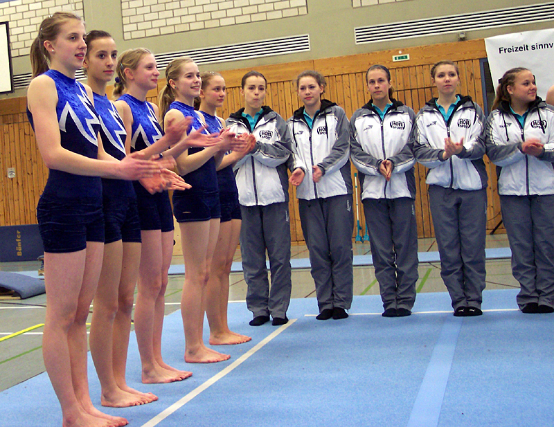 Am Samstag gingen die zwei Landesligamannschaften an den Start. Die eine Mannschaft der Landesliga 4, TSV Porz (2) mit den Turnerinnen: Sandra Bartusek, Marlen Dietze, Hanna Huckstein, Serenay Karas, Kim Kopper, Sarah Maser, Jasmin Rahier und Dimitra Voultsidou, konnte schon im letzten Jahr Erfahrungen sammeln. Nachdem die Mädchen in der letzten Saison die ersten Schritte in der RTB-Liga wagten, steigerten sich ihre Leistungen in diesem Wettkampf deutlich. Kim belegte den dritten Platz am Sprung und den Neunten am Barren. Marlen zeigte eine schöne Übung am Balken und wurde hier Fünfte. Ebenso platzierten sich Jasmin am Balken und Sarah am Barren unter den besten zehn. Dank der guten Einzelleistungen beendete diese Mannschaft den Wettkampf mit 143,70 Punkten auf dem vierten Rang.