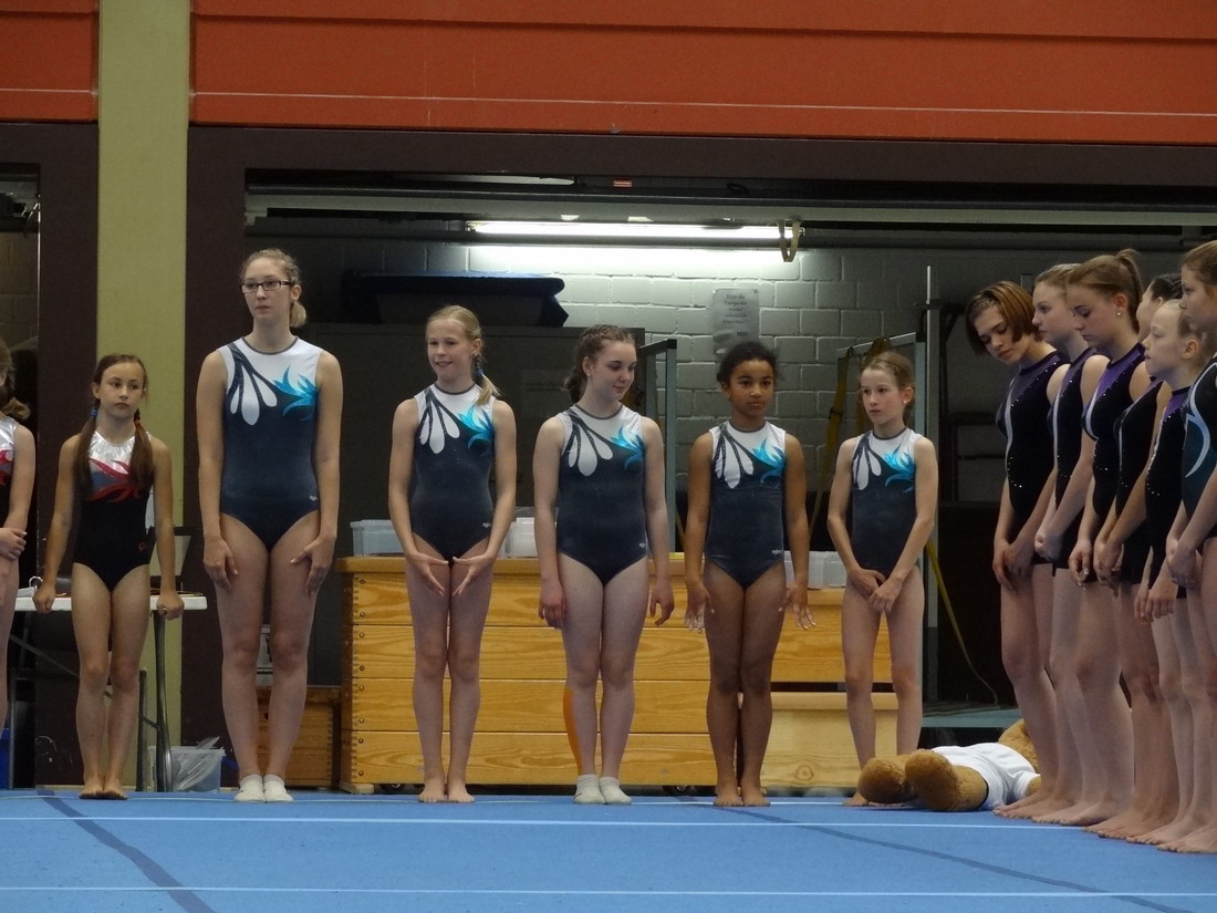 Die Mädchen starteten an diesem Wettkampftag am Balken. Beim Einturnen waren noch kleine Unsicherheiten zu erkennen und es mussten die letzten Kleinigkeiten verbessert werden. Ziel musste es sein, dass keines der Mädchen das Gerät verlassen muss, da ein Sturz einen ganzen Punkt Abzug bringen würde. Kim turnte als erste aus der Mannschaft und konnte ihre Übung ohne Sturz beenden. Als nächstes ging Anja an das Gerät und auch sie turnte eine sehr ordentliche Übung, für die sie die höchste Punktzahl der Mannschaft erhielt. Als dritte Turnerin musste Natalie auf den Zitterbalken und auch sie turnte sauber durch, stand das Rad sicher, was im Einturnen noch nicht so recht klappen wollte und erhielt 11,90 Punkte. Serenay hatte an diesem Tag nicht so viel Glück, hatte einige Wackler in ihrer Übung und stürzte beim Saltoabgang, so dass ihr Wert nicht in die Mannschaftswertung mit einging. Nach dem ersten Gerät lag der TSV mit mehr als 3 Punkten vor dem direkten Konkurrenten in der Riege. Ein guter Auftakt in diesem ersten Wettkampfdurchgang.