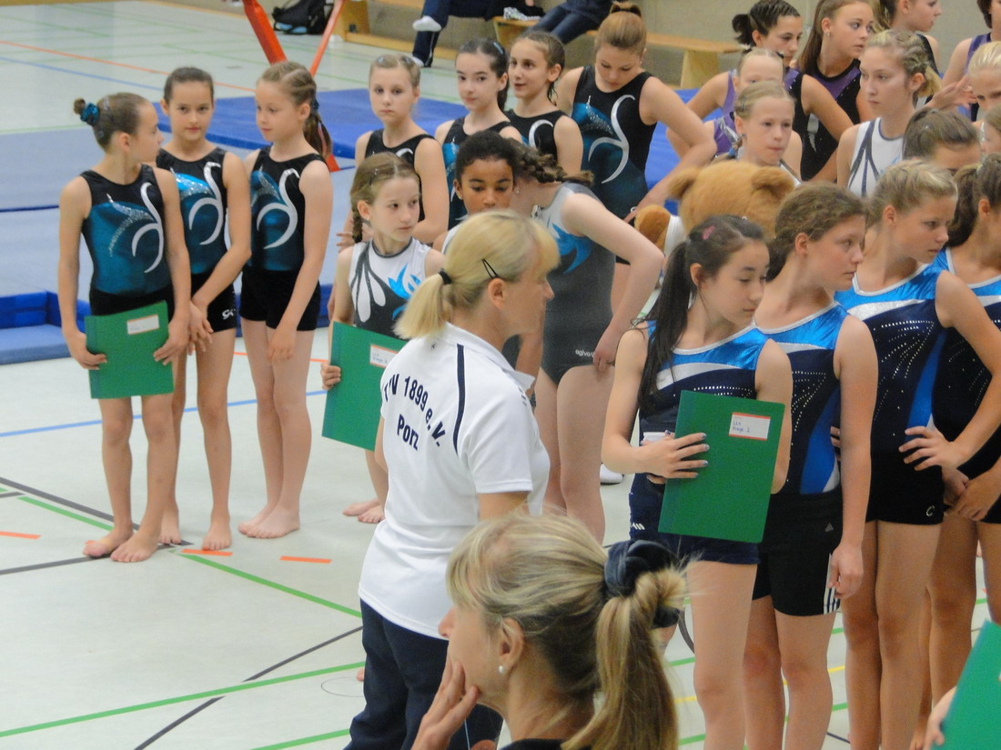 Der letzte Gerätewechsel führte die Turnerinnen an den Barren. Nun mussten noch einmal alle Kräfte mobilisiert werden, um sich zumindest den 5. Platz vom ersten Wettkampf wieder sichern zu können. Cecile eröffnete den Wettkampf am Barren und erkämpfte sich 11,80 Punkte. Als nächstes konnte Natalie 11,45 Punkte für die Mannschaft sichern. Kim und Serenay folgten noch als Turnerinnen und bekamen für ihre Übungen jeweils 11,35 Punkte. Im direkten Vergleich zum Riegenkonkurrenten hatte die Mannschaft am Barren jedoch 1,5 Punkte verloren. Nun hieß es zittern bis zur Siegerehrung. Alle rechneten mit dem 5. oder 6. Rang. Umso größer war die Freude bei der Siegerehrung. Die Mädchen des TSV konnten sich in diesem 2. Liga WK in Mülheim an der Ruhr sogar den 4. Platz erturnen. Nun können alle entspannt auf den letzten Wettkampf im Oktober blicken.