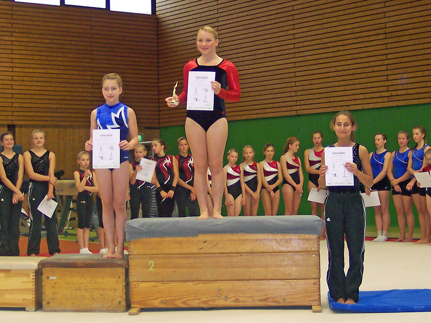 Am letzten Gerät des Wettkampftages galt es, die Führung zu behalten. Hier fehlte ebenso eine Turnerin, Jessica Haelke, die eine sehr gute Bodenübung präsentieren hätte können. Aber die Mannschaftskolleginnen turnten ihre Übungen auch fast fehlerlos und bekamen dafür entsprechend gute Wertungen. Mit einem Vorsprung von 2,45 Punkten gewannen die Porzerinnen den 3. Ligawettkampf und ernteten 10 Rankingpunkte, die wiederum den Saisonsieg und den Aufstieg in die Landesliga 2 ermöglichten. Die Mädchen freuten sich über den Siegerpokal, die Goldmedaillen und die T-Shirts mit dem Aufdruck “Sieger der RTB-Liga”. In der Saisoneinzelwertung wäre Pauline beinahe die beste Landesliga 3-Turnerin. Sie hat den Mehrkampfsieg nur um 0,1 Punkte verloren, sie erreichte den zweiten Rang. Auch in den Geräteeinzelwertungen platzierten sich die Turnerinnen aus Porz unter den besten drei. Am Barren war Mahsa die beste, und Pauline die zweitbeste Turnerin der Saison. Am Boden erkämpfte sich Pauline den Meistertitel, gefolgt von Michelle, die auch den zweiten Platz am Sprung erreichte.