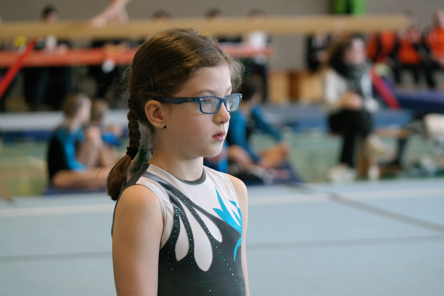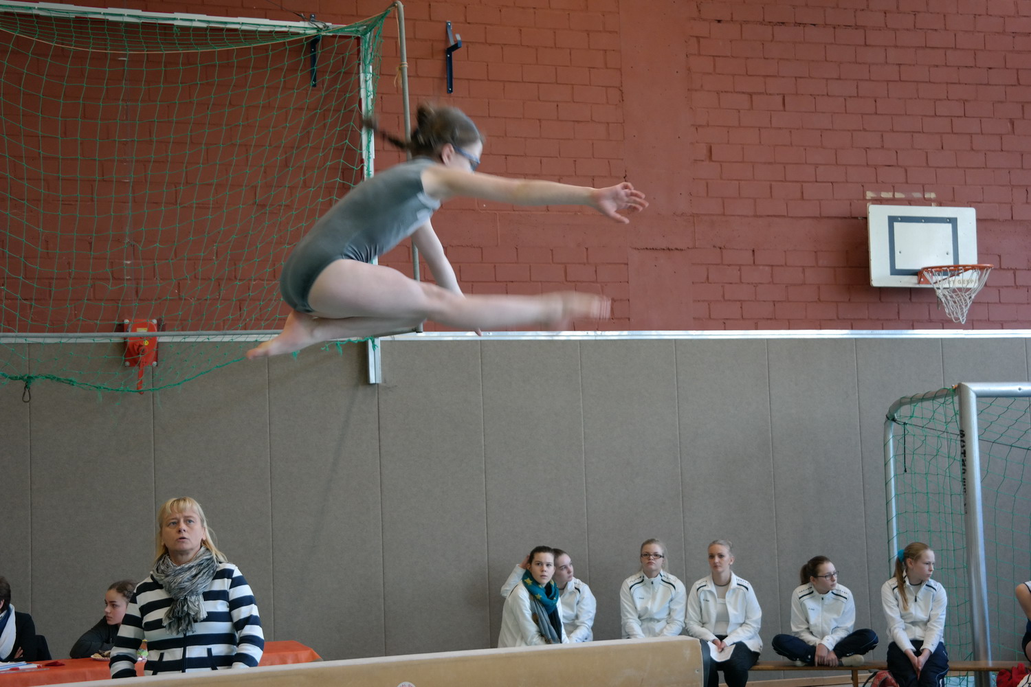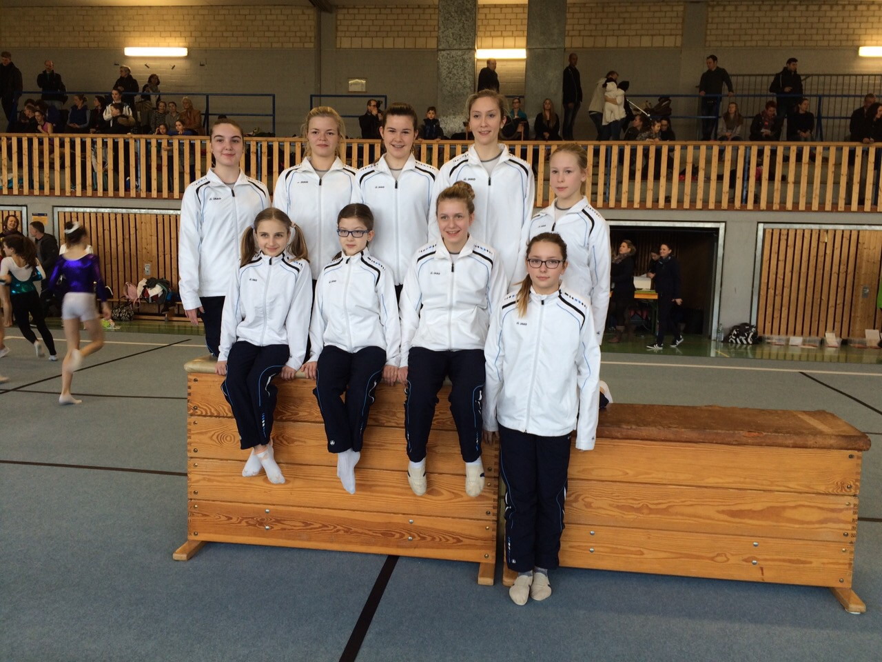Bei diesem ersten Wettkampf startete die Mannschaft am Sprung. Kim, Anja, Meret und Serenay zeigten gelungene Sprünge und sammelten wichtige Punkte für eine gute Position im Wettkampf. Nach olympischer Reihenfolge ging es anschließend zum Barren. Hier turnten Anja, Maria, Angelina und Kim. Im Gegensatz zur letzten Saison schaffte die Mannschaft es, sich mit sauberen Übungen die zweithöchste Mannschaftswertung an diesem Gerät zu erturnen. Zur Freude aller, führten die Turnerinnen des TSV Porz nach zwei Geräten. Hoch motiviert, zumindest einen Treppchenplatz zu halten, gingen Maria, Angelina, Kim und Meret an den Balken. Maria zeigte eine saubere und ansprechende Übung und erhielt die zweitbeste Tageswertung. Als letztes ging es zum Boden. Kim turnte zuerst und zeigte bis auf kleine technische Unsicherheiten beim Flick, eine saubere Bodenkür. Als nächstes ging Angelina an den Start. Auch sie sicherte mit 12.60 wichtige Punkte für die Mannschaftswertung. Nun war Meret an der Reihe, die zum ersten Mal in einem Wettkampf einen Flick zeigte. Den Abschluss machte Maria, mit einer technisch und künstlerisch sehr sauberen Übung, für die sie die Tageshöchstwertung der LL 4 erhielt.