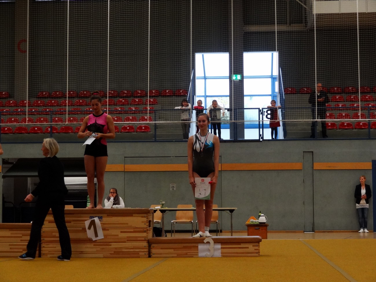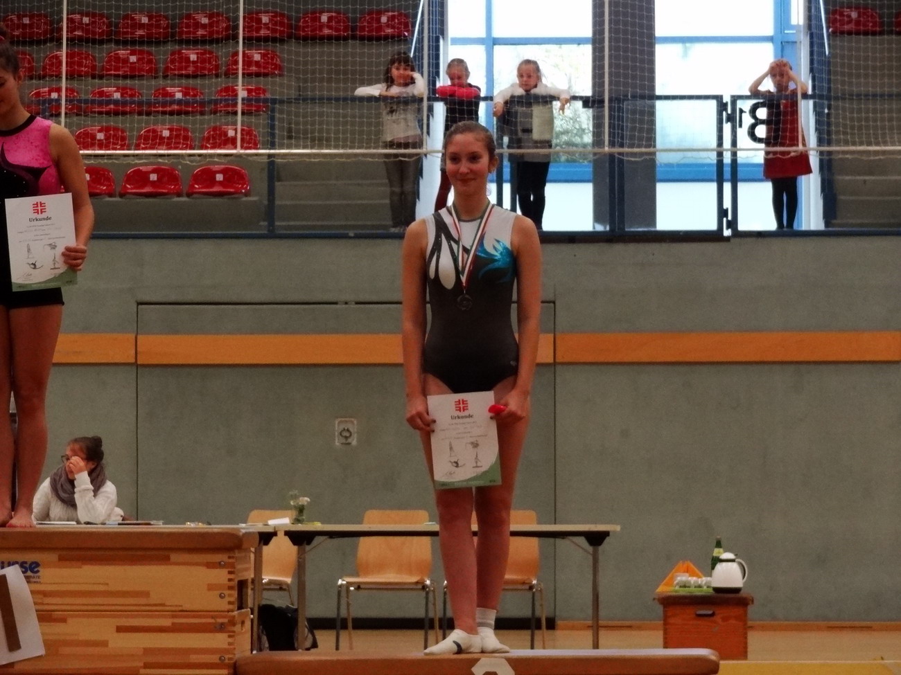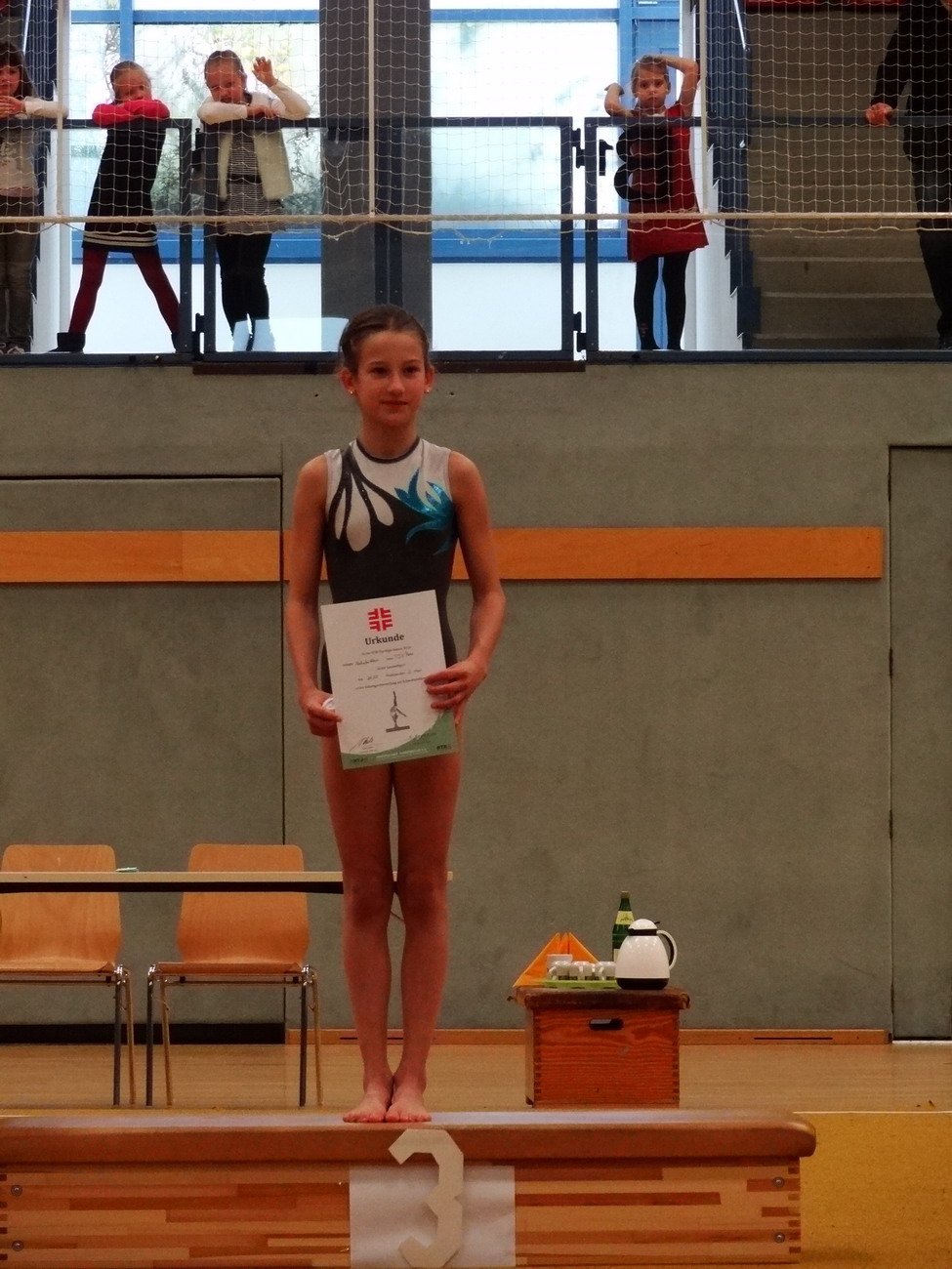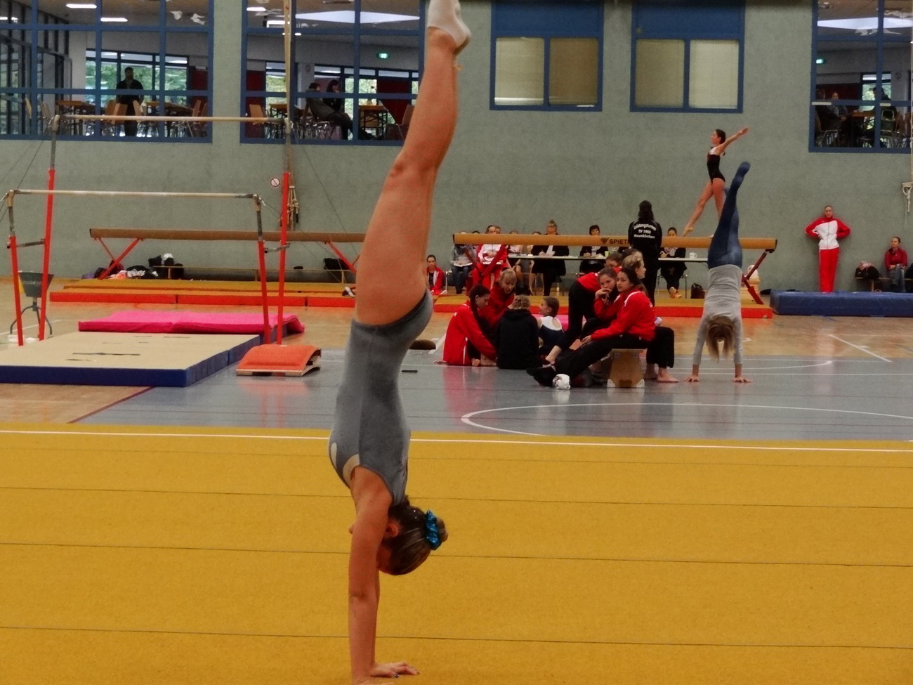 Beim letzten Wettkampf turnten Kim Kopper, Meret Herrenbrück, Julia Fuchs, Natalie Kann, Maria Moisseyenko, Anja Woizenko und Serany Karas. Aber auch die restlichen Mannschaftsmitglieder (Olivia Kalscheuer, Marlen Dietze und Jasmin Rahier) waren mitgekommen, um die Turnerinnen anzufeuern und mental zu unterstützen. Bei diesem letzten Wettkampf startete die Mannschaft am Barren. Kim, Anja, Maria und Natalie turnten ihre Übungen sauber durch und erhielten gute Punktzahlen. Trotzdem muss für die neue Saison weiter an den Übungen gefeilt werden, um mit den anderen Mannschaften mithalten zu können. Als nächstes ging es an den Balken. Hier traten Meret, Natalie, Kim und Maria an. Bei einigen war die Aufregung groß, aber alle konnten ihre Übungen ohne Sturz und größere Wackler durchturnen. Am dritten Gerät, dem Boden, turnten Kim, Julia, Natalie und Maria. Leider schlichen sich kleine Unsauberheiten in, die wertvolle Punkte kosteten und die Mannschaft musste somit am Sprung noch einmal alle verbleibenden Kräfte mobilisieren um diesen Rückstand eventuell aufholen zu können. Kim, Meret, Serenay und Anja gaben ihr Bestes und schafften es damit an diesem Tag, das beste Mannschaftsergebnis am Sprung zu erturnen. Nun wartete man gespannt auf die Siegerehrung und war überrascht und erfreut zugleich. Zwar erreichte die Mannschaft bei diesem 3. Liga WK der Saison "nur" den 5. Platz, konnte sich aber dafür in der Gesamtwertung aller drei Wettkämpfe auf Rang 4 platzieren. Außerdem erzielten einige Mädchen erfreuliche Ergebnisse in den Saisoneinzelwertungen. So erreichte Natalie am Barren und Balken den 3. Platz in der Geräteeinzelwertung. Kim konnte sich mit 143,95 Punkten den 3. Platz in der Mehrkampfwertung sichern. Herzlichen Glückwunsch allen Turnerinnen zu diesen Erfolgen.