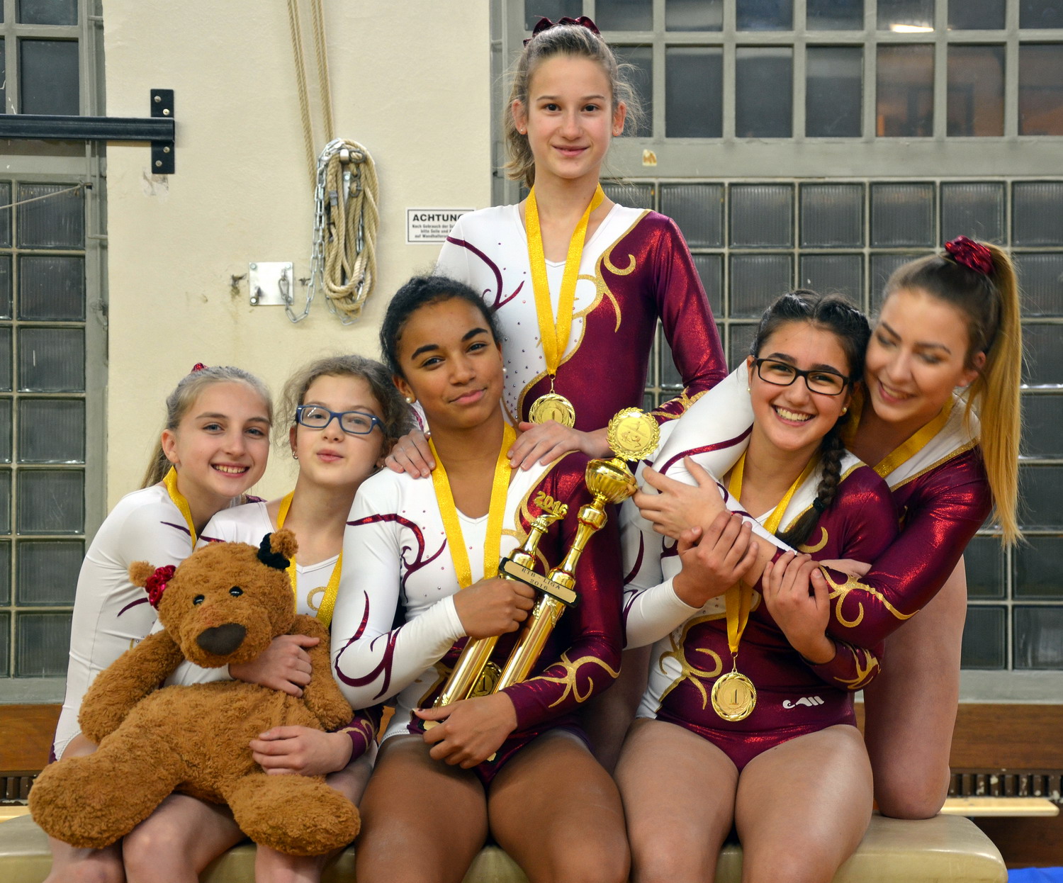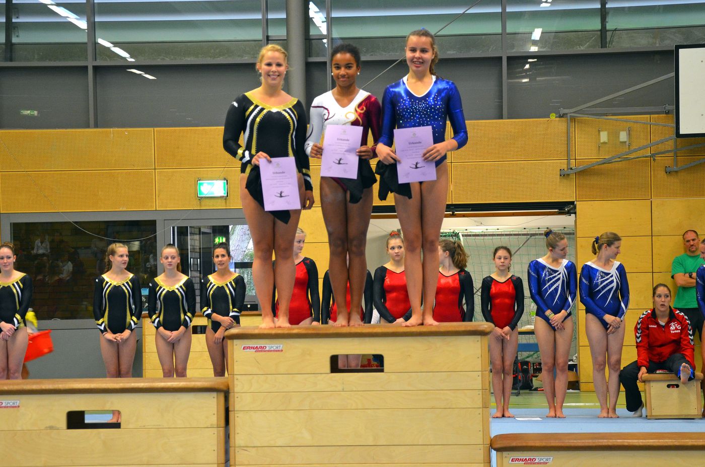 Die Siegerehrung umfasste dieses Mal eine ganze Reihe an Ehrungen, da es sich um das Finale der gesamten Saison handelte. Die Mannschaft des TSV Porz hatte am dritten Wettkampftag so Gas gegeben, dass sie sich mit knapp drei Punkten Vorsprung auf das Siegerpodest stellen konnte. Dies war im Vorfeld so nicht erwartet worden, dementsprechend war die Freude groß. Darüber hinaus konnte sich Natalie über den Gesamtsieg am Schwebebalken und Cecile über die Bestplatzierung am Boden (gemeinsam mit zwei weiteren Turnerinnen) freuen. Nun wurde es wirklich spannend, denn nach so unterschiedlich verlaufenen drei Wettkämpfen war das Endergebnis überhaupt nicht vorherzusehen. Mannschaft um Mannschaft wurde aufgerufen und die Freude und Aufregung war den Turnerinnen immer deutlicher anzusehen.
