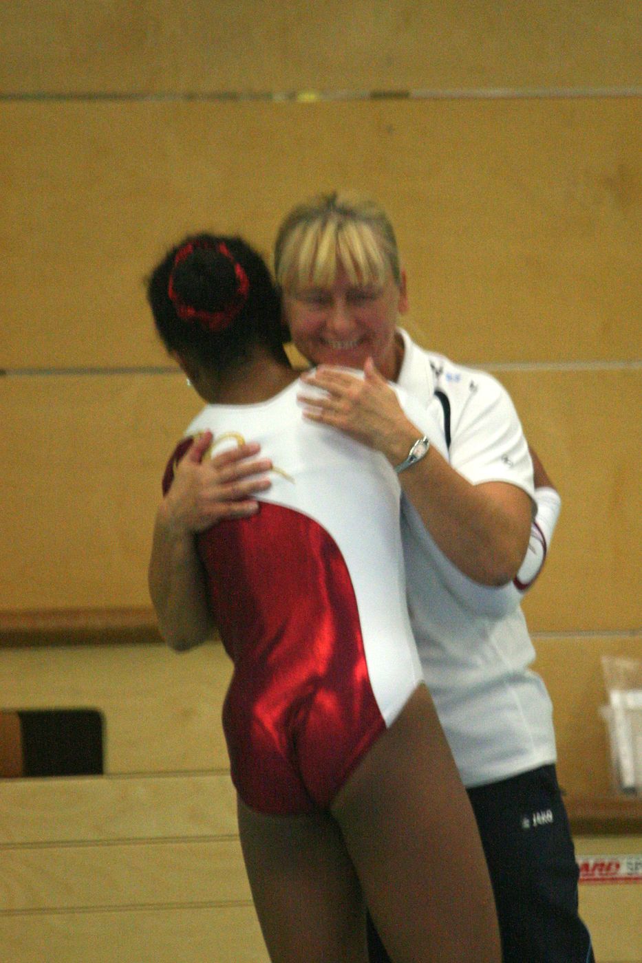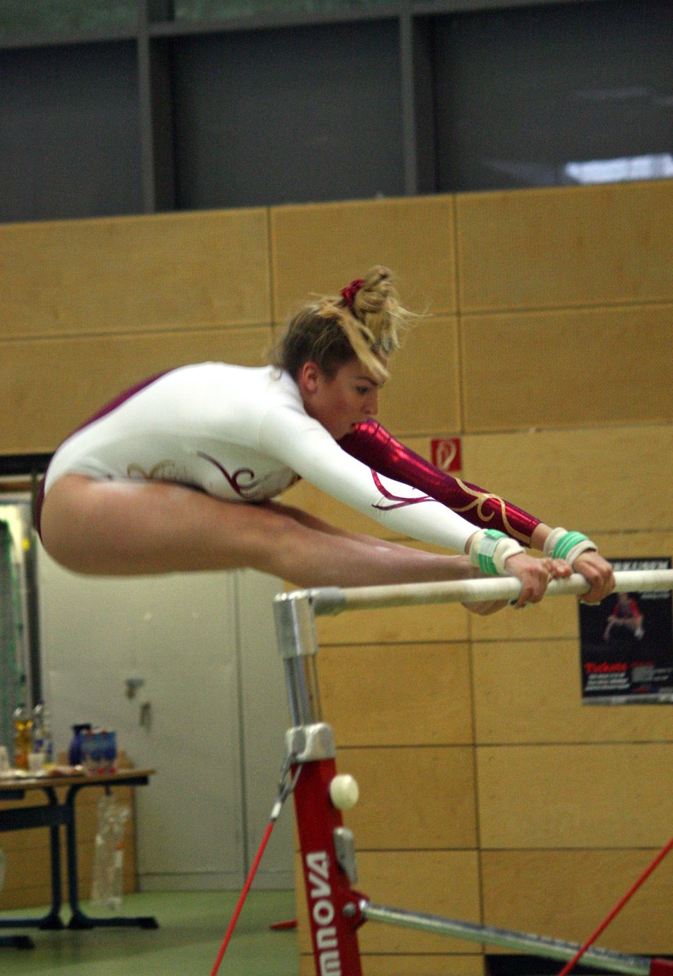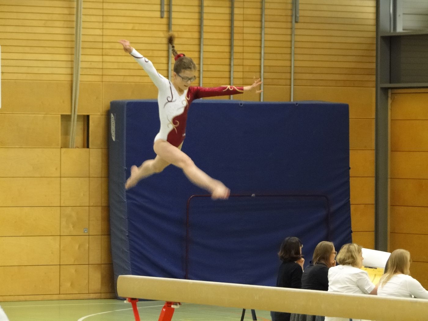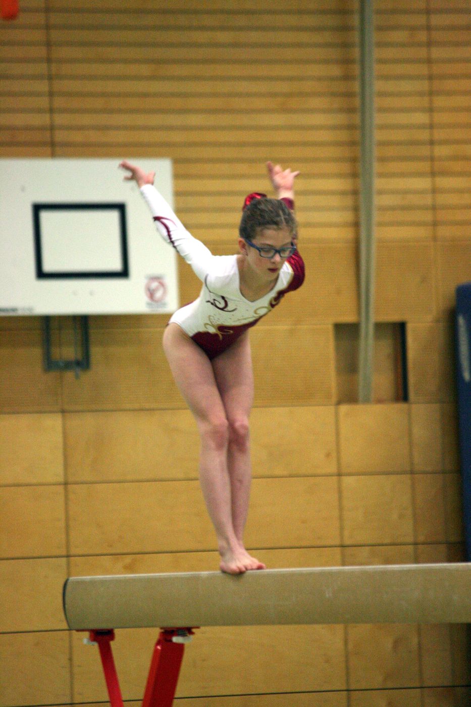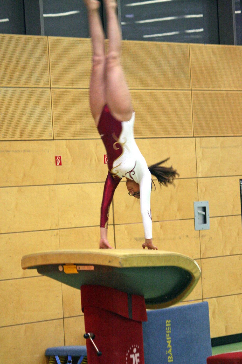 Die Sorge von Trainer und Turnerinnen gleichermaßen erwies sich jedoch als unbegründet, denn die Mädels (Natalie, Angelina, Jessica und Cecile) turnten durch die Bank sicher und mussten keinen einzigen Sturz verbuchen. Auch wenn nicht alle Elemente anerkannt wurden, konnten sich sowohl die Ausgangs- wie auch die Endwerte sehen lassen. Über zwei Punkte Vorsprung zur Konkurrenz konnte die Mannschaft an diesem Gerät herausarbeiten. Erfreulich war auch, dass Cecile zum ersten Mal ihren neu erlernten freien Überschlag mit ganzer Schraube als Abgang erfolgreich im Wettkampf präsentieren konnte.