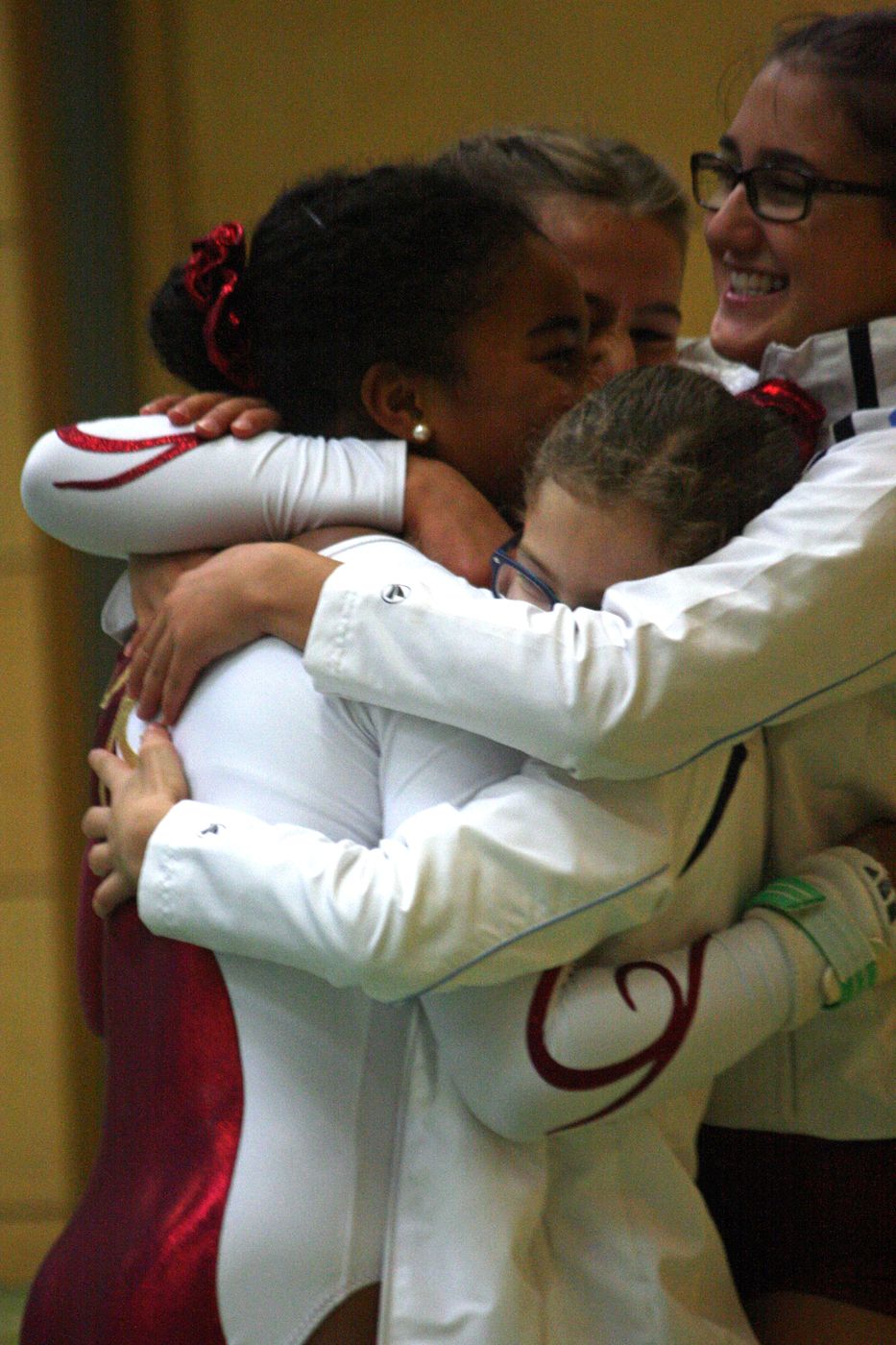 Was zu diesem Zeitpunkt noch niemand wusste und was sich erst am späten Abend herausstellen sollte war, dass sich ein Fehler in den Algorithmus der Oberliga eingeschlichen hatte und zu einer falschen Vergabe an Rankingpunkten führte. Insofern wurde die Porzer Mannschaft mit gleich vielen Rankingpunkten, aber einer geringeren Gesamtpunktzahl, auf dem zweiten Gesamtrang, und somit auf dem Relegationsplatz zur NRW-Liga aufgerufen. Die Freude mischte sich ein wenig mit dem Bewusstsein, dass im November nun doch ein weiter Wettkampf anstehen würde... Nichtdestotrotz nahmen die Mädels stolz ihre Urkunden, Medaillen und den Pokal in Empfang und freuten sich über den Applaus, denn dass die Mannschaft aus dem Nichts den Sprung aufs Treppchen schaffen würde, damit hatten wohl die Wenigsten in der Halle gerechnet ?. Dass sich die Mädchen nach ihrem herausragenden dritten Wettkampf sogar Sieger der Oberliga 2016 nennen dürfen, ist ihnen zum Zeitpunkt des Verfassens noch nicht bekannt. Um ein wenig wettzumachen, dass die Mädels um ihren “Ruhm” gebracht wurden, planen die Trainerinnen eine kleine Extrasiegerehrung, damit die Mädels die tolle Nachricht auch gemeinsam als Team zu hören bekommen.