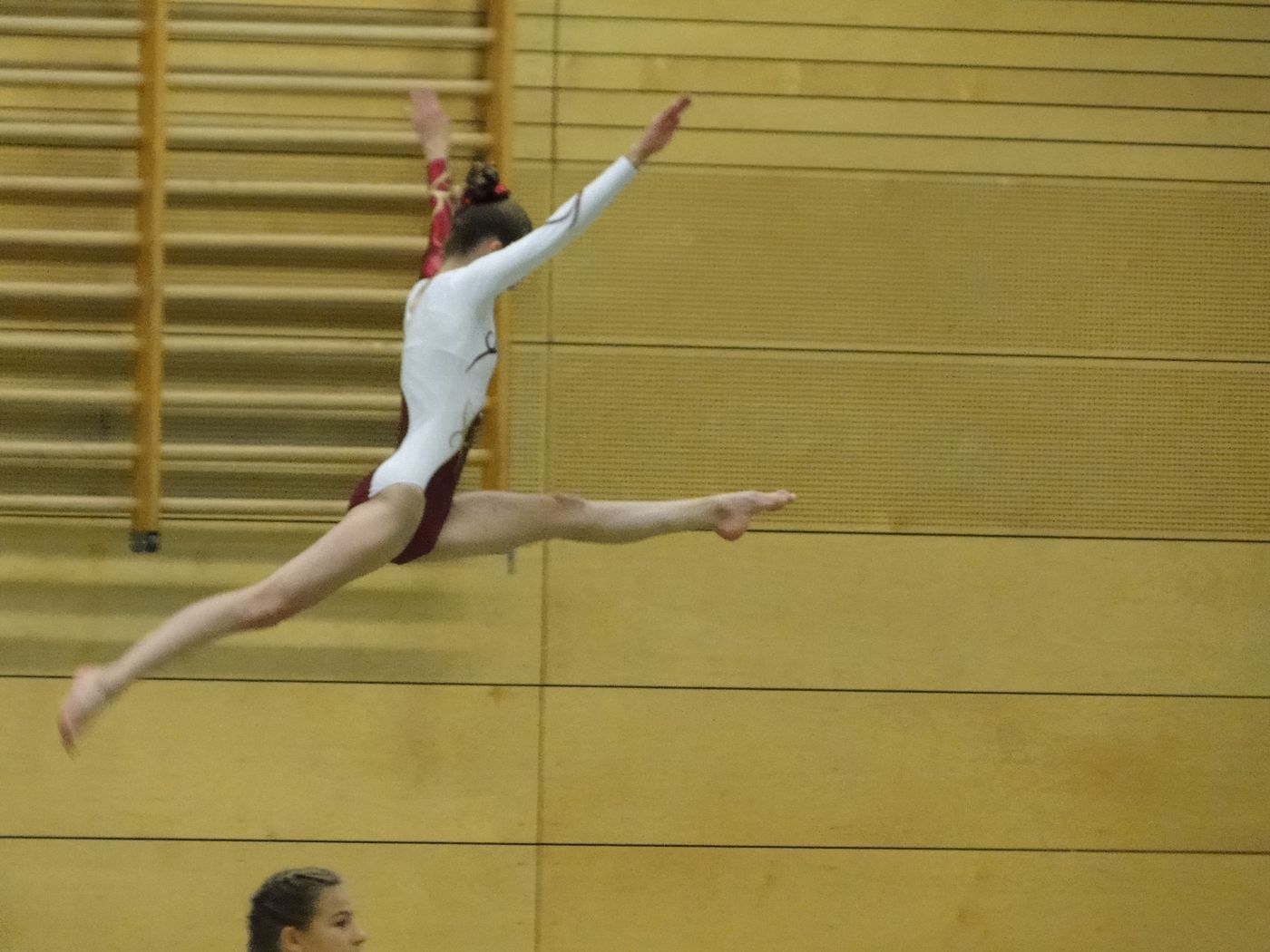 Gut motiviert ging es für die Mädels an den Boden und auch hier ließen sie sich nicht lumpen. Sie zeigten saubere und ausdrucksvolle Übungen mit vollen Anforderungen. Maria und Jessica zeigten beide eine Temposalto-Salto Verbindung während Pauline und Cecile jeweils einen Strecksalto mit halber Schraube im Angebot hatten, den Pauline leider auf den Hosenboden setzte. Nichtsdestotrotz konnte sie 13 Punkte mitnehmen. Cecile hatte dank ihrer vielen hochwertigen Sprünge einen sensationellen Ausgangswert von 6,5 Punkten, den höchsten der Konkurrenz. Der TSV Porz belegte an diesem Gerät mit nur einem Zehntelchen Rückstand den zweiten Rang.