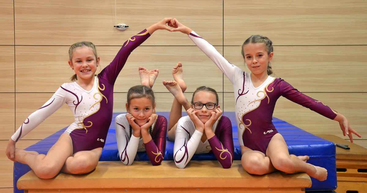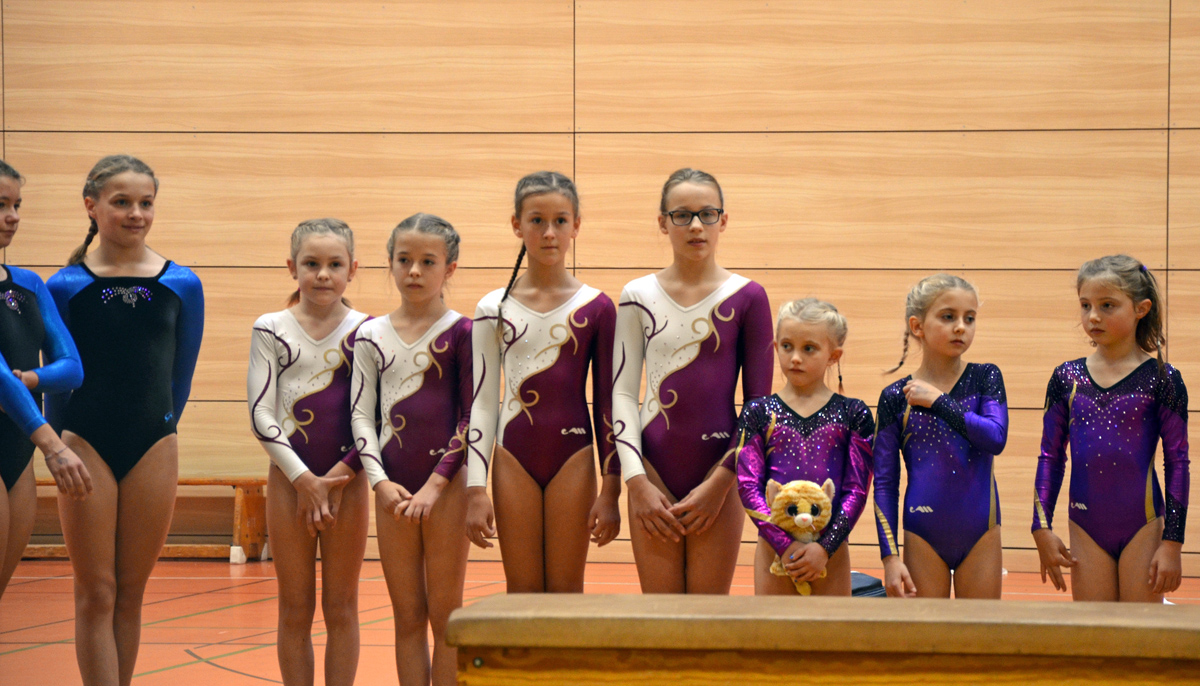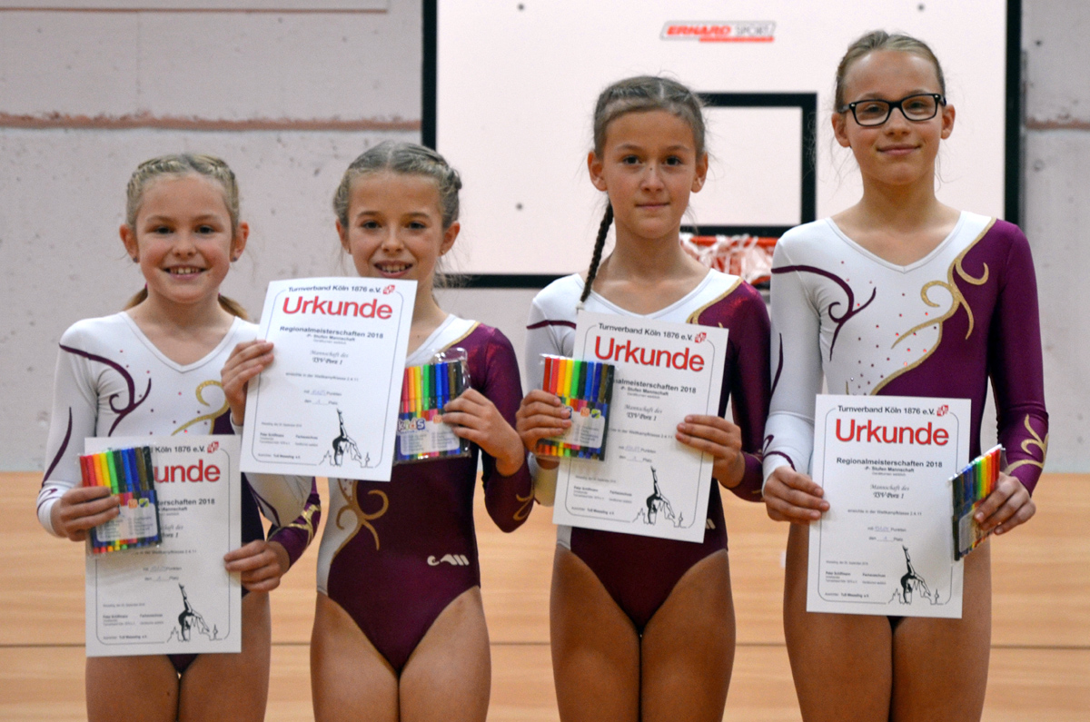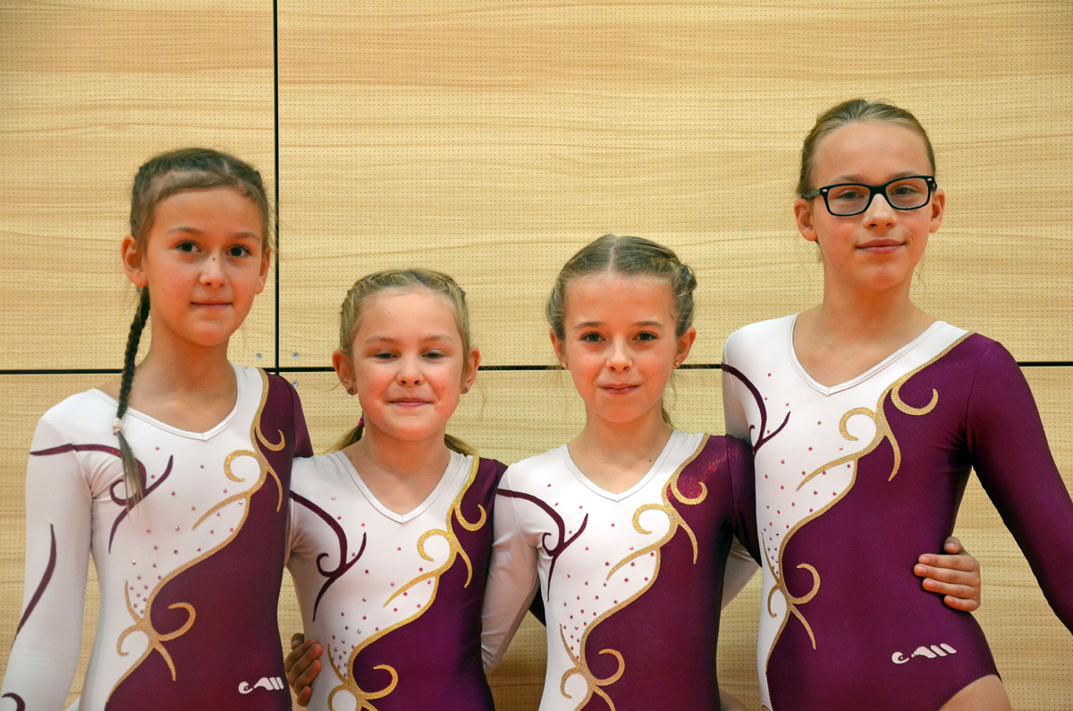 Vom Erfolg ihrer älteren Vereinskameraden beflügelt, traten im Anschluss die jüngeren Mädchen des TSV Porz in der Altersklasse 2007/2008 gegen neun konkurrierende Mannschaften an. Julia Korn, Celina Neumann, Veronica Schäfer und Charlotte Liesenfeld starteten an Barren, an dem leider nicht alles einwandfrei gelang und so unnötige Punkteinbußen hingenommen werden mussten. Weiter ging es zum Balken, an dem solide, aber nicht herausragende Übungen gezeigt wurden, so dass um die Qualifikation gezittert werden musste. An Boden und Sprung drehten dann alle vier Mädchen noch mal richtig auf und konnten wichtige Punkte einfahren, so dass es am Ende des Wettkampfs - zur freudigen Überraschung von Turnerinnen und Trainerin - für den obersten Treppchenplatz reichte!