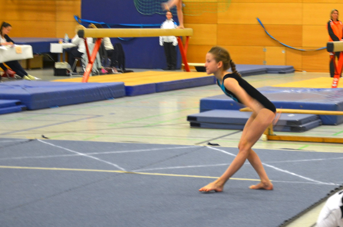 Nach einem bisher sehr gelungenem Wettkampf, hieß es nun am Balken die Nerven behalten und nicht zu stürzen. Während es beim Einturnen noch etwas durchwachsen aussah, konnten die Mädels beim Wettkampf dann doch auf ihre inzwischen recht beachtliche Wettkampferfahrung zurückgreifen, und sehr gute Übungen präsentieren. Besonders Tanin, die zu Wettkampfbeginn noch mit Kopfschmerzen zu kämpfen hatte und dem Balken in der Regel gehörigen Respekt entgegenbringt, konnte hier mit erfreulich verbesserten Sprüngen überraschen und 16 Punkte einheimsen. Maria verwackelte leider, wie schon bei einigen Wettkämpfen, ihre Standwaage, konnte aber dank einer sonst sehr sauberen Übung ebenfalls eine tolle Wertung von 16,05 zu ihren Gesamtpunkten addieren. Natalie zeigte dann eine nahezu ideale Übung die ihr super 16,55 Punkte und ihre zweite Höchstwertung einbrachte. Die unerfahrene Olivia turnte ihre Übung ein bisschen unsicher und bekam den Strecksprung mit einer Halbedrehung nicht anerkannt.