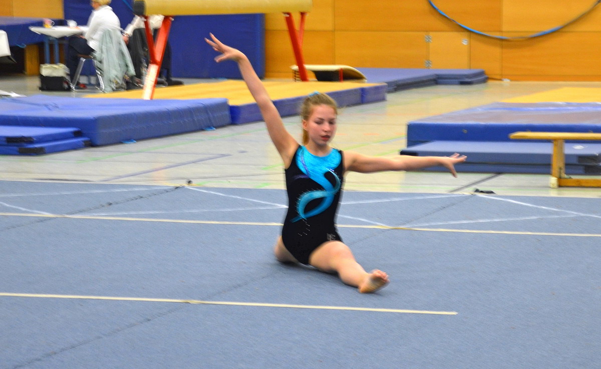 Die Mädchen der AK 14/15 Jahre begannen ihren Wettkampf ebenfalls am Boden. Für Pauline, die dieses Jahr erstmalig die P8 zeigen sollte, gab es direkt zu Anfang die unerfreuliche Nachricht, dass die CD mit der Musik auf der bereitgestellten Musikanlage nicht abspielbar war. So musste sie ihre Übung leider ohne Musikbegleitung präsentieren. Nichtsdestotrotz zeigte sie eine ansprechende Übung mit ordentlichen Flick-Flacks, die mit tollen 17,30 Punkten und der Höchstwertung an diesem Gerät honoriert wurde.