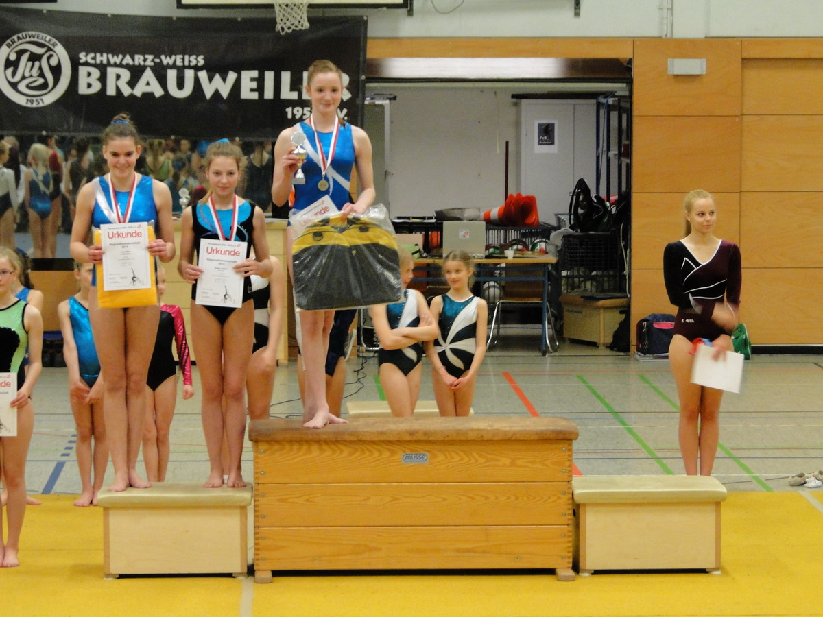 Nach einem derart erfreulich verlaufenen Wettkampf, konnten die Mädchen gut gelaunt der Siegerehrung entgegensehen. Im 40-turnerinnen starken Teilnehmerfeld konnte sich Olivia bei ihren ersten Regionalmeisterschaften auf einem guten 28. Rang platzieren. Tanin erreichte mit dem 7.Platz erstmalig die Qualifikation zur Verbandsgruppenausscheidung, und Maria und Natalie konnten sich am Ende des Wettkampfes über die Silber-und Goldmedaille und damit den Vize- und Regionalmeistertitel freuen.