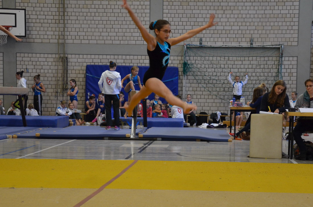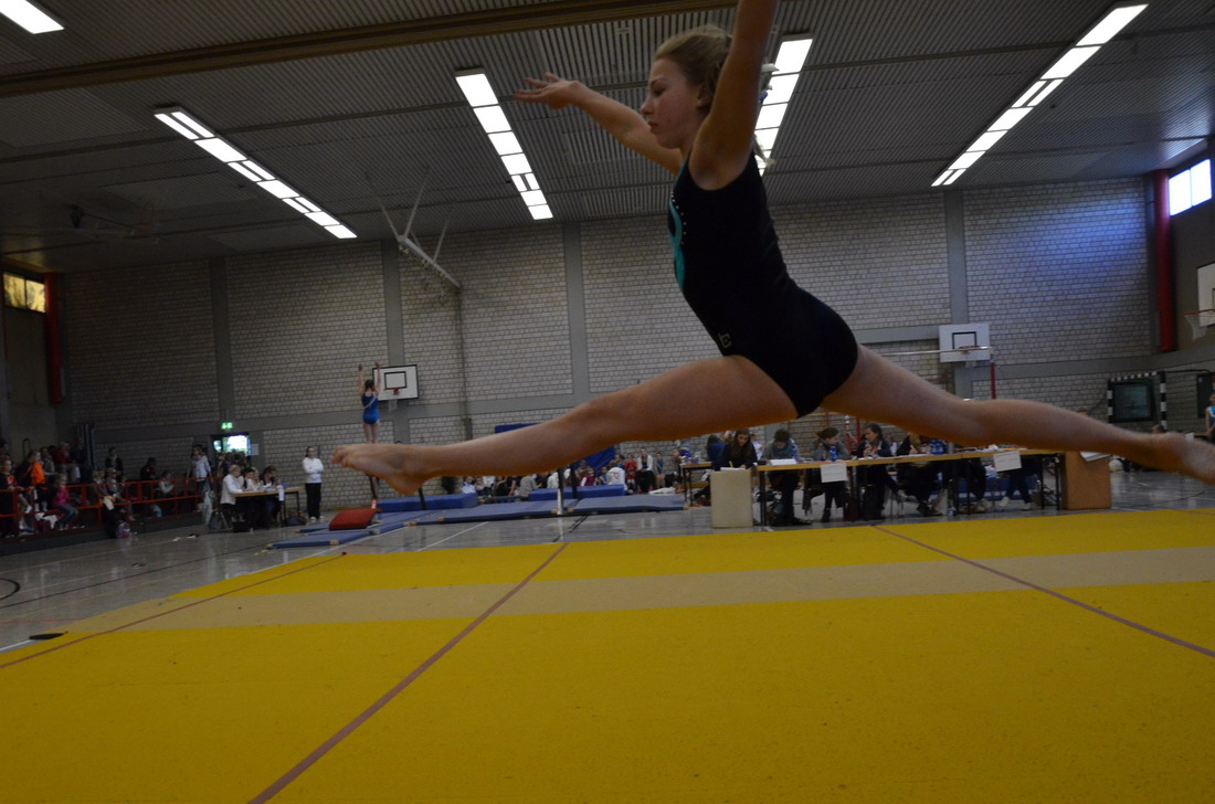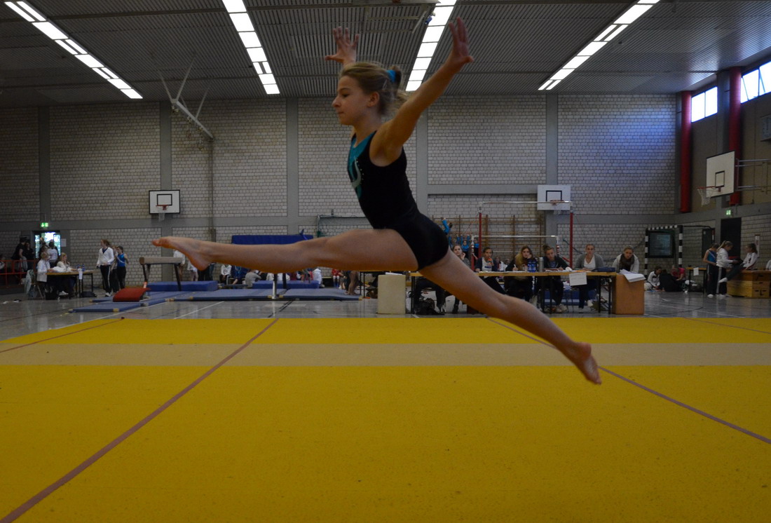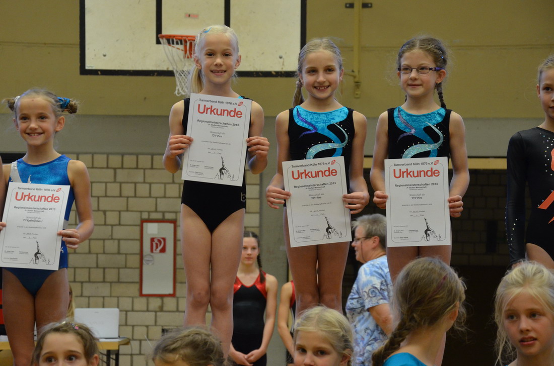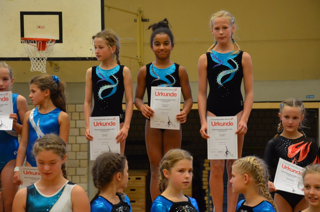 Den Anfang machten die Jüngsten im Jahrgang 2004/2005. Maria Moisseyenko, Angelina Kann und Annika Mundt wussten, dass sie sich keinen Patzer erlauben durften, um Chancen auf einen vorderen Podestplatz und damit die Qualifikation zur nächsten Runde auf Verbandsebene zu haben, denn alle Wertungen würden in das Endergebnis einfließen. Entsprechend nervös, aber auch motiviert gingen sie zu Werke und kamen tatsächlich ohne größere Fehler und Unsicherheiten durch. Annika und Angelina teilten sich die Tageshöchstnoten, indem jede an 2 Geräten die beste Wertung erzielte, jedes Mal ganz dicht gefolgt von Maria. So wurde das Mini-Team mit deutlichem Abstand vor dem TV Rodenkirchen und dem TuS Brauweiler Regionalmeister.