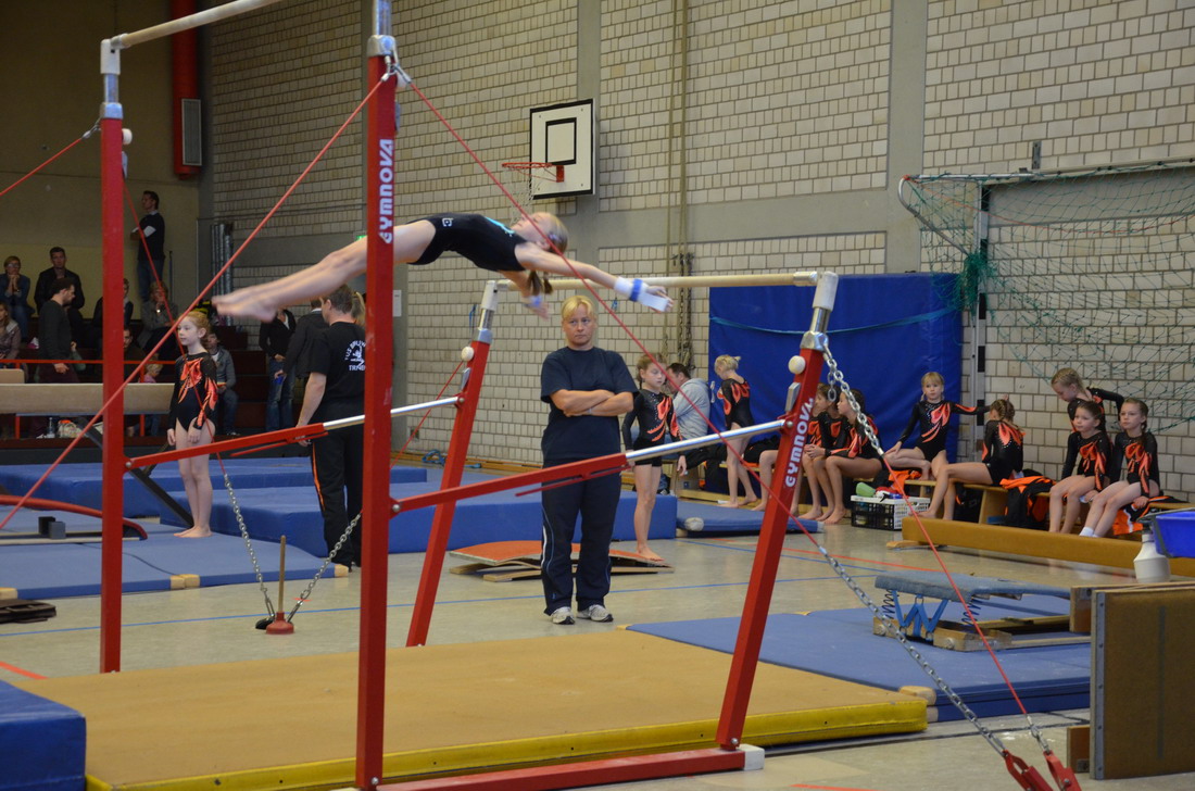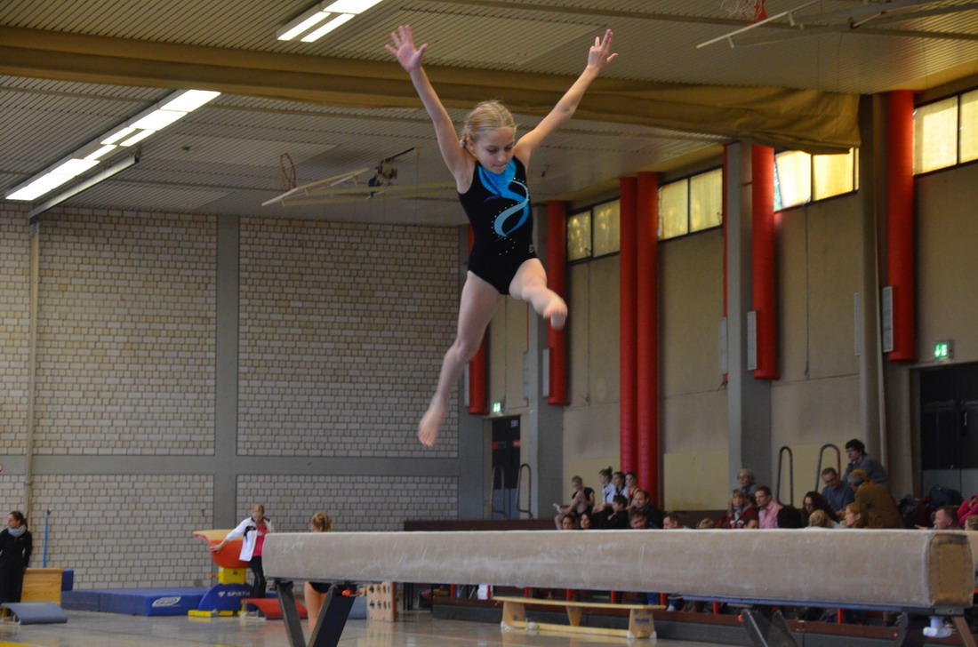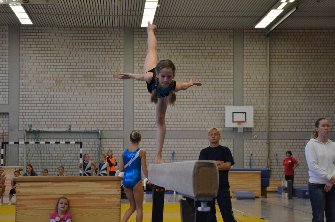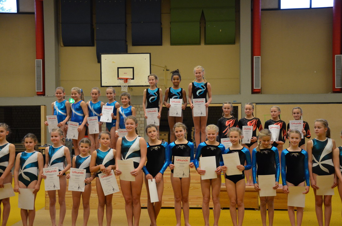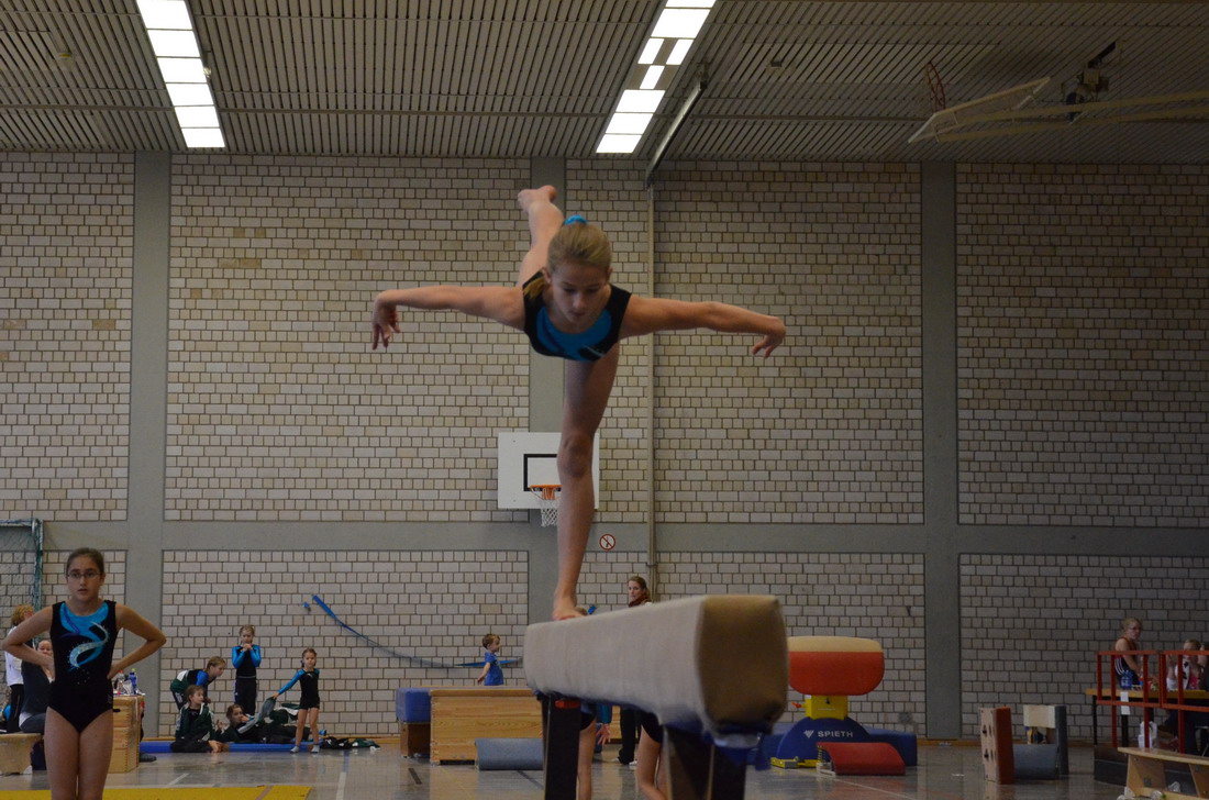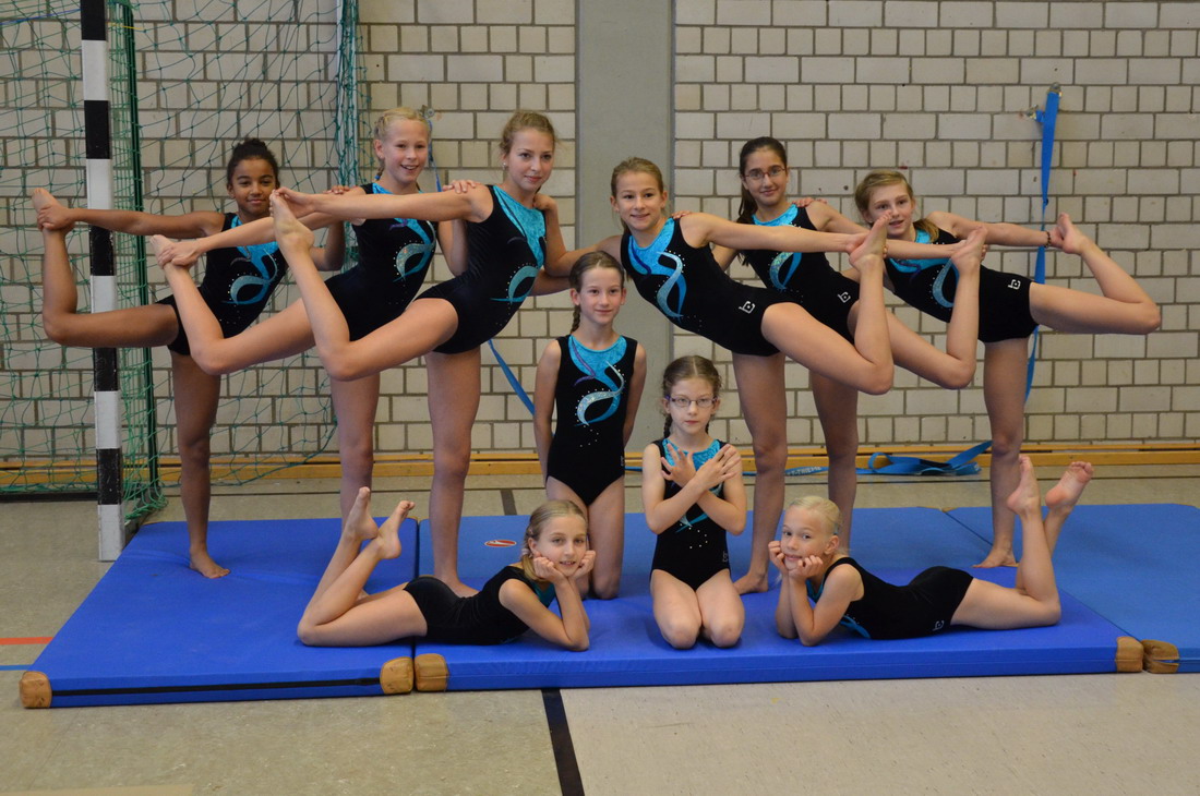 Den Anfang machten die Jüngsten im Jahrgang 2004/2005. Maria Moisseyenko, Angelina Kann und Annika Mundt wussten, dass sie sich keinen Patzer erlauben durften, um Chancen auf einen vorderen Podestplatz und damit die Qualifikation zur nächsten Runde auf Verbandsebene zu haben, denn alle Wertungen würden in das Endergebnis einfließen. Entsprechend nervös, aber auch motiviert gingen sie zu Werke und kamen tatsächlich ohne größere Fehler und Unsicherheiten durch. Annika und Angelina teilten sich die Tageshöchstnoten, indem jede an 2 Geräten die beste Wertung erzielte, jedes Mal ganz dicht gefolgt von Maria. So wurde das Mini-Team mit deutlichem Abstand vor dem TV Rodenkirchen und dem TuS Brauweiler Regionalmeister.