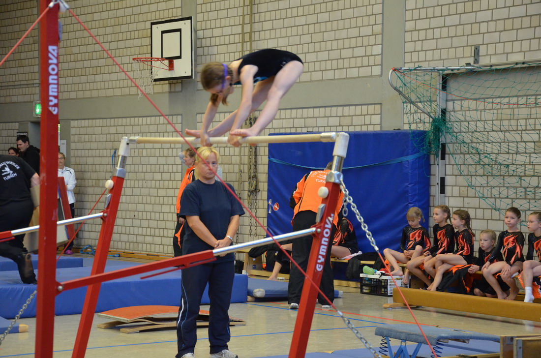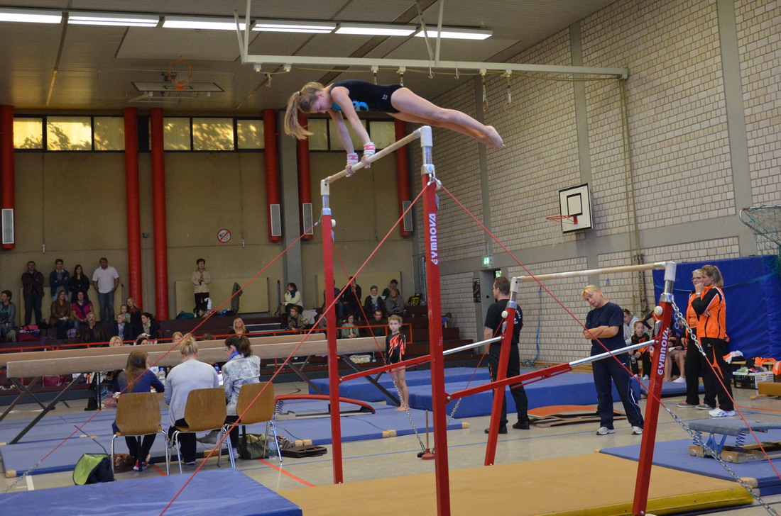 Die ältesten Porzer Turnerinnen (Jahrgang 2000/01) konnten besetzungsmäßig aus den Vollen schöpfen. Pauline Friedrich, Anna Kulbach, Sarah Shirvani Zadeh, Jessica Haelke und Fenja-Sofie Frey standen nun unter Erwartungsdruck. Das schien ihnen wenig auszumachen, denn bereits nach dem ersten Gerät ließen sie erahnen, wohin die Reise gehen sollte. Die Höchstwertungen an allen Geräten gingen wieder nach Porz. Jessica zeigte den besten Sprung, Pauline blieb an Barren und Balken ungeschlagen, und Sarah bekam am Boden die meisten Punkte des Wettkampfes. So hatte das Team letztendlich über 12 Punkte Vorsprung zum Zweitplatzierten aus Rodenkirchen, während diesmal der dritte Platz an den TV Kierdorf ging.